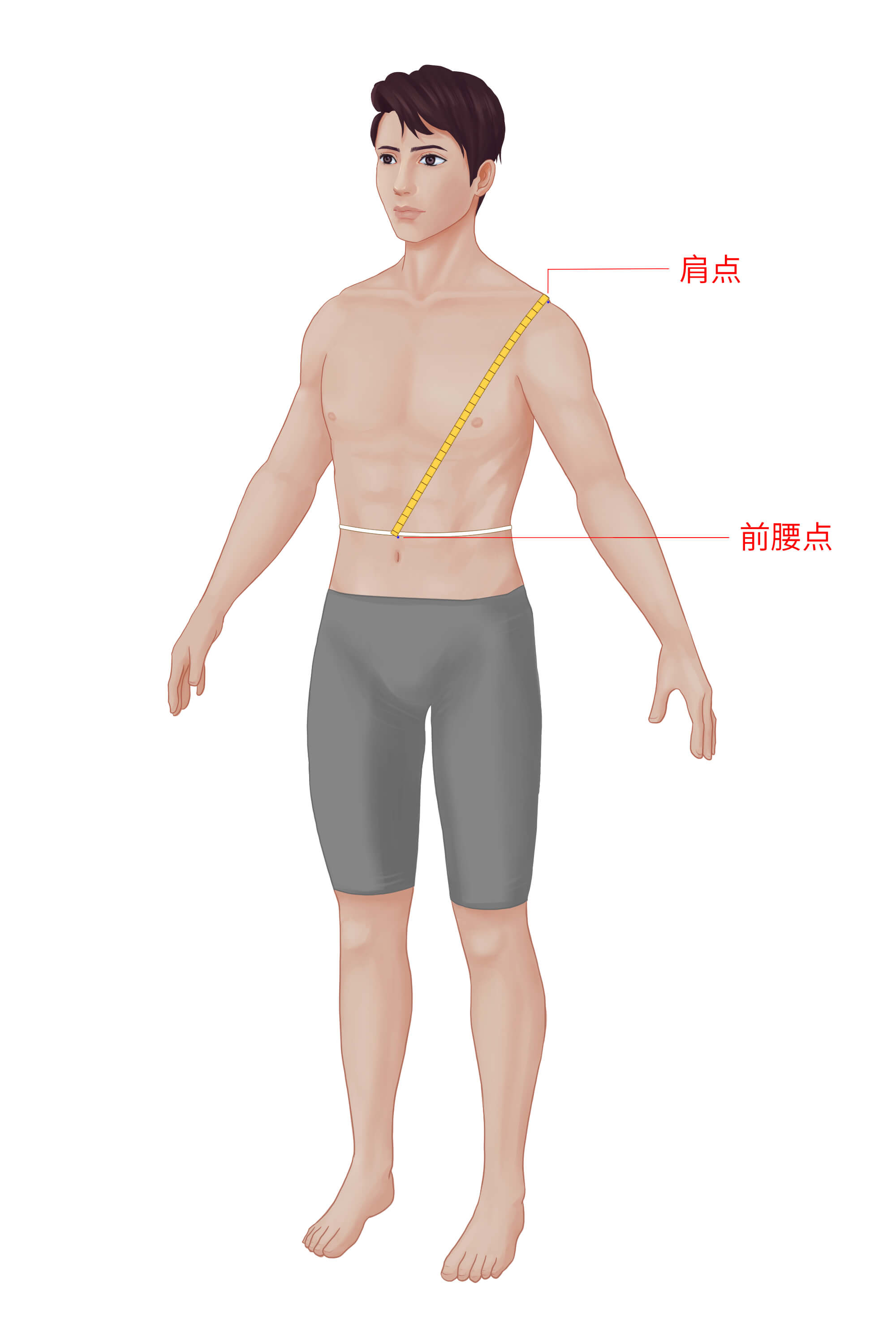被测者站直,头部要保持脸朝正前方的姿势,把软尺从后腰点拉到肩点,再继续拉到前腰点,软尺在肩点的读数为后肩斜长,软尺在前腰点的读数为前后肩斜长,前后肩斜长减去后肩斜长为前肩斜长。
