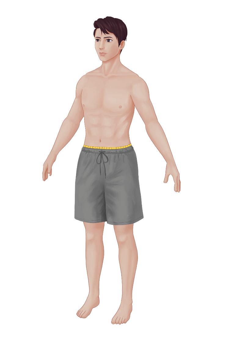 被测量者穿着一条深裆、宽松、裤腰松紧适度的松紧带运动裤或者睡裤,后裤腰口穿在后腰髋骨上缘位置,前裤腰口根据喜好穿在平齐或低于后裤腰口水平的位置,测量者用软尺沿着裤腰口,绕腰部一周测量裤腰围。注意:1、测量裤腰围时,被测量者可以按自己的裤腰穿着松紧喜好,决定软尺是否要收紧以及收紧的程度。2、被测量者可以按自己的穿着需求决定是否穿着上衣或穿着什么上衣来测量裤腰围,例如,要购买扎在上衣外的下装时,可穿着相应的上衣并扎进裤腰里测量裤腰围。每次购买下装前,都要注意检查裤腰围量身数据是否符合穿着需求,并修改不符合需求的裤腰围量身数据。