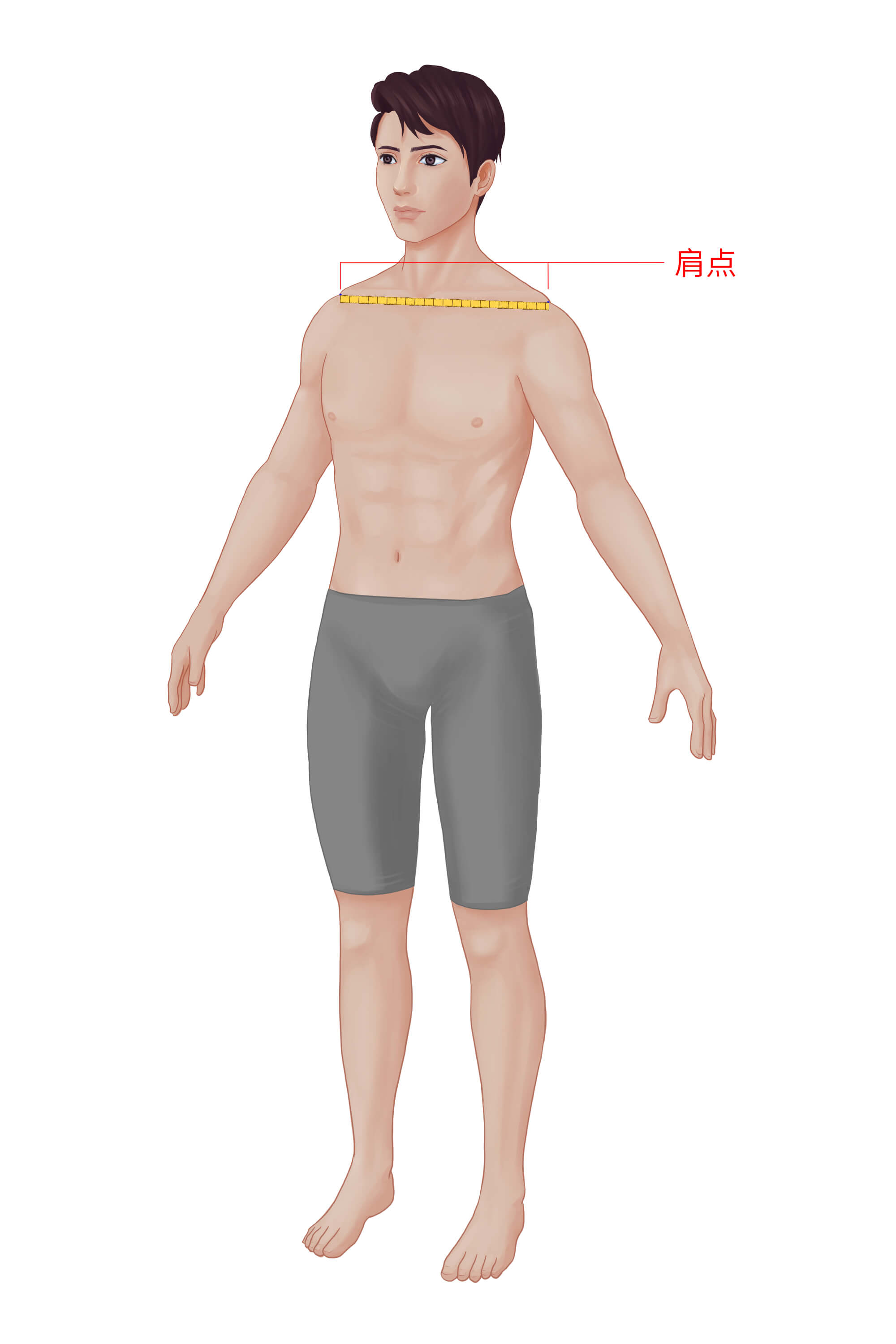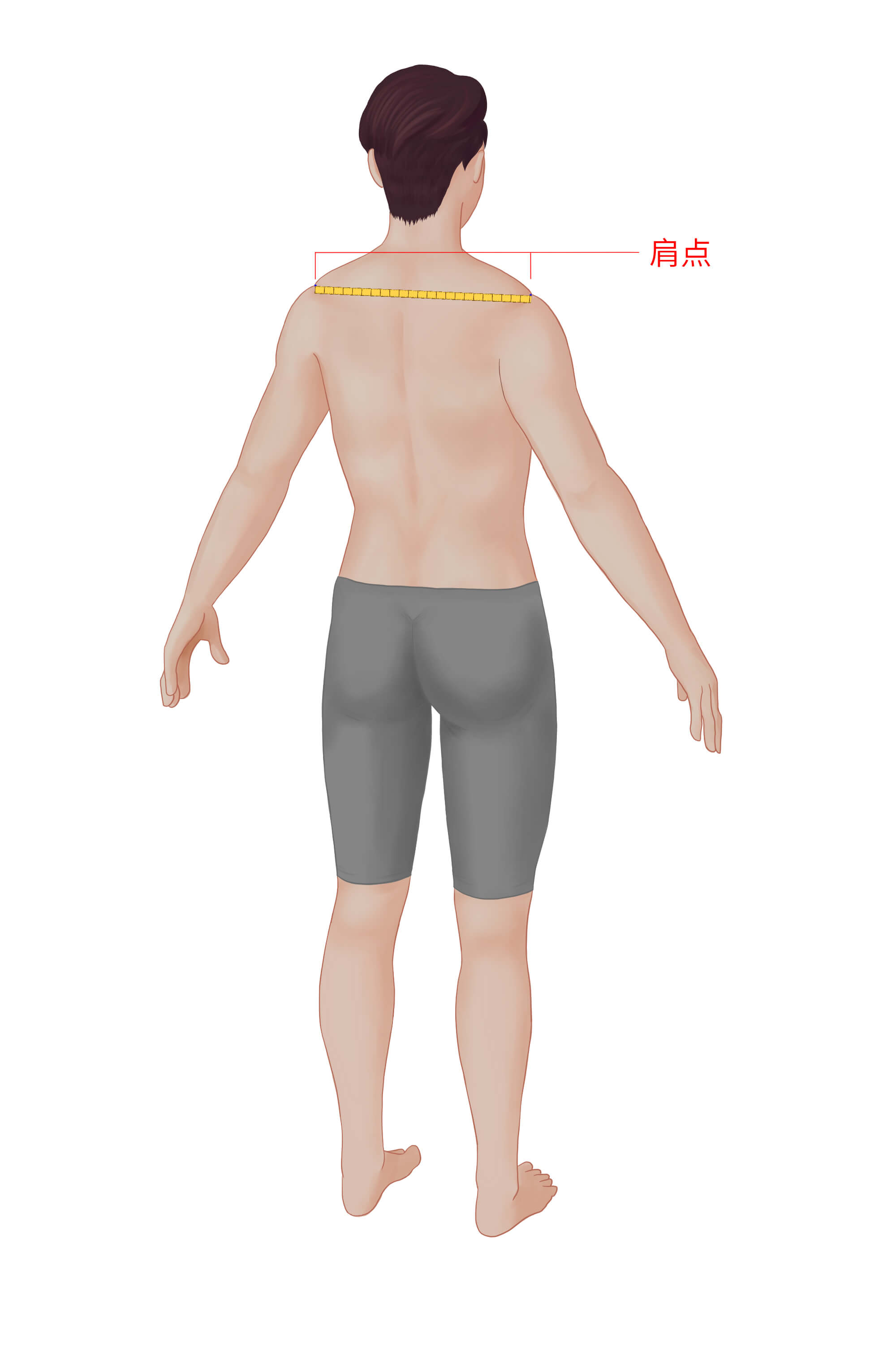 被测量者站直,在被测量者背面,用软尺,从左肩点贴着背部,水平拉到右肩点,测量后肩宽。(从左开始或从右开始都可以)
