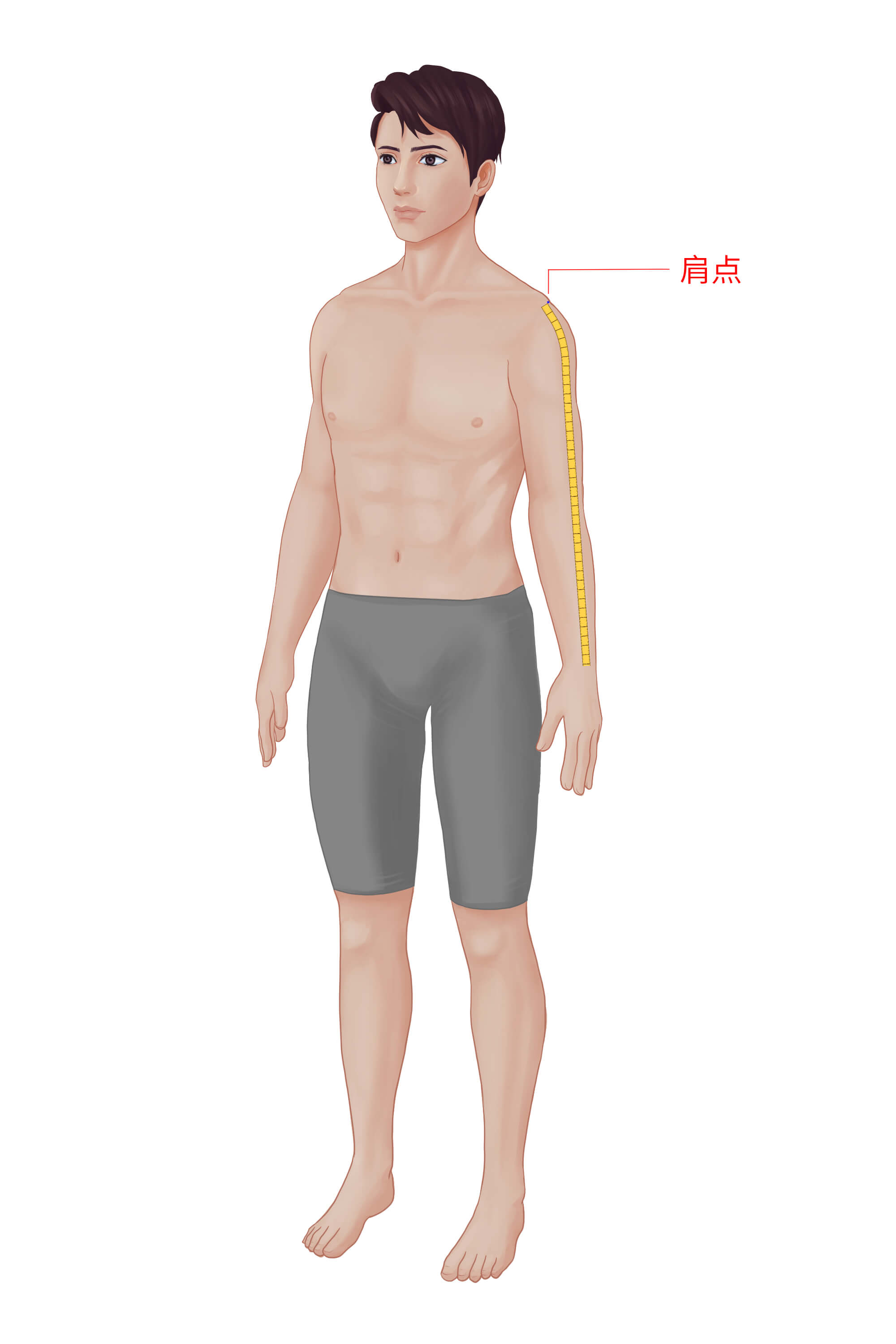 被测量者手臂下垂,从肩点顺着上臂到肘关节折纹平齐处,测量上臂长。