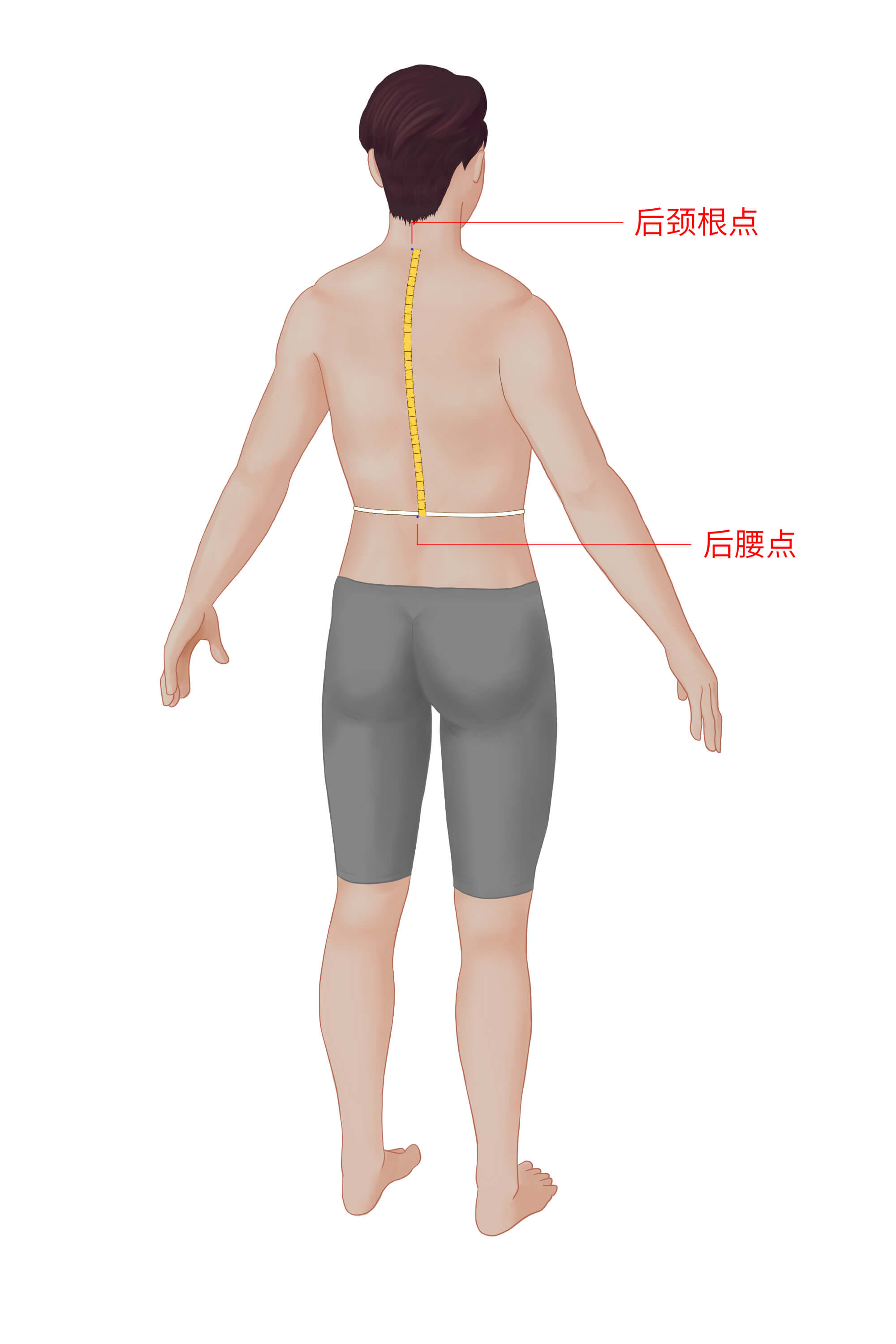 被测量者站直,头部保持脸朝正前方的姿势,从后颈根点到后腰点,测量背长。
