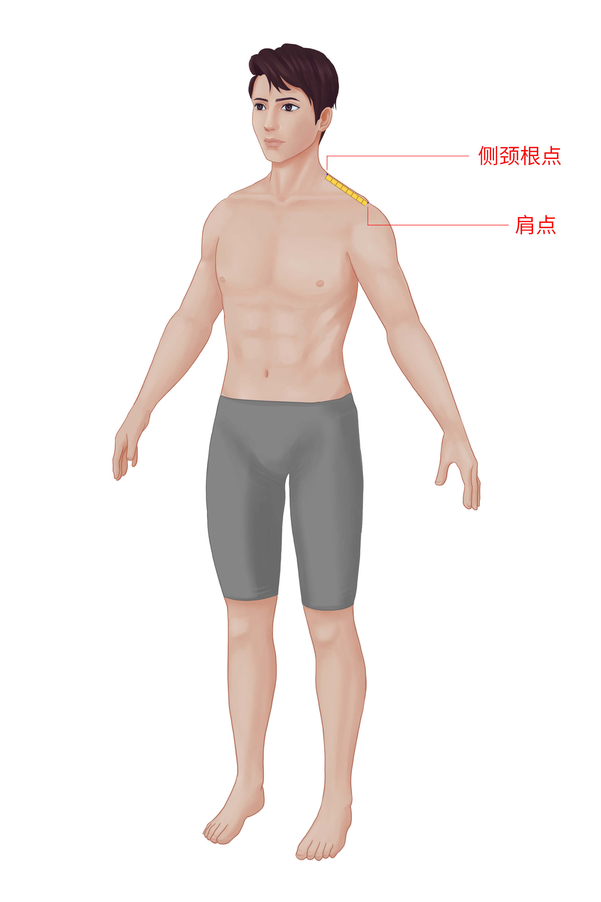 在被测量者一侧肩膀上,用软尺,从侧颈根点贴着肩部拉到同侧肩点,测量小肩长。