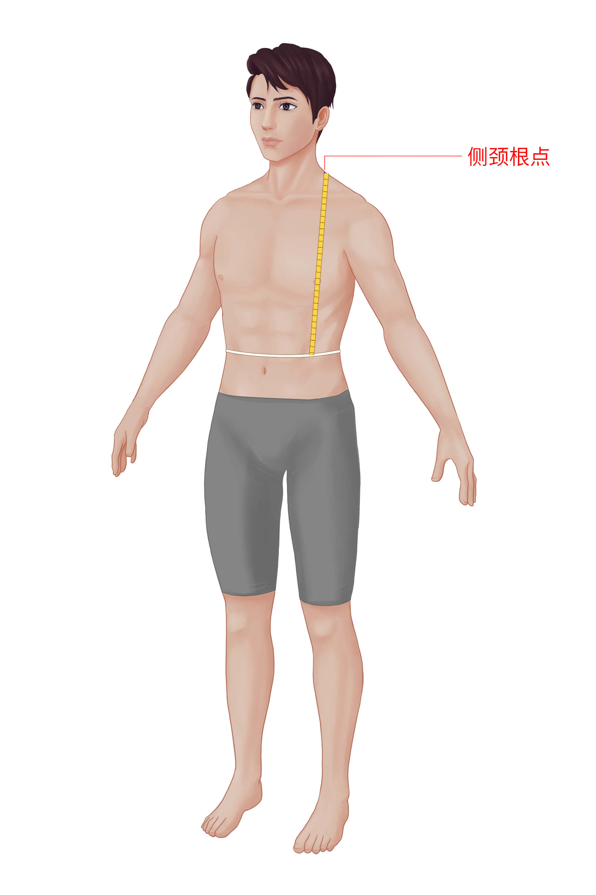 被测量者站直,头部保持脸朝正前方的姿势,用软尺,从侧颈根点直下到腰围松紧带,测量前长。