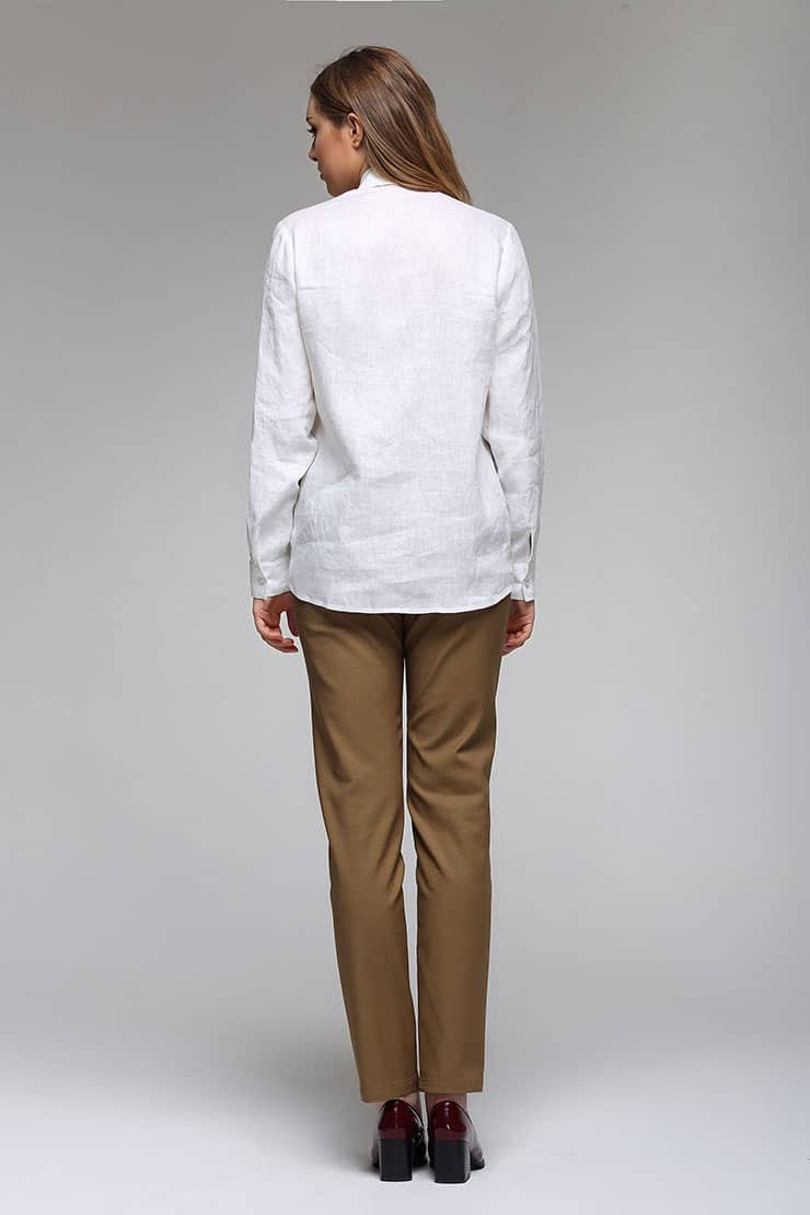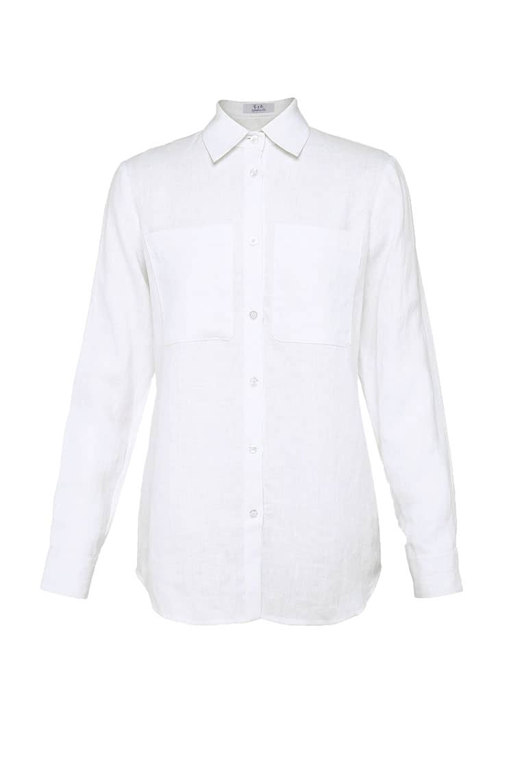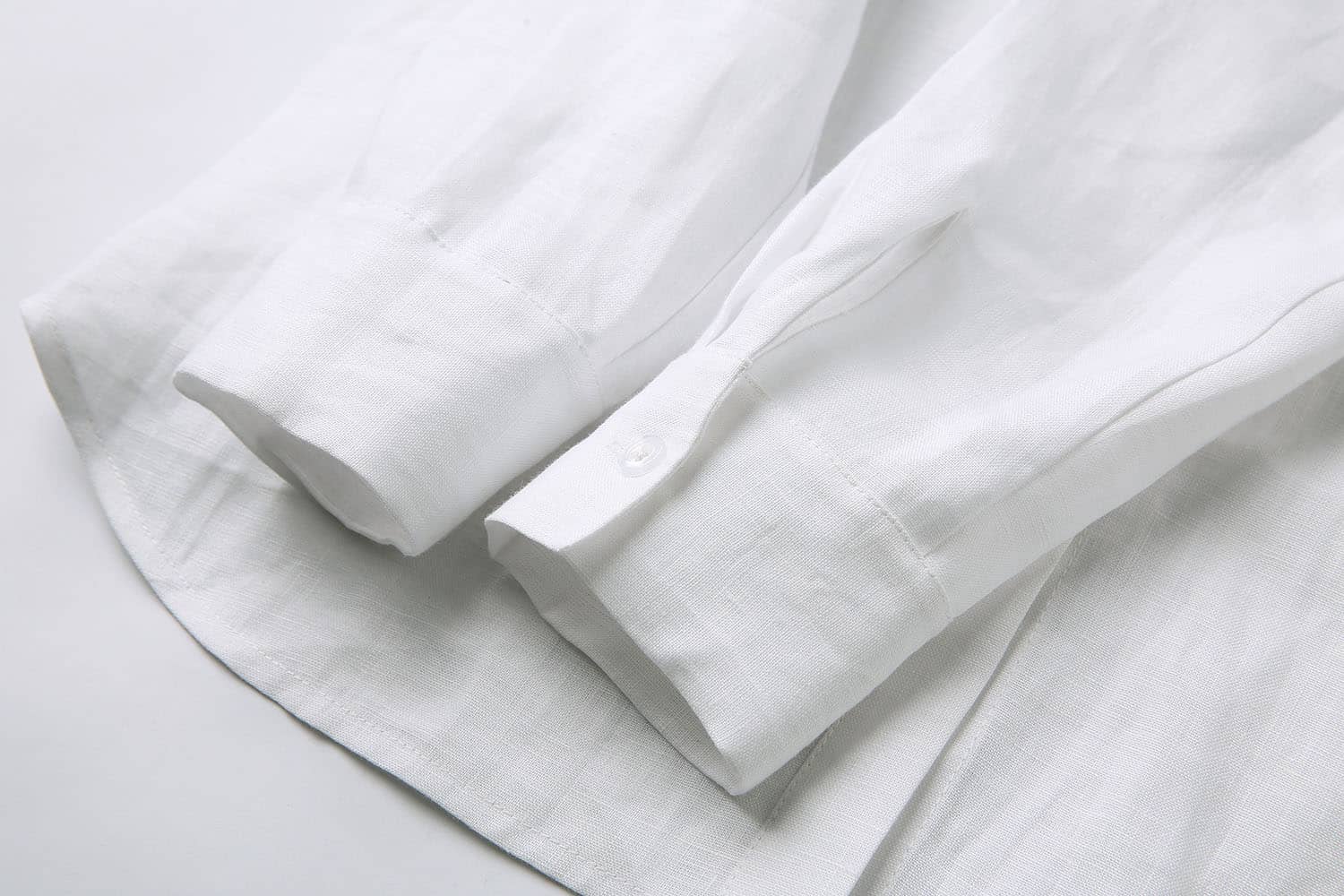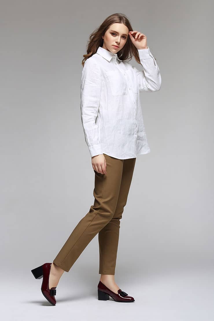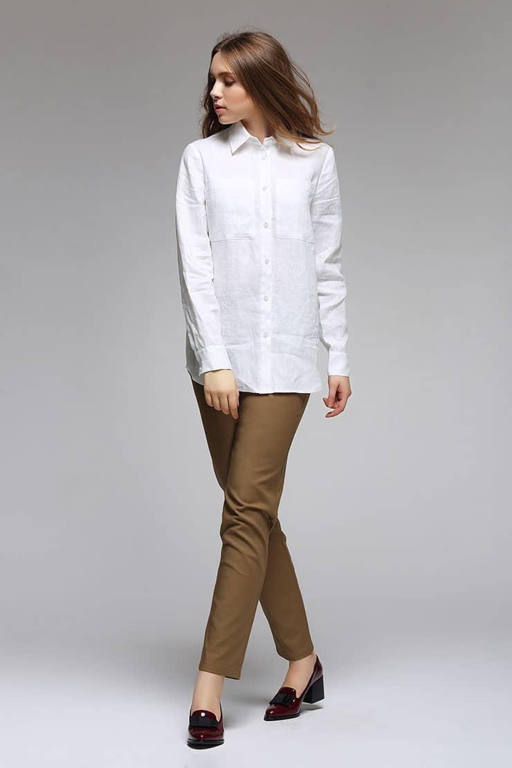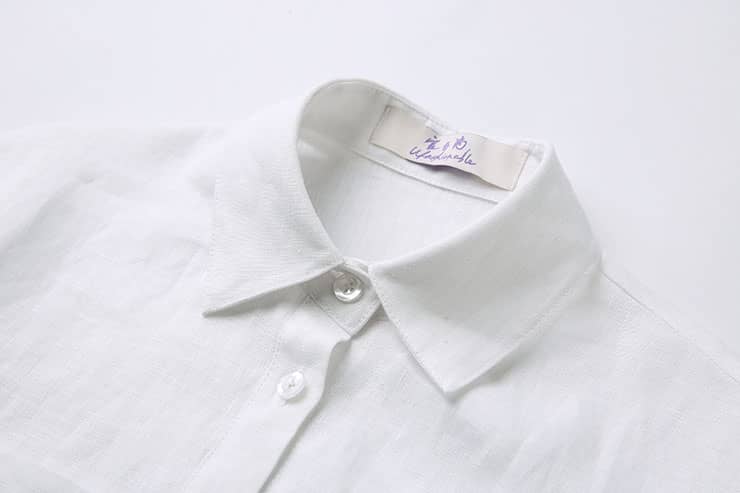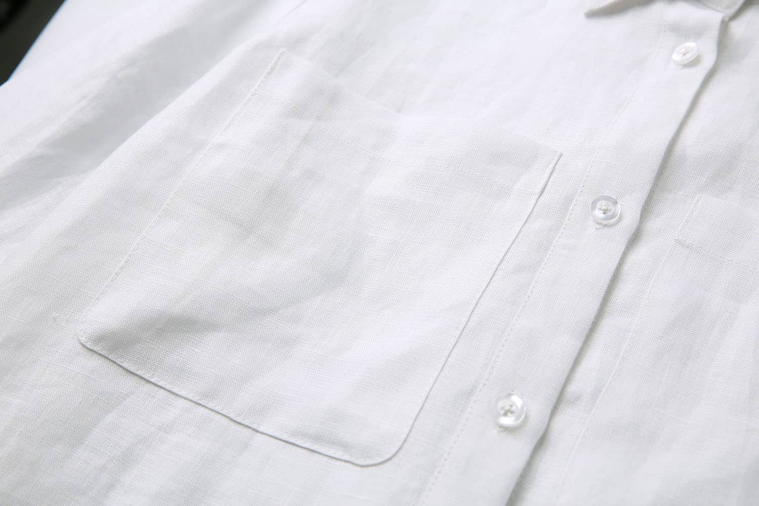 天然亚麻中长款衬衫,宽松的版型,翻领,顺直的衣襟,圆弧下摆,两个大贴袋,干净利落。