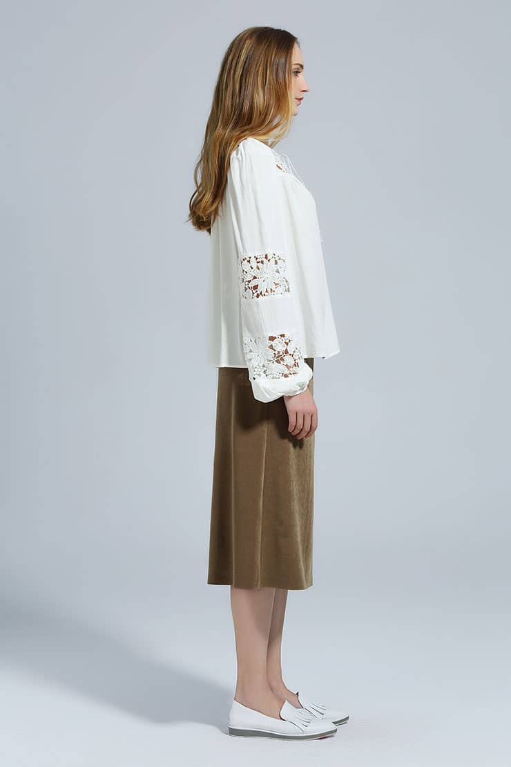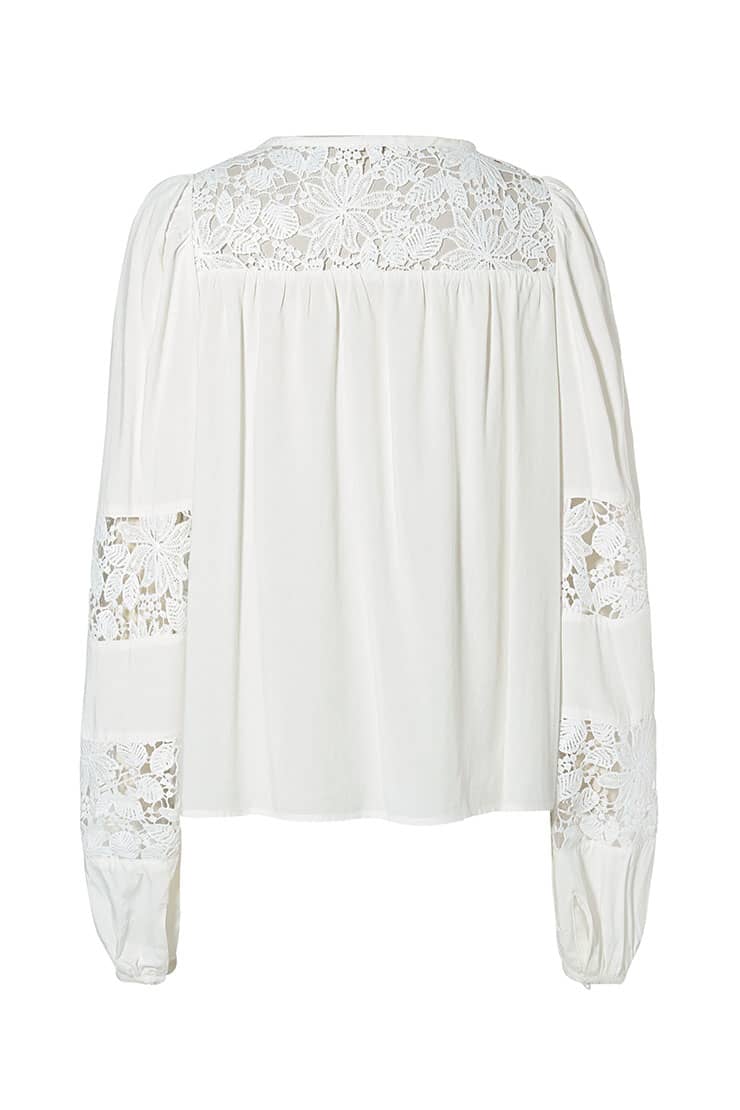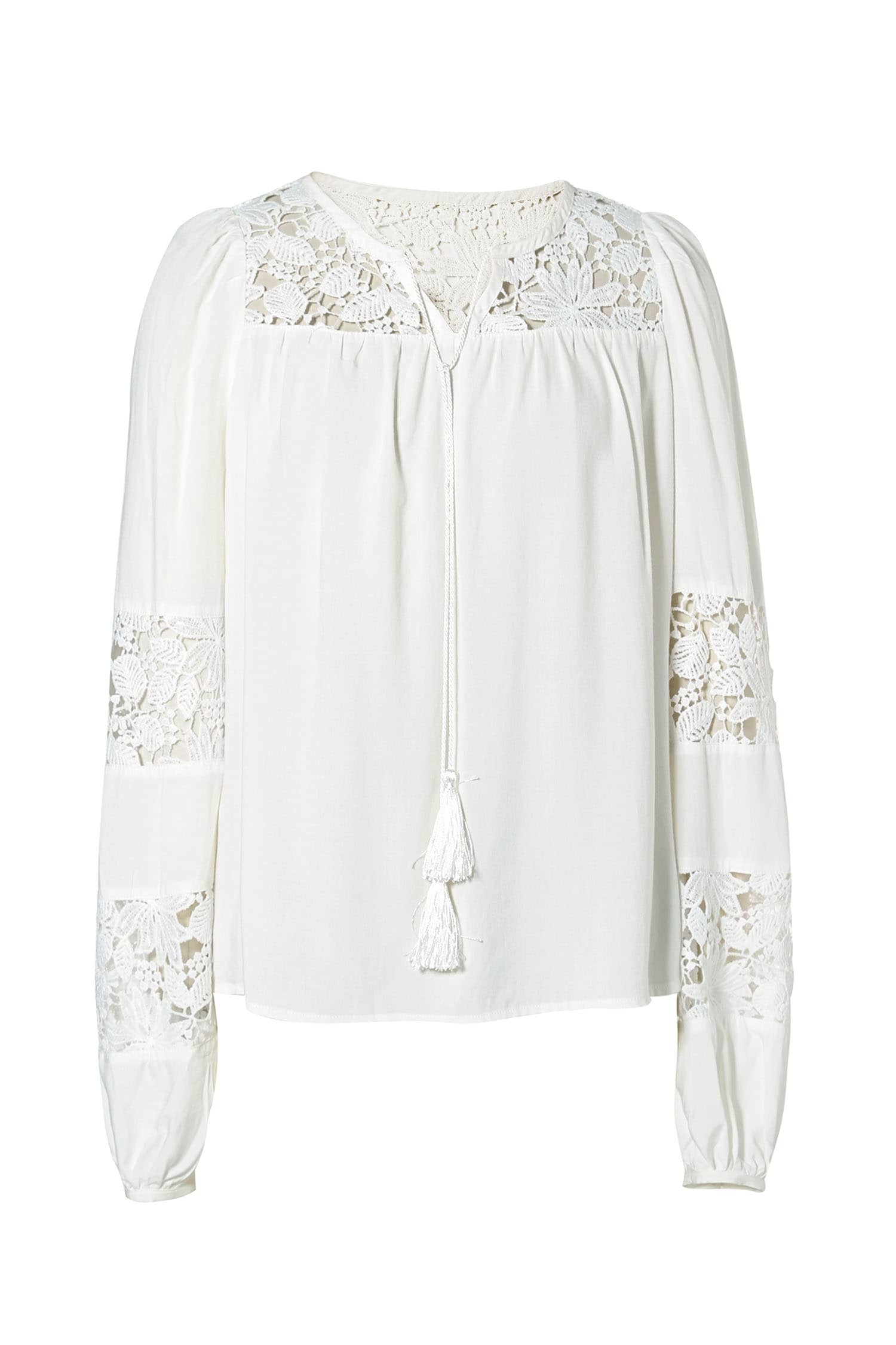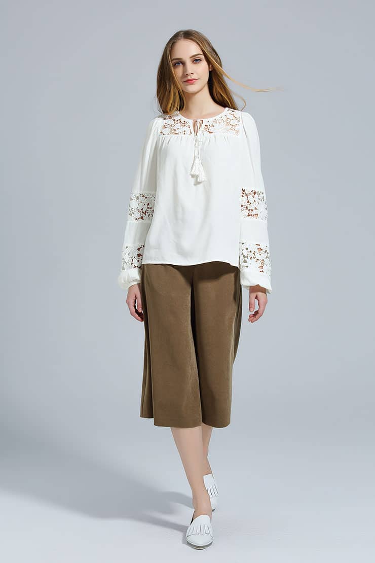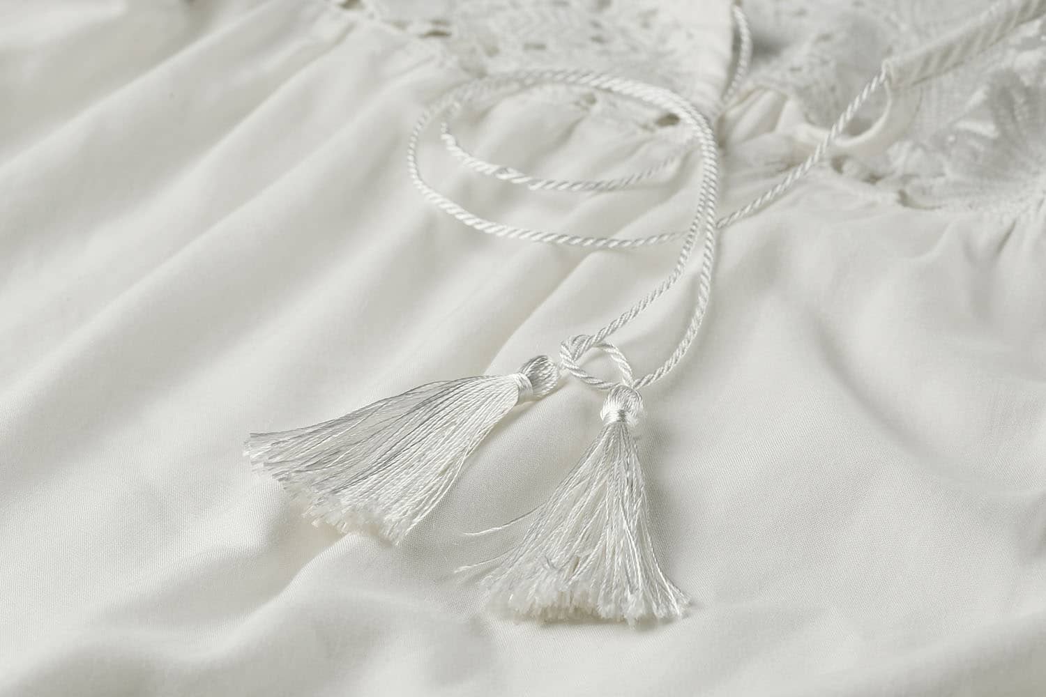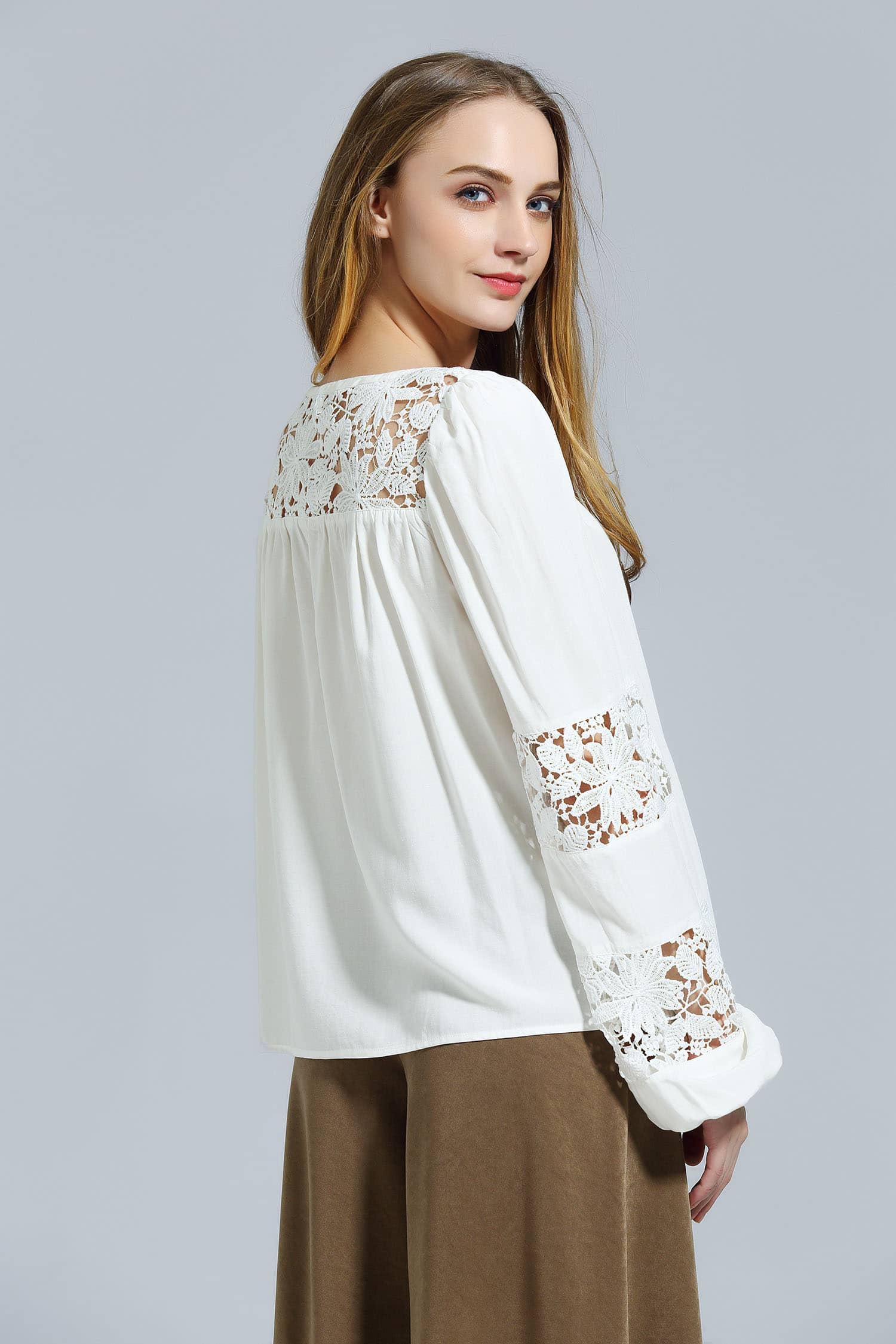 优质的人棉,镂空蕾丝拼接,圆领内穿绳系带设计,衣身及袖口大量抽碎褶,带来强烈的视觉层次感,清新可爱,优雅精致。