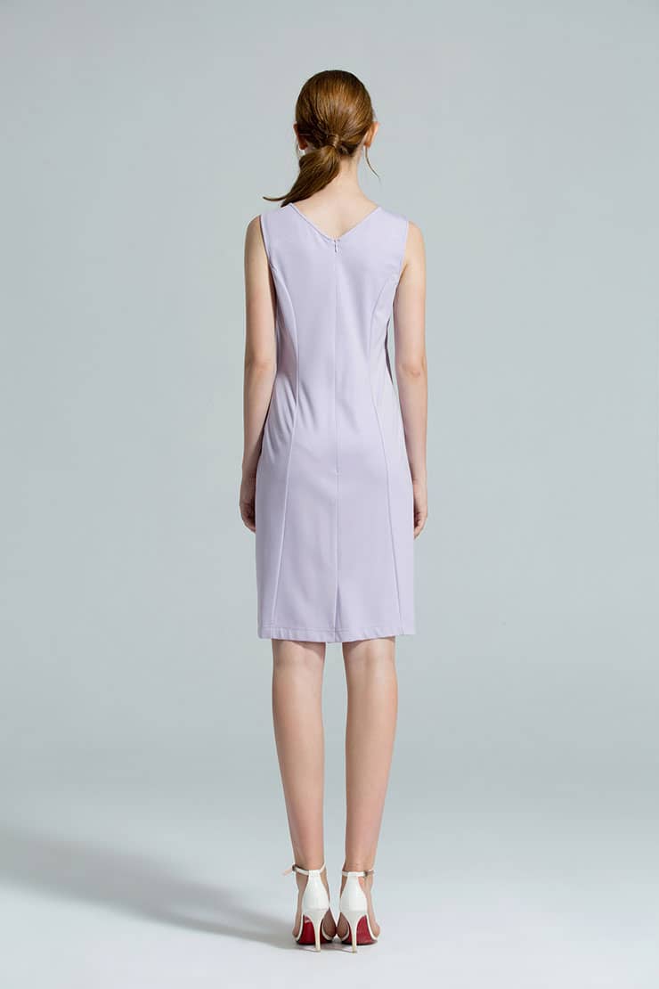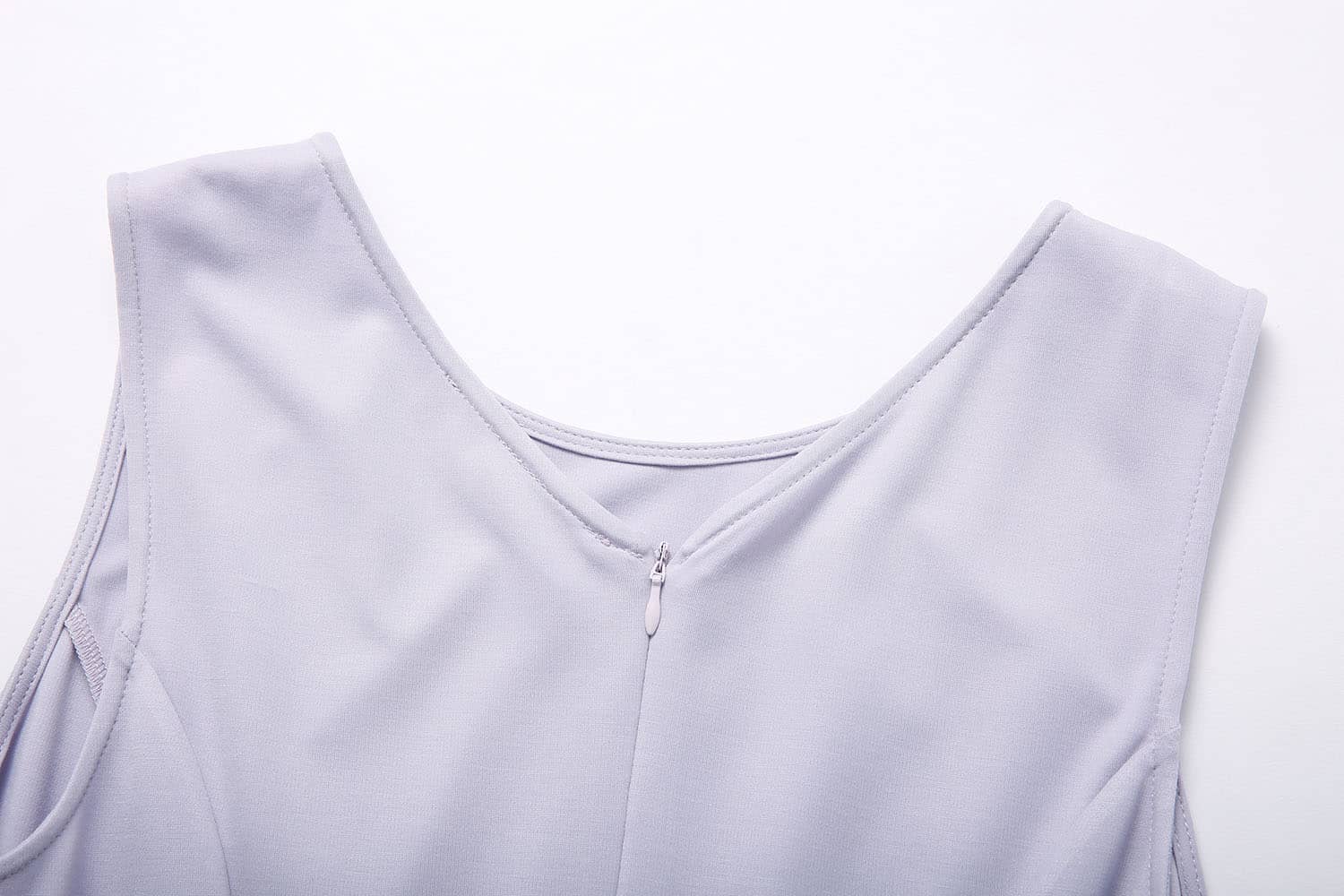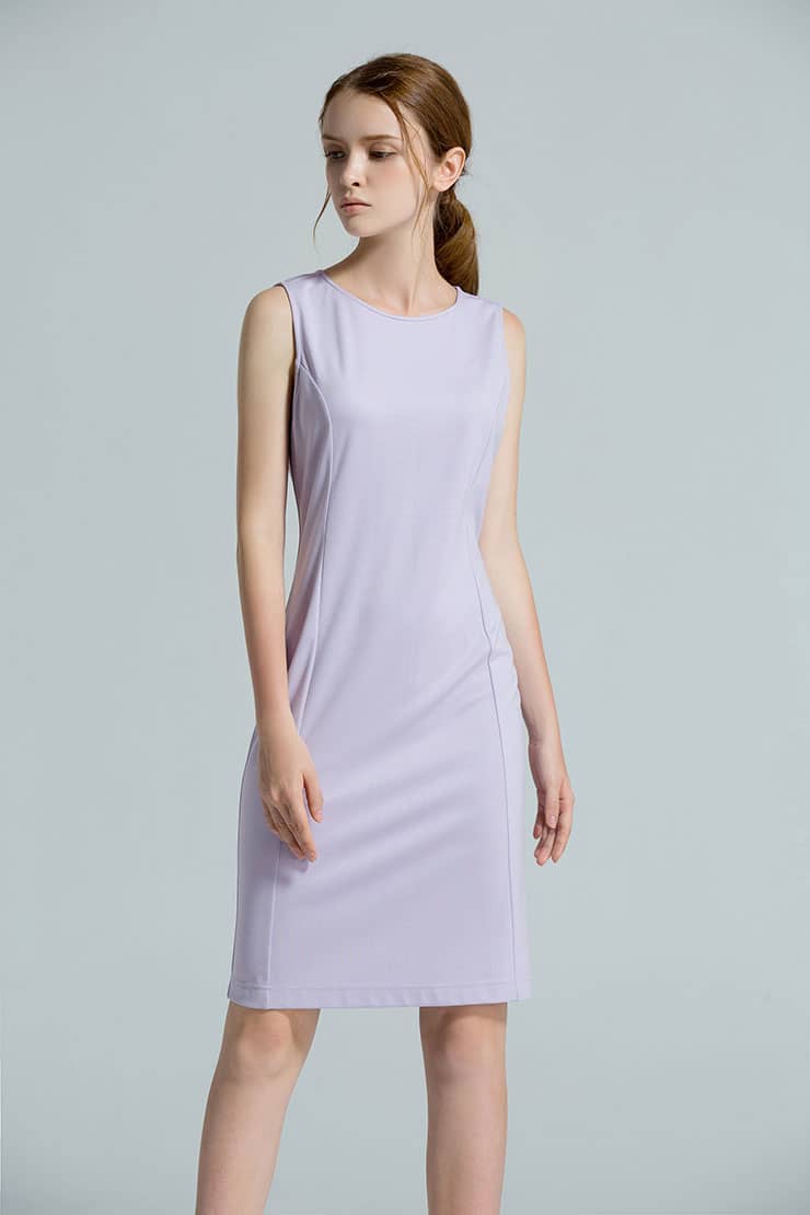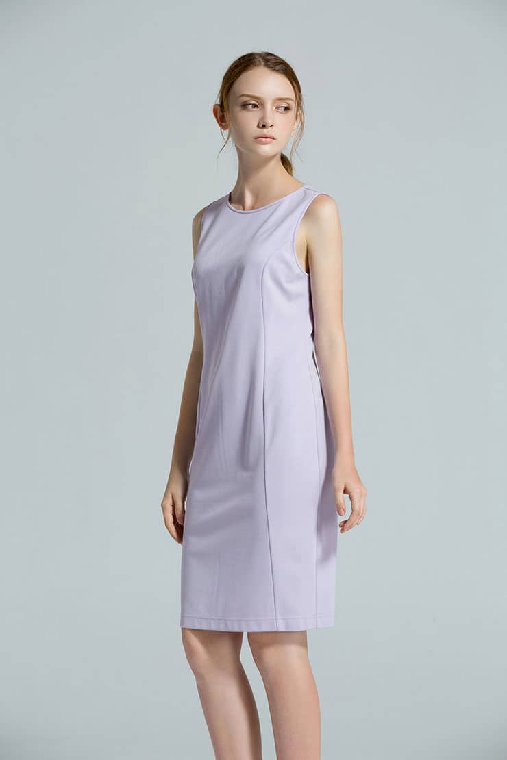 棉质有弹面料,圆领、无袖,收腰合体剪裁,塑造优雅完美的身段,后中有隐形拉链,开合顺畅,方便穿脱。