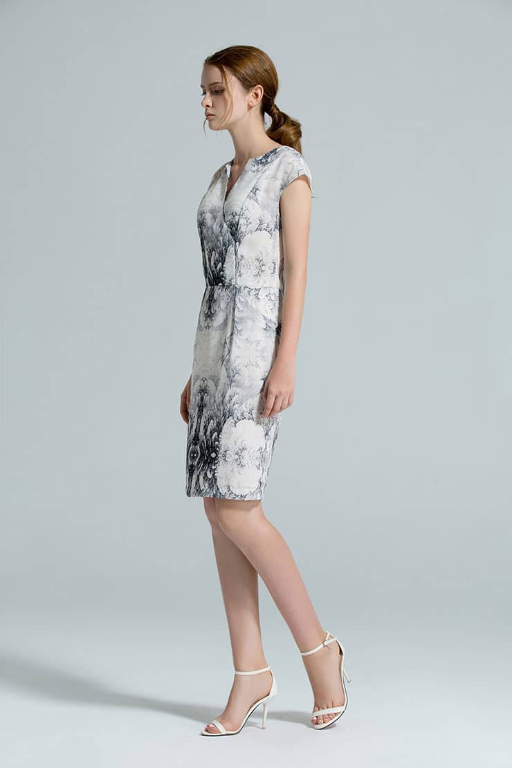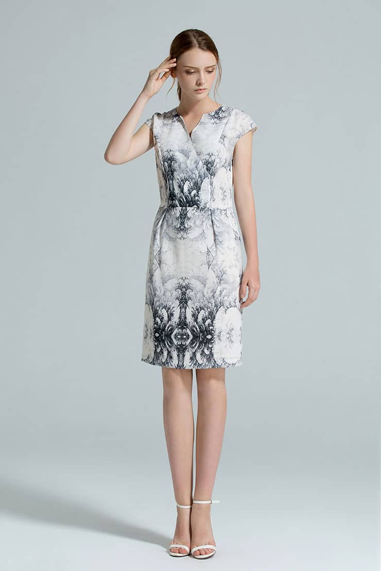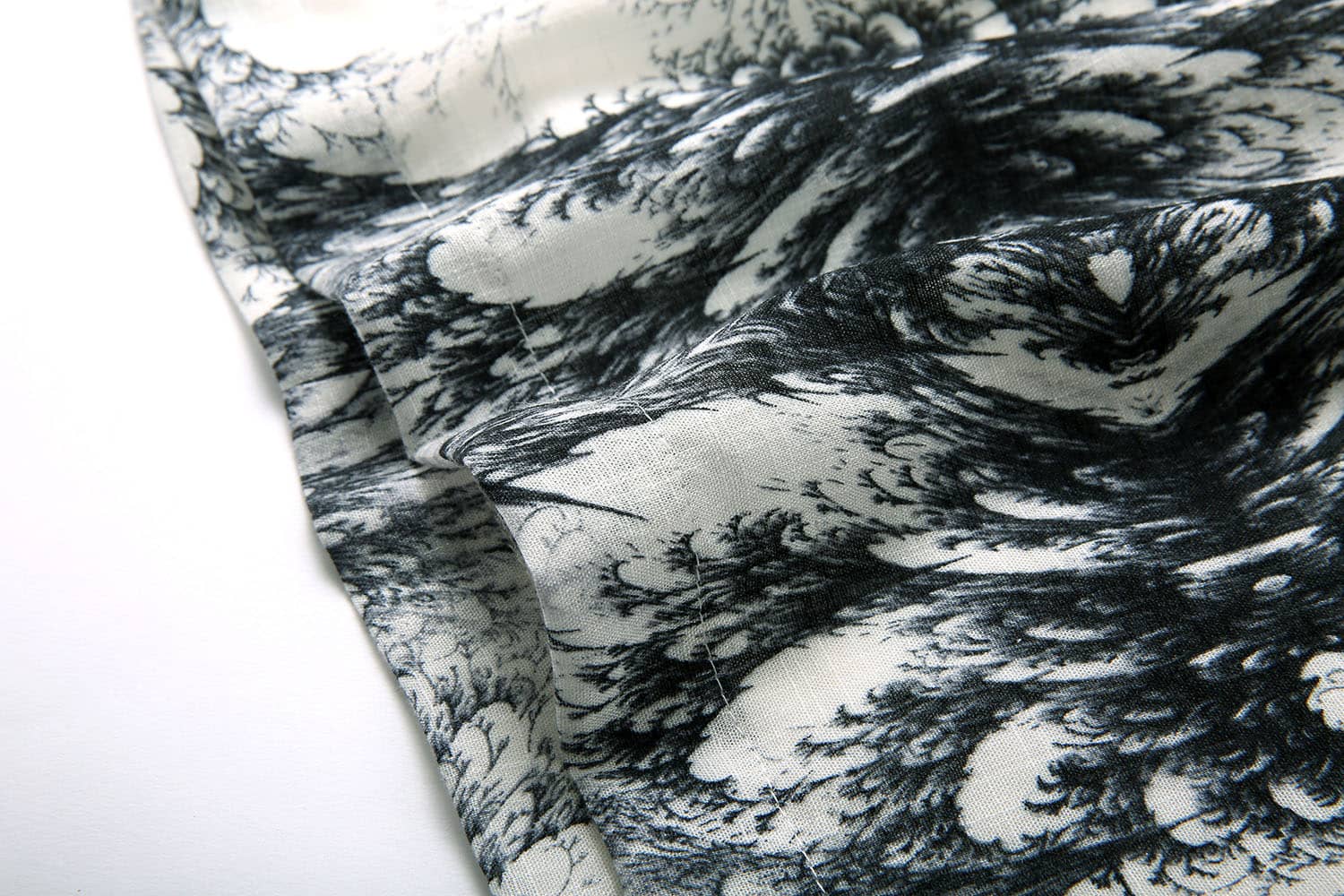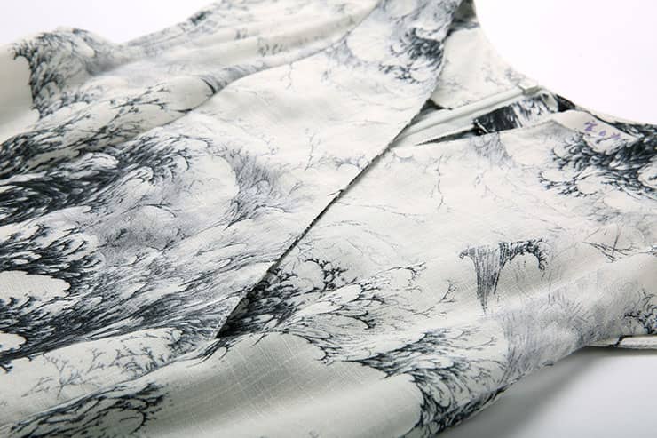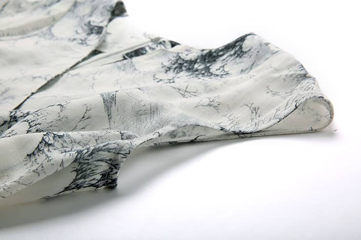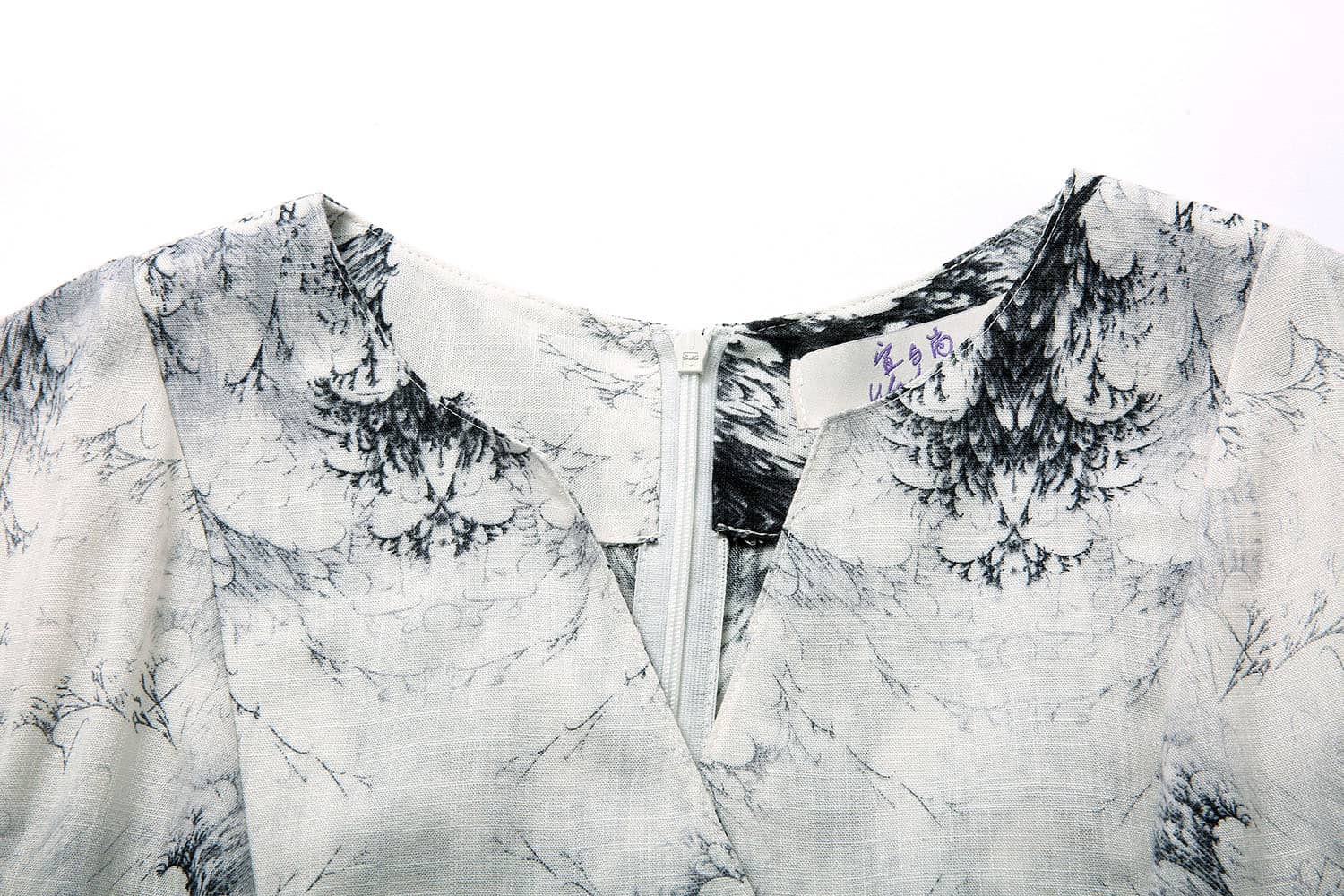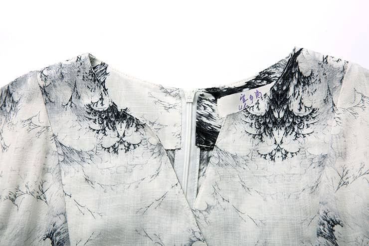 迷人的水墨印花面料,胸前交叉式小V领,连肩半袖设计,收腰版型,上身效果更好,彰显典雅复古气质。