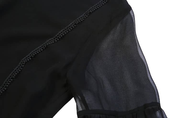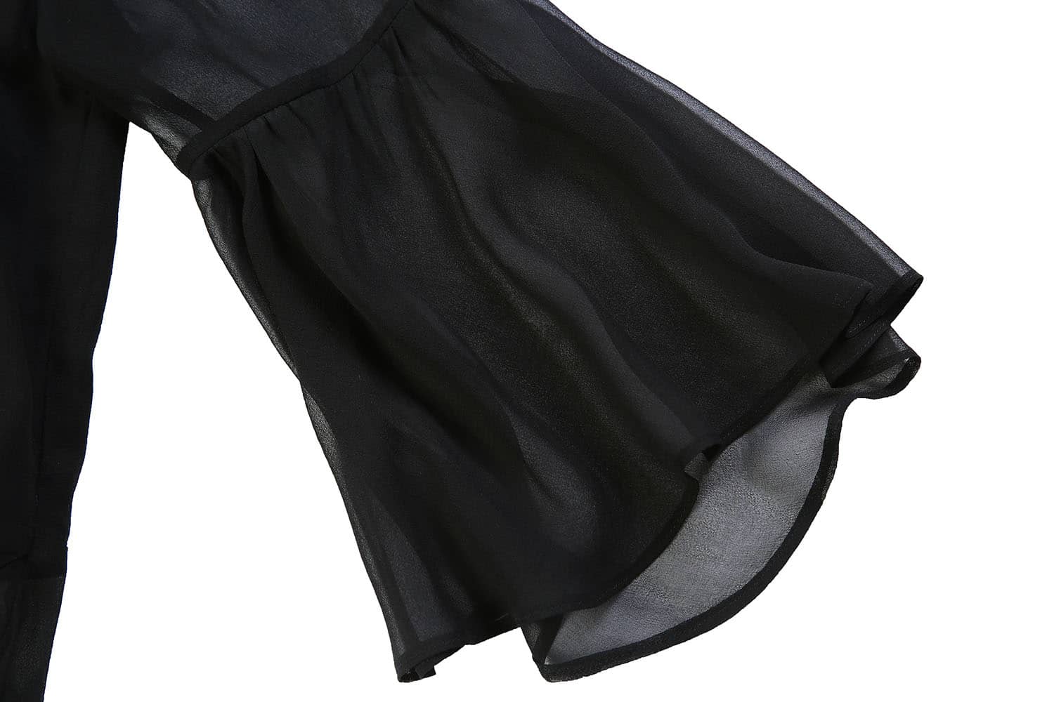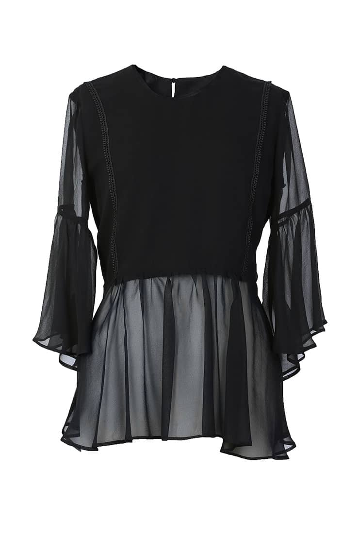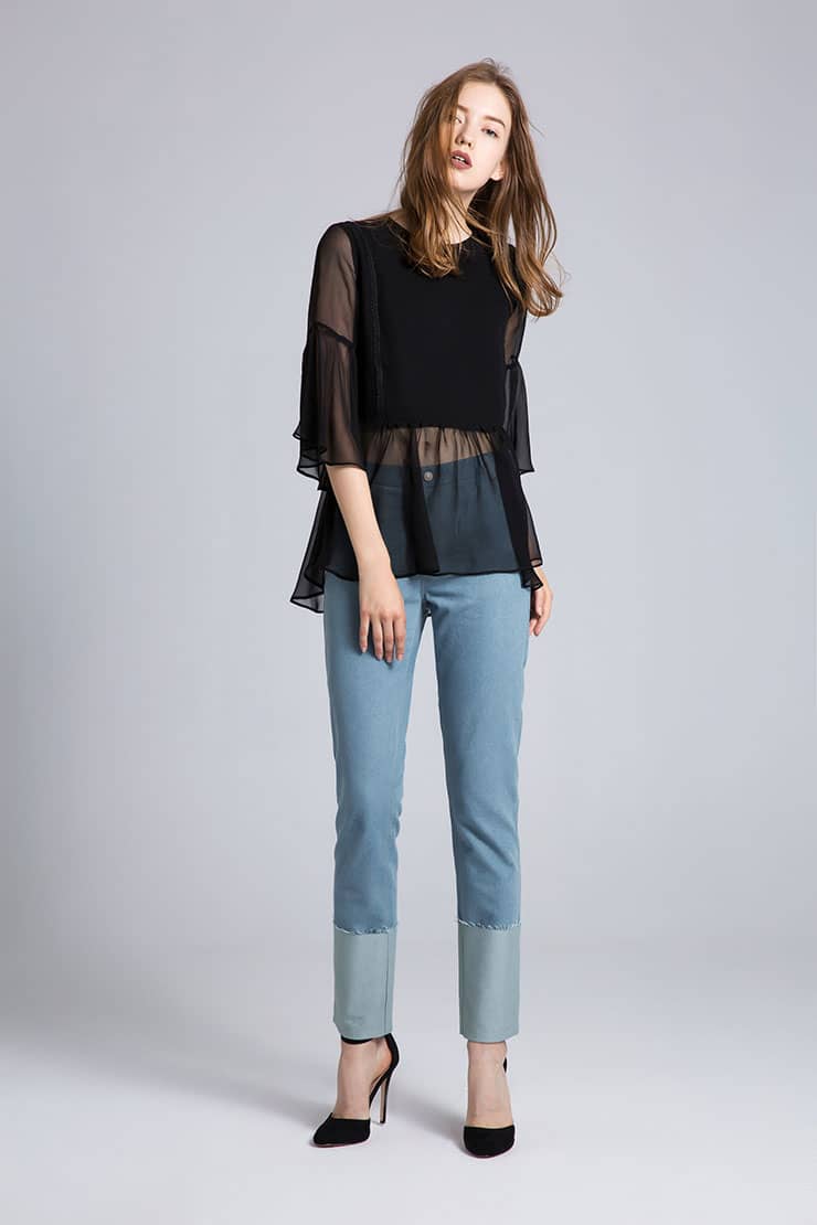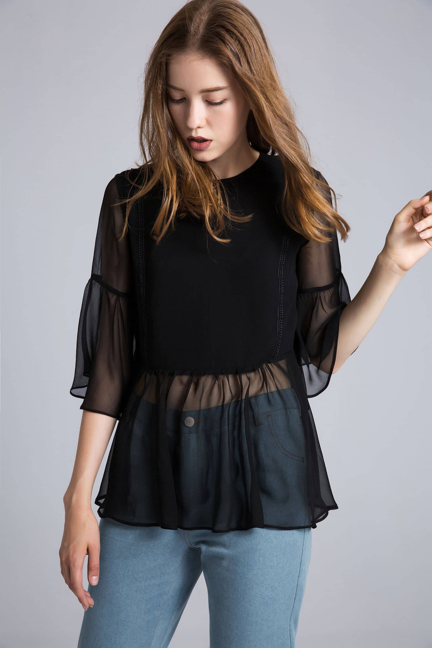 六分袖圆领雪纺上衣,腰下拼接单层荷叶下摆,温婉浪漫,复古的拼接喇叭袖口,飘逸有型,衬显手臂曲线更加纤细柔美。