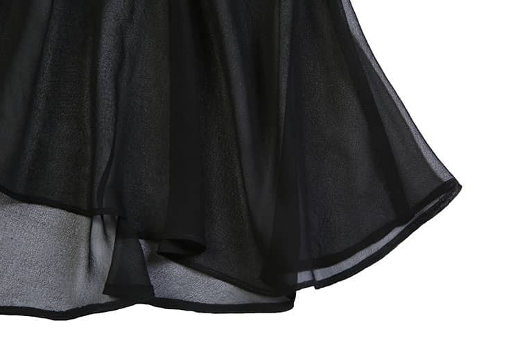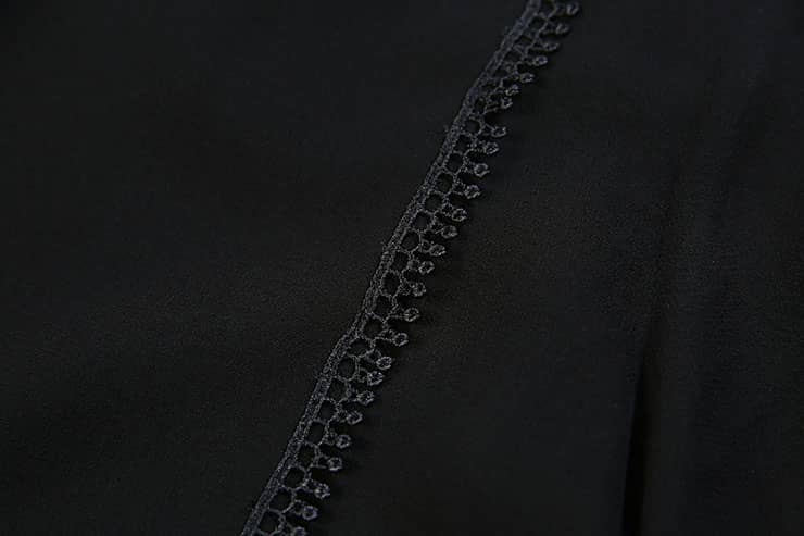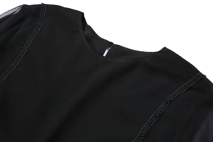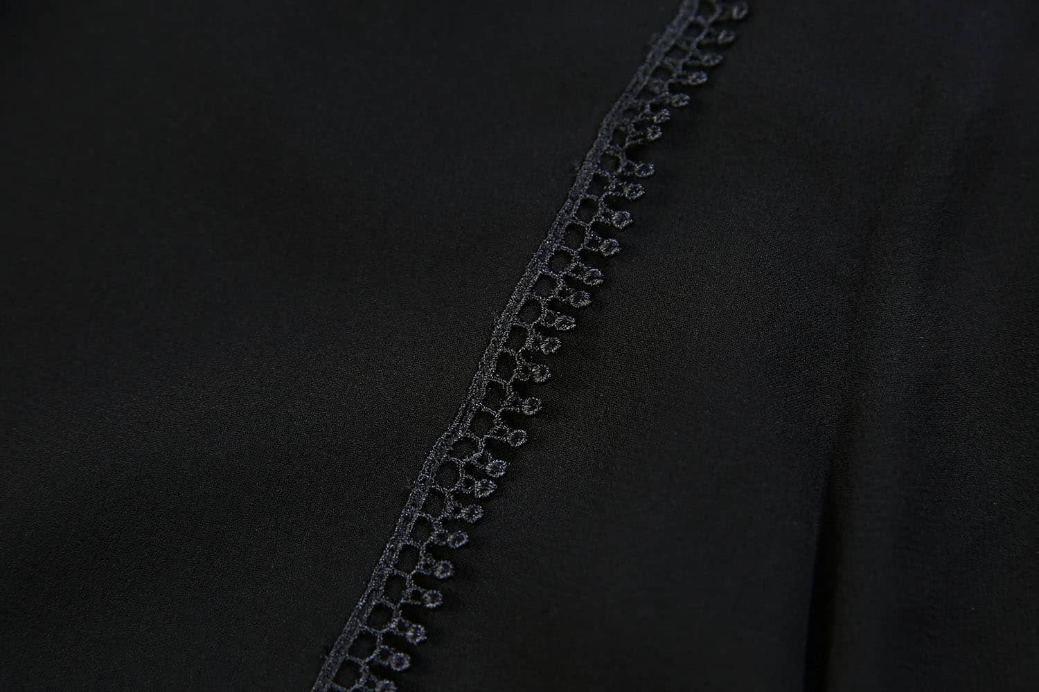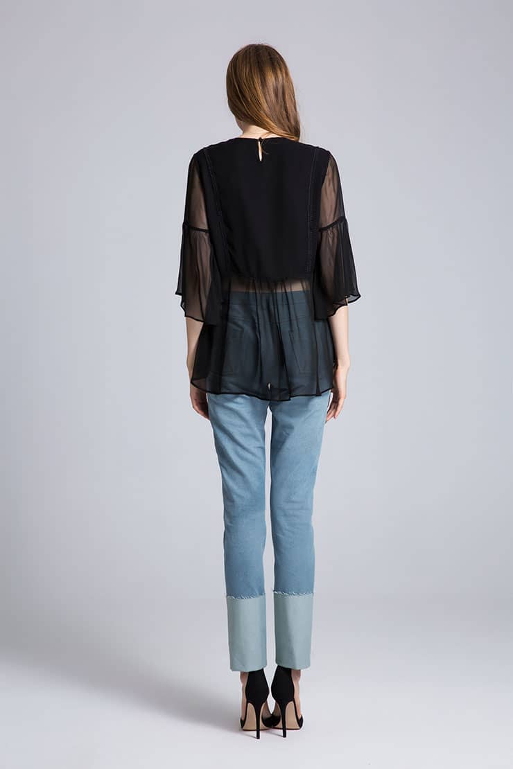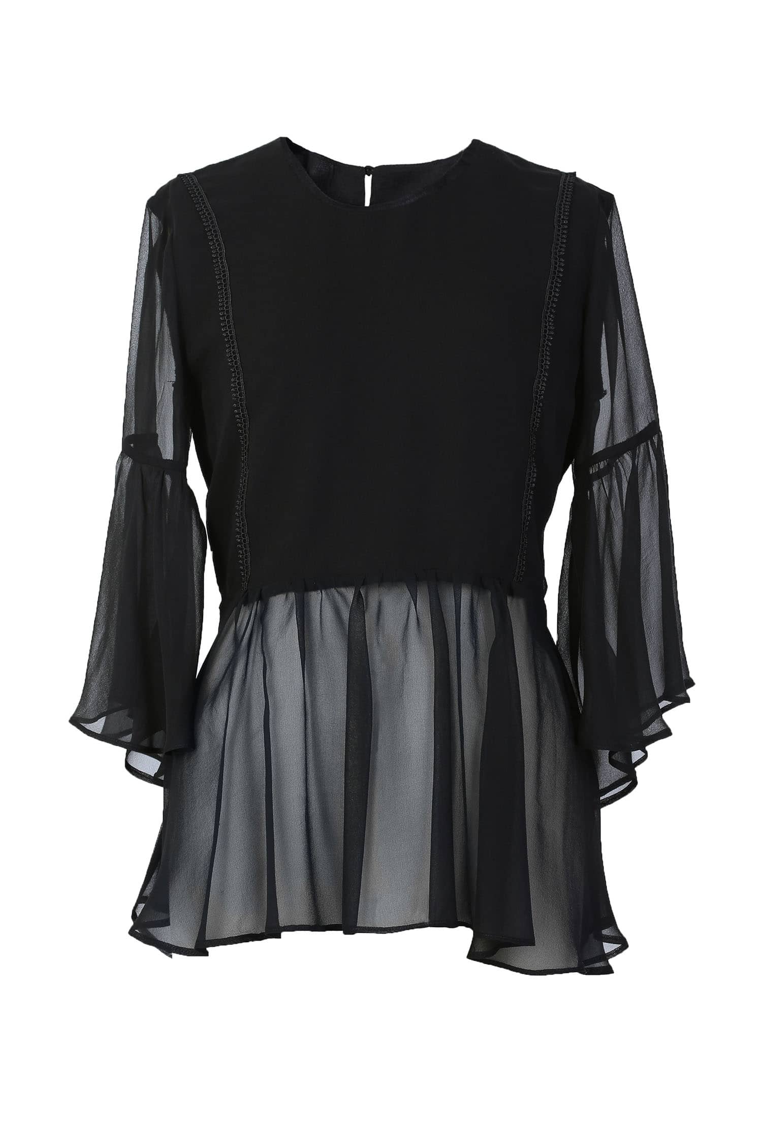 六分袖圆领雪纺上衣,腰下拼接单层荷叶下摆,温婉浪漫,复古的拼接喇叭袖口,飘逸有型,衬显手臂曲线更加纤细柔美。