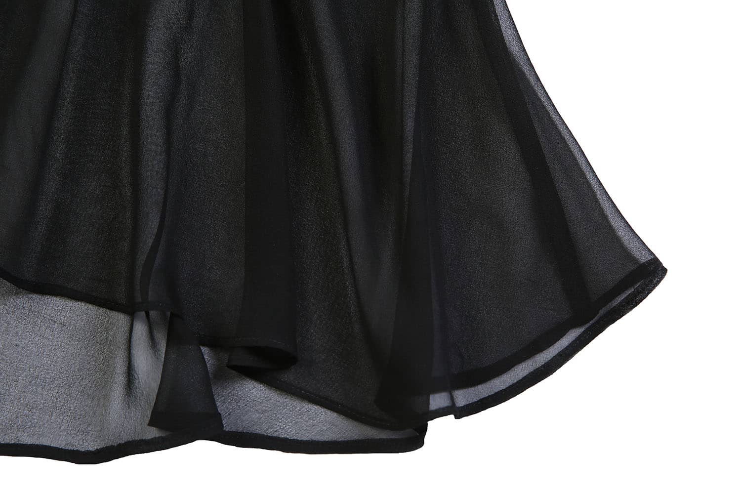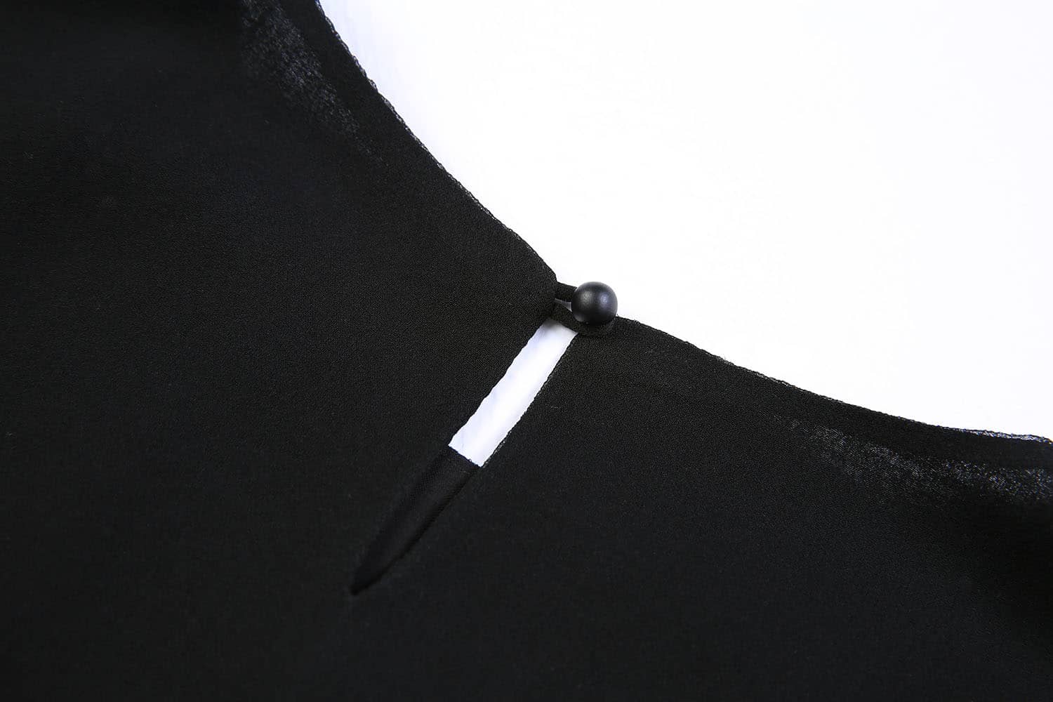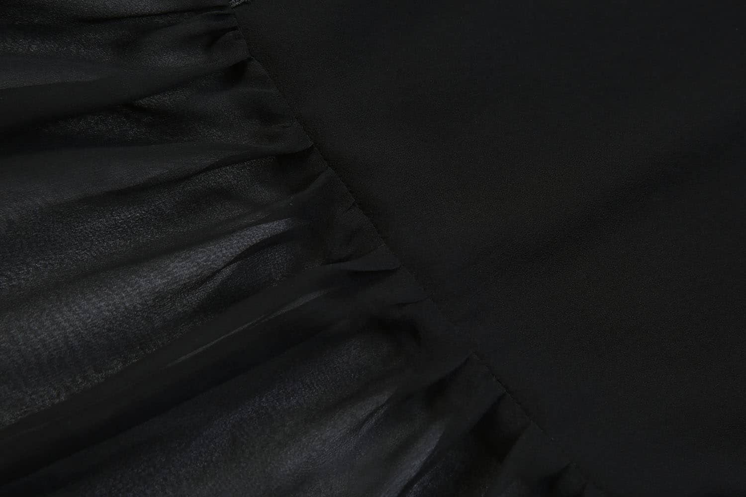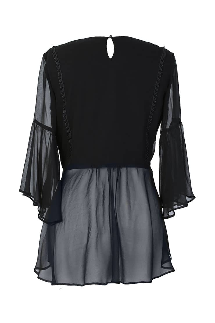 六分袖圆领雪纺上衣,腰下拼接单层荷叶下摆,温婉浪漫,复古的拼接喇叭袖口,飘逸有型,衬显手臂曲线更加纤细柔美。