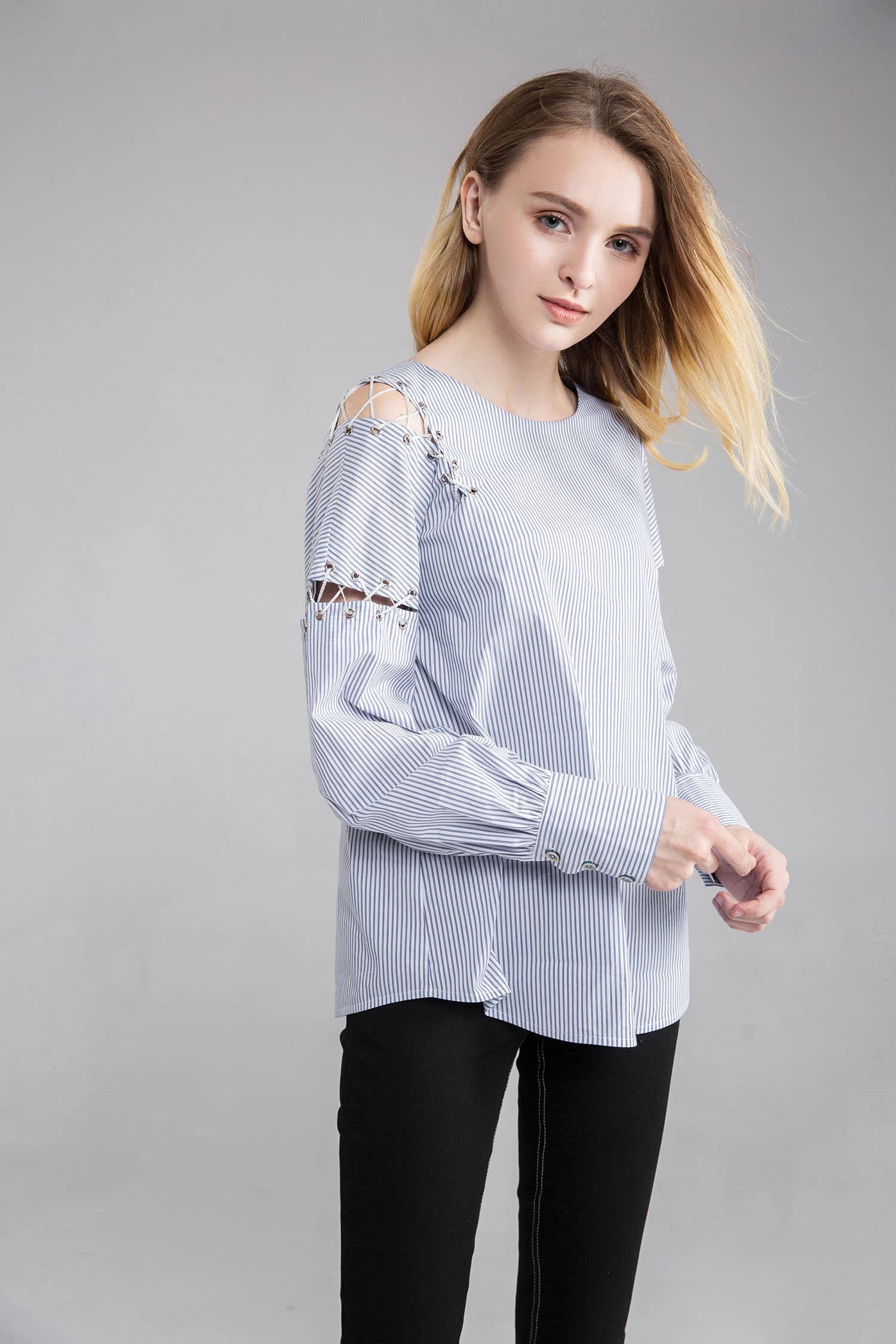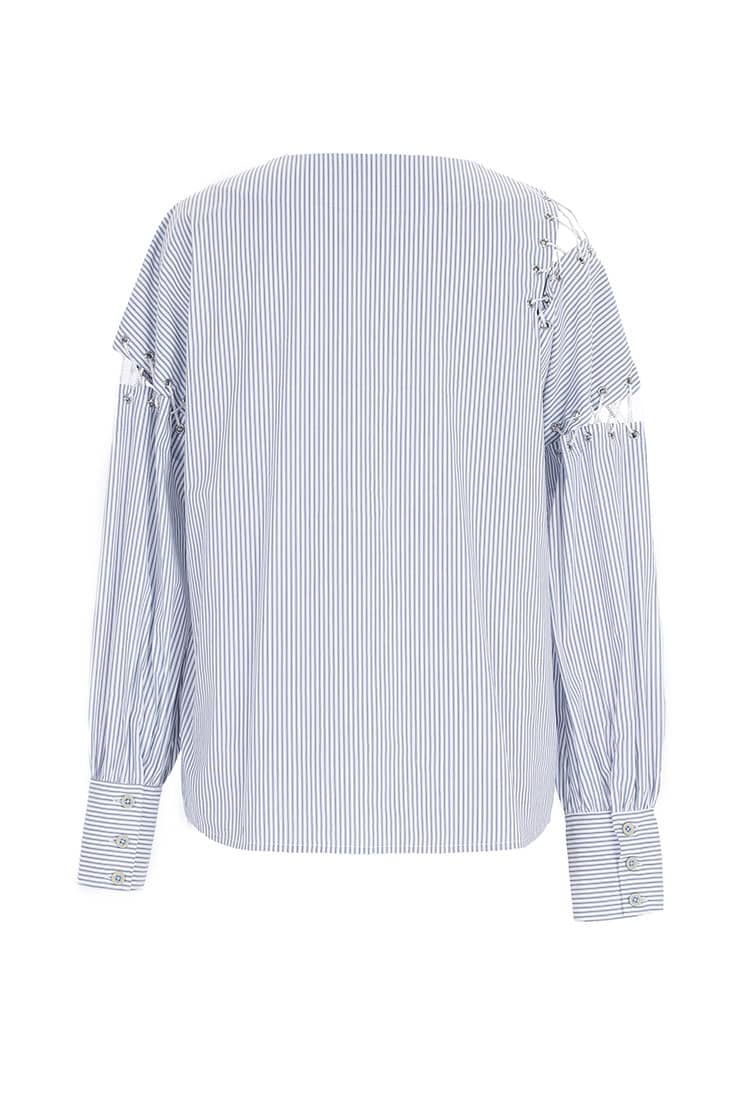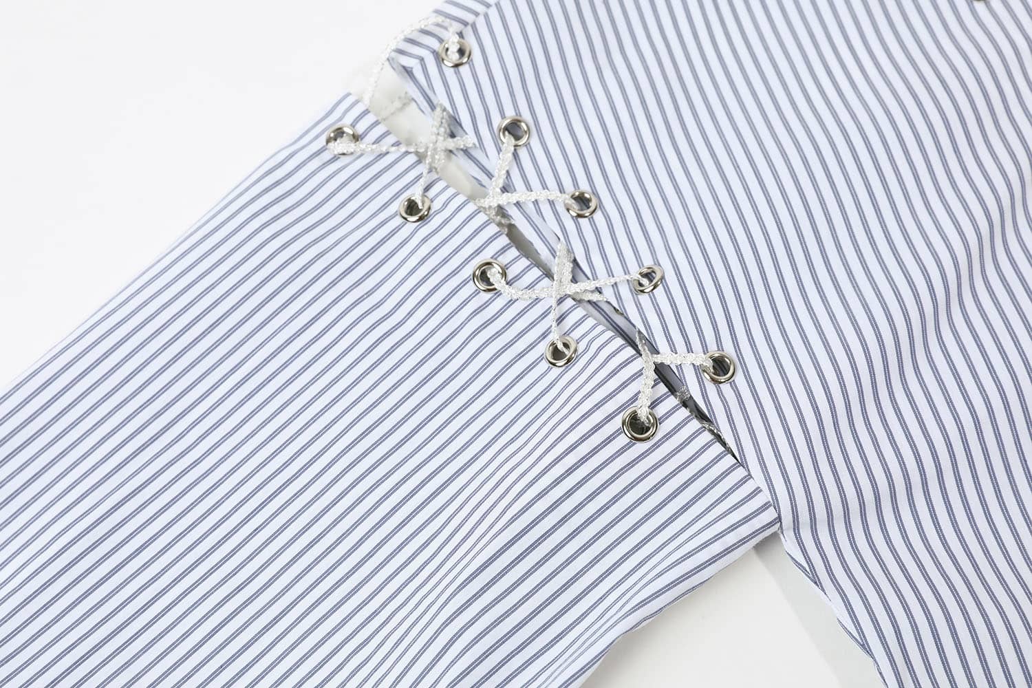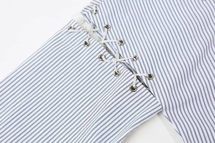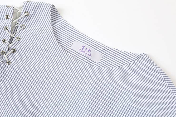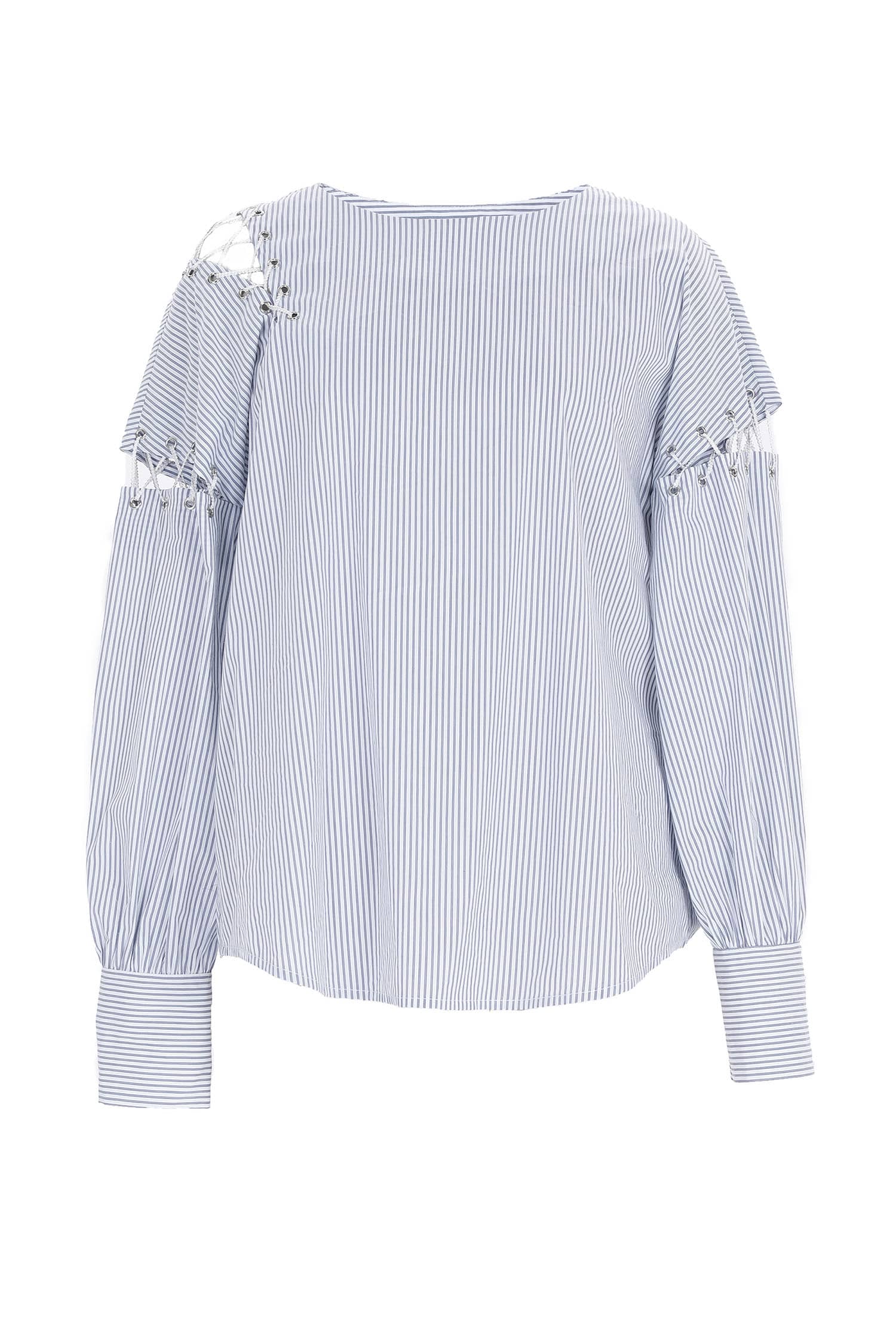 海军风的棉质蓝白条纹面料,经典圆领,肩臂别致不对称破缝穿绳绑带,长袖袖口碎褶收束,使衣服个性不失甜美。