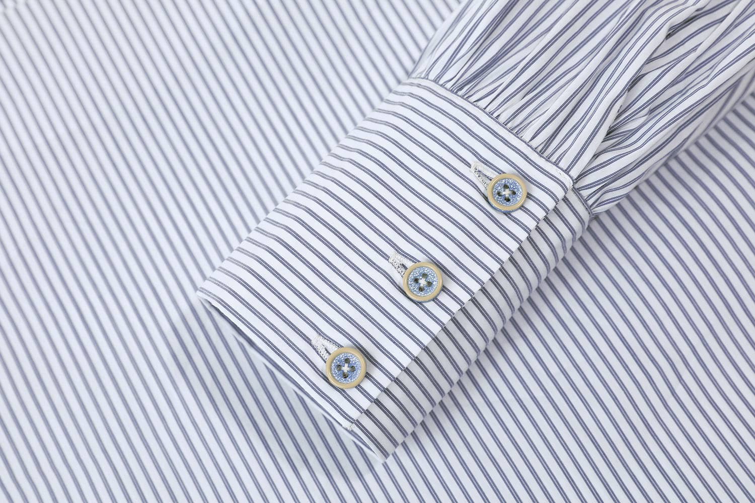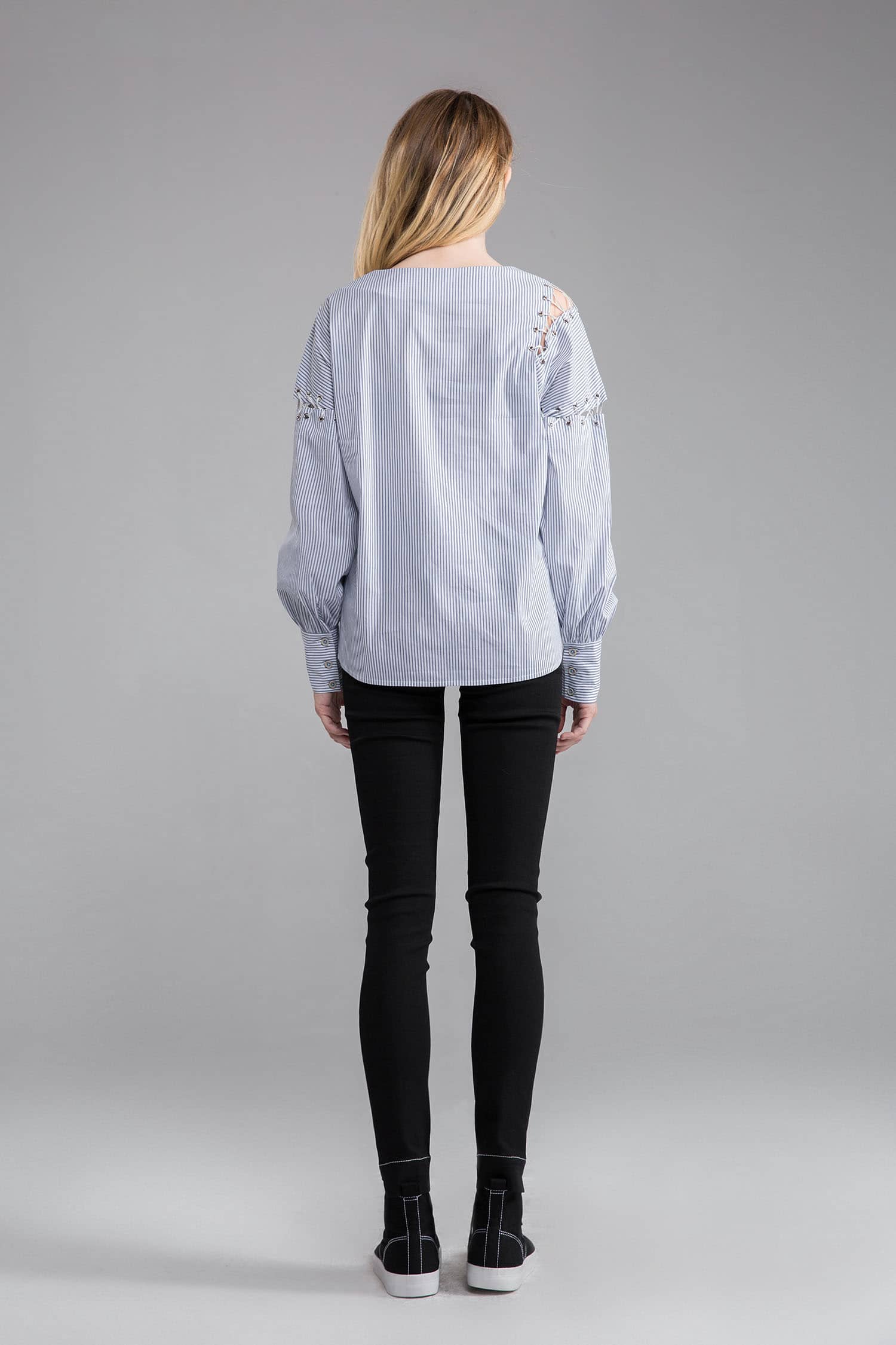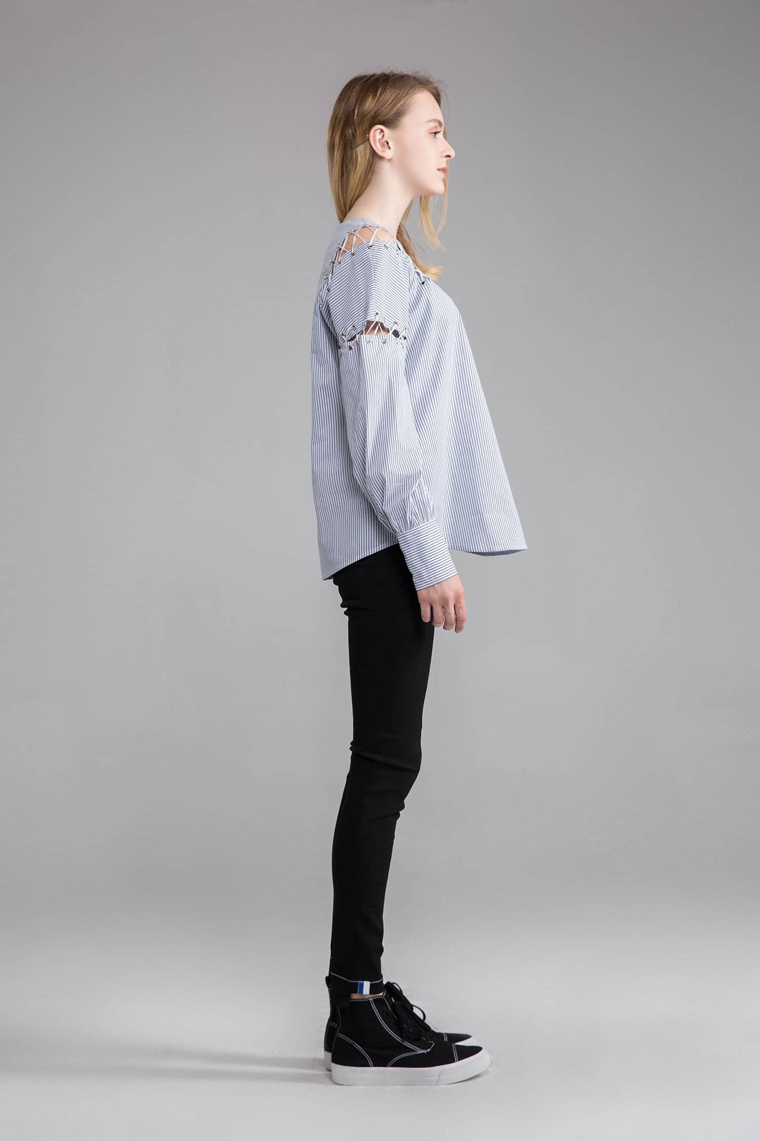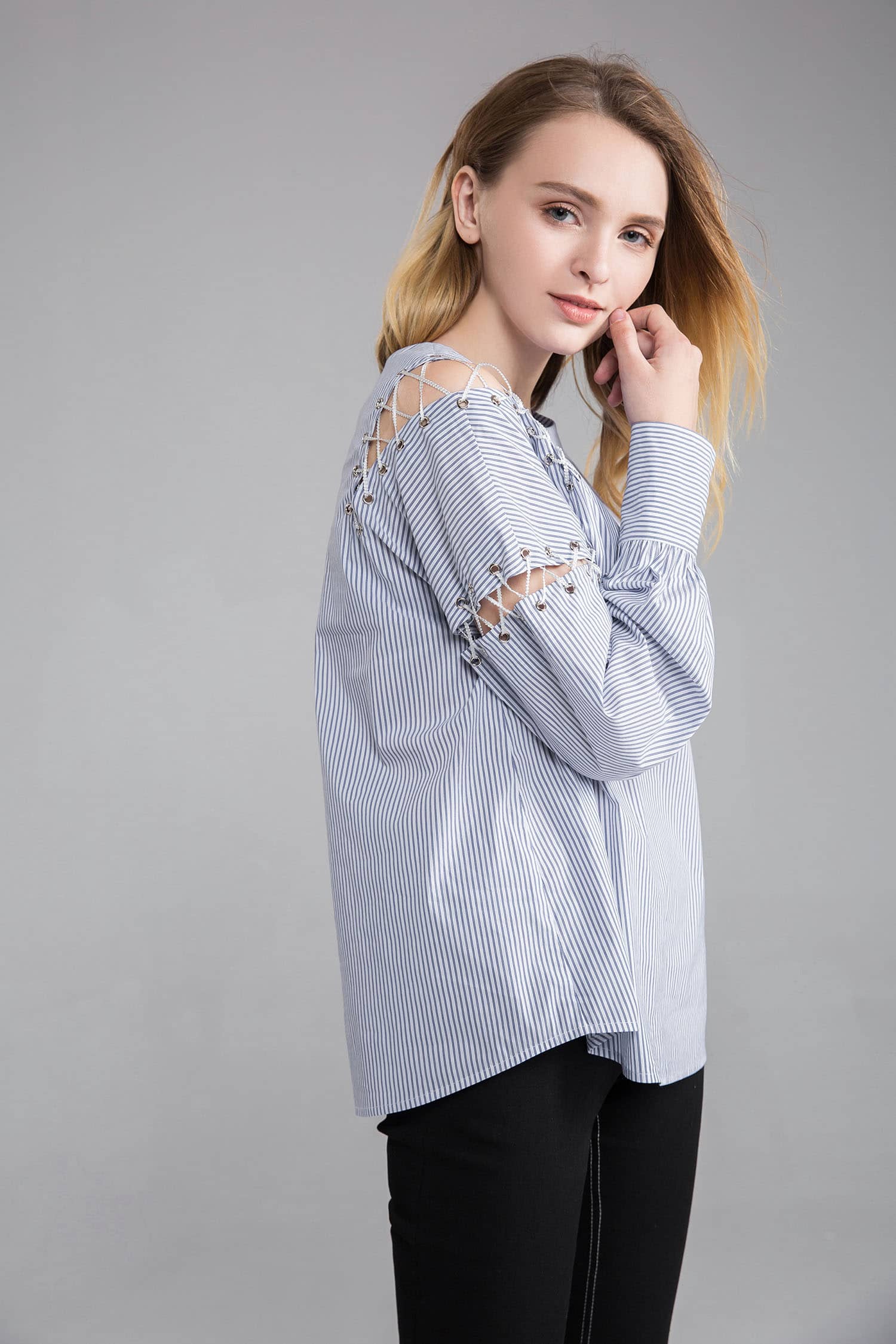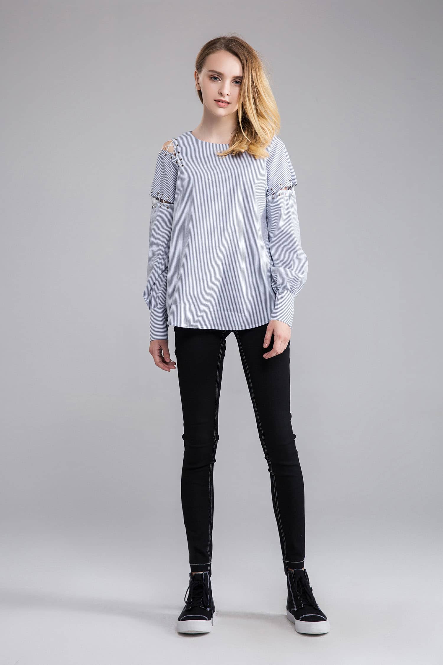 海军风的棉质蓝白条纹面料,经典圆领,肩臂别致不对称破缝穿绳绑带,长袖袖口碎褶收束,使衣服个性不失甜美。