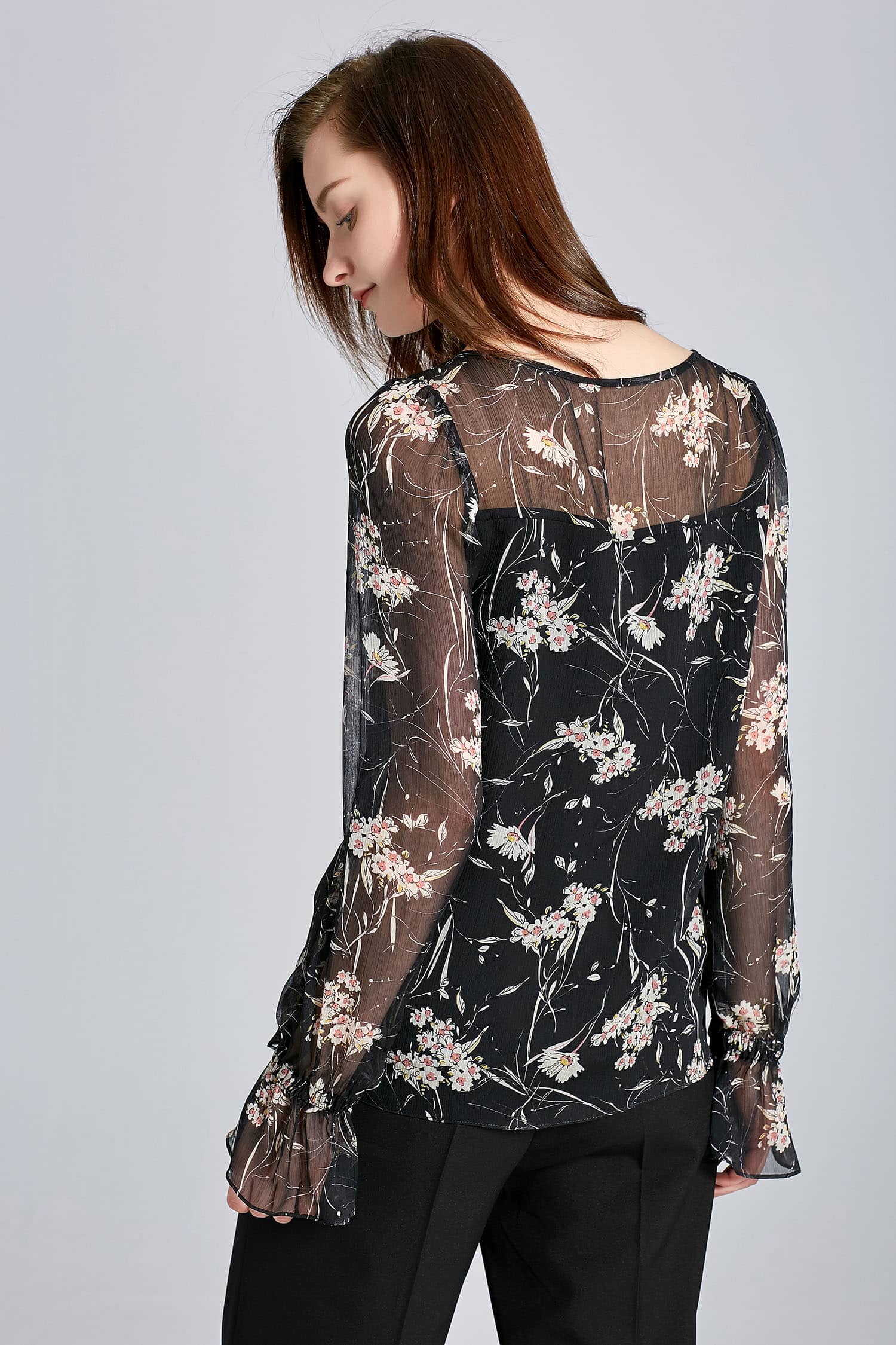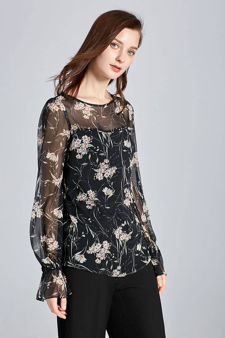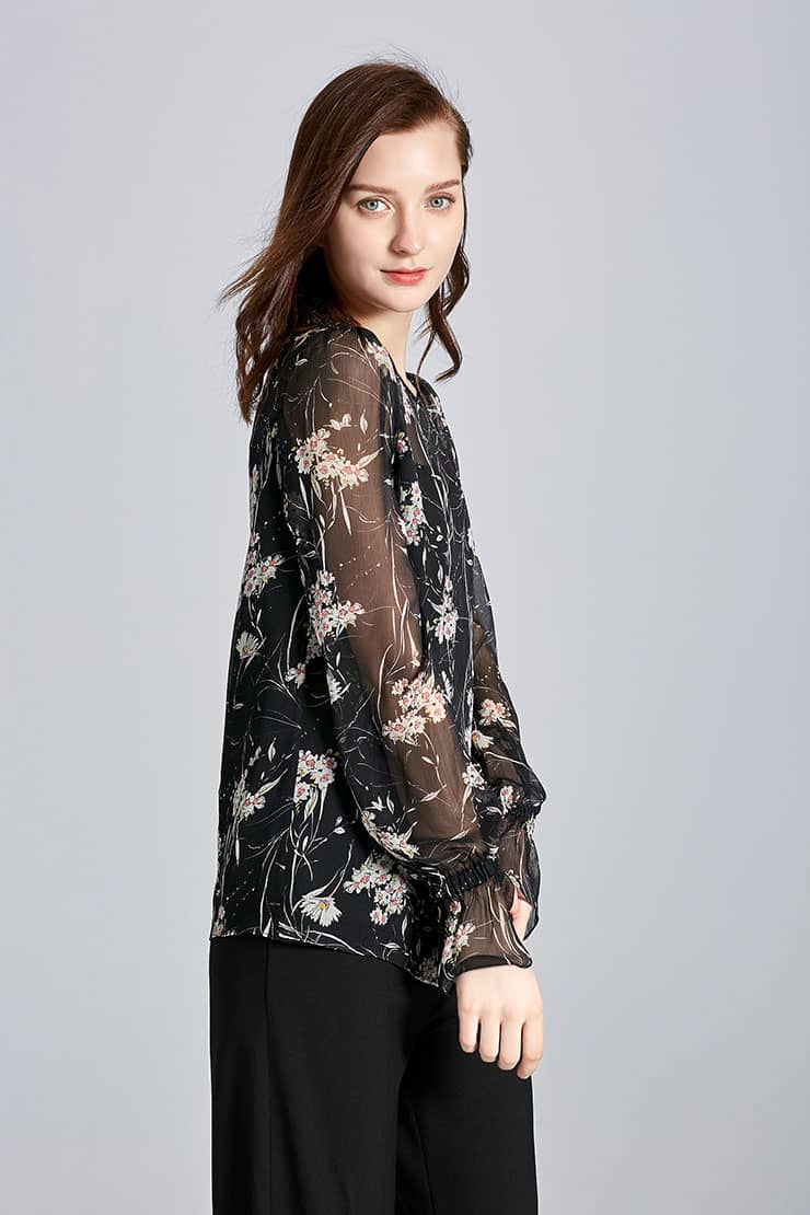垂坠的顺圩丝面料,船领套头,松紧带抽褶荷叶袖口灯笼长袖,衣身内有里衬,视觉上更富层次感。