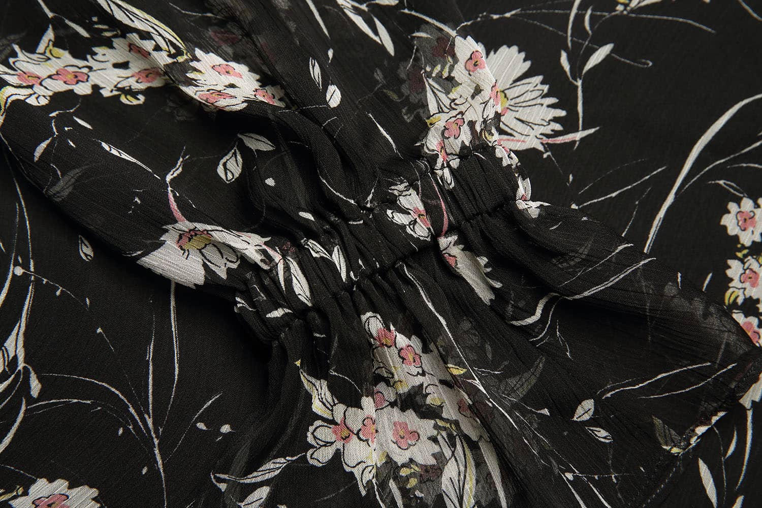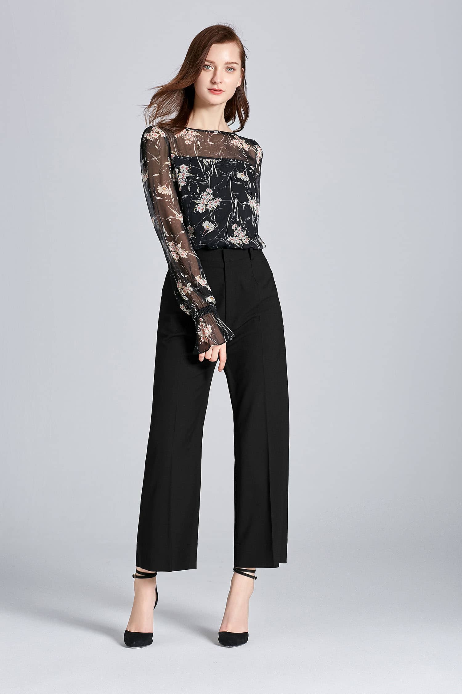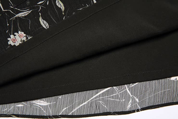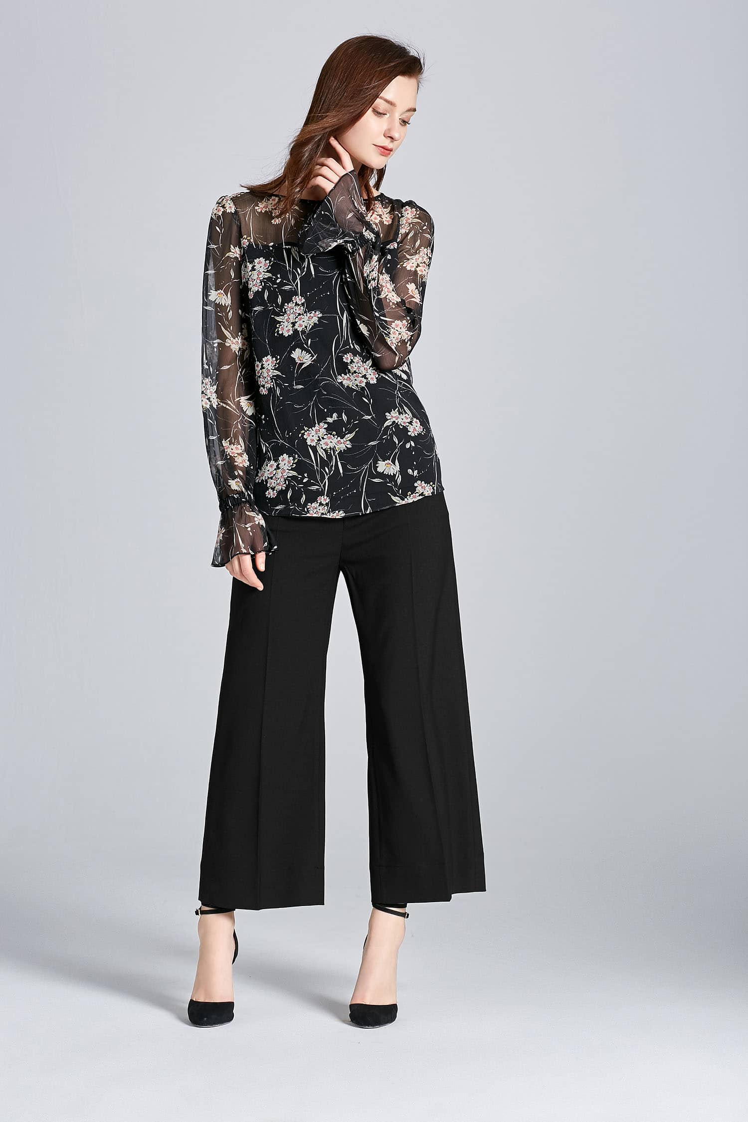 垂坠的顺圩丝面料,船领套头,松紧带抽褶荷叶袖口灯笼长袖,衣身内有里衬,视觉上更富层次感。