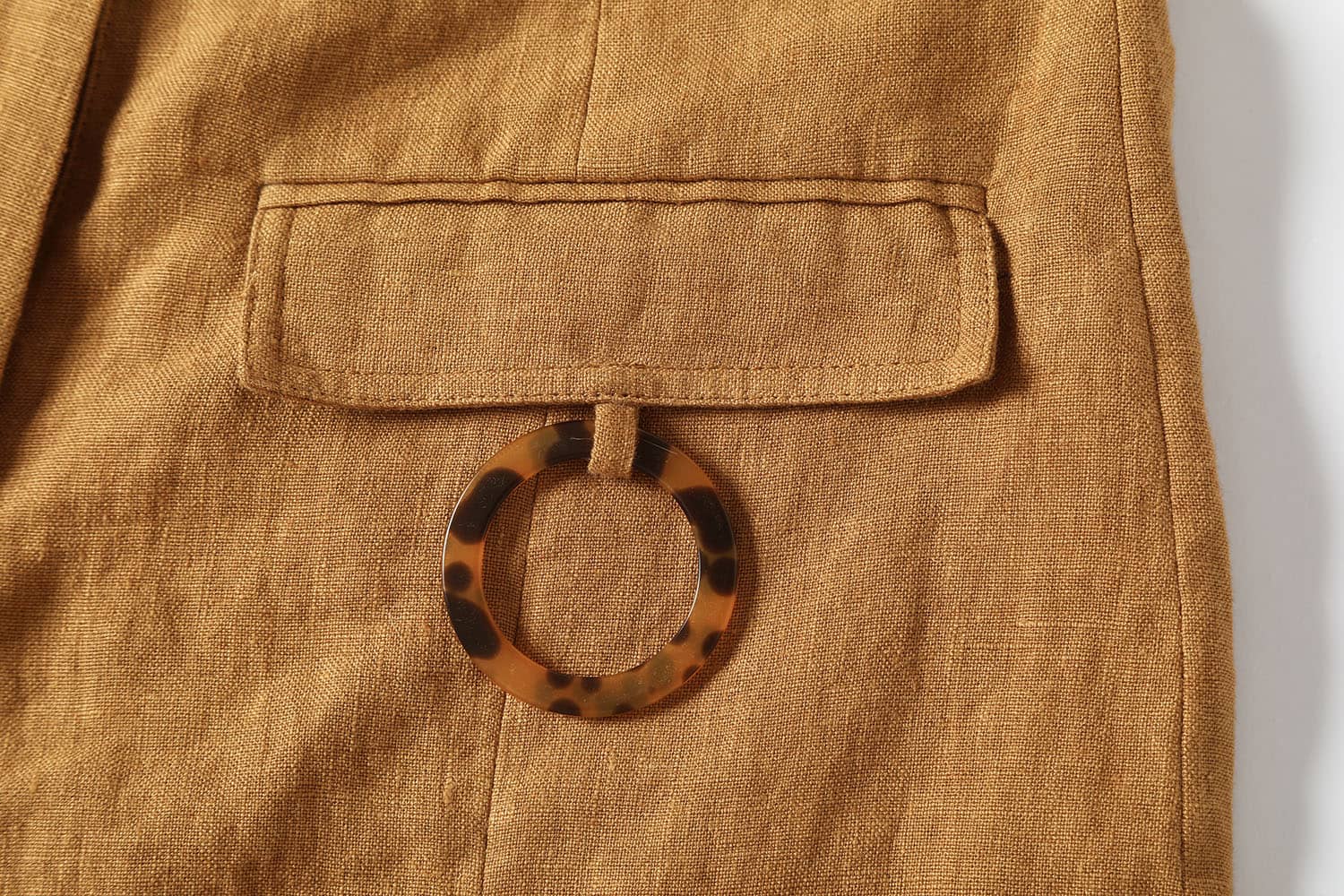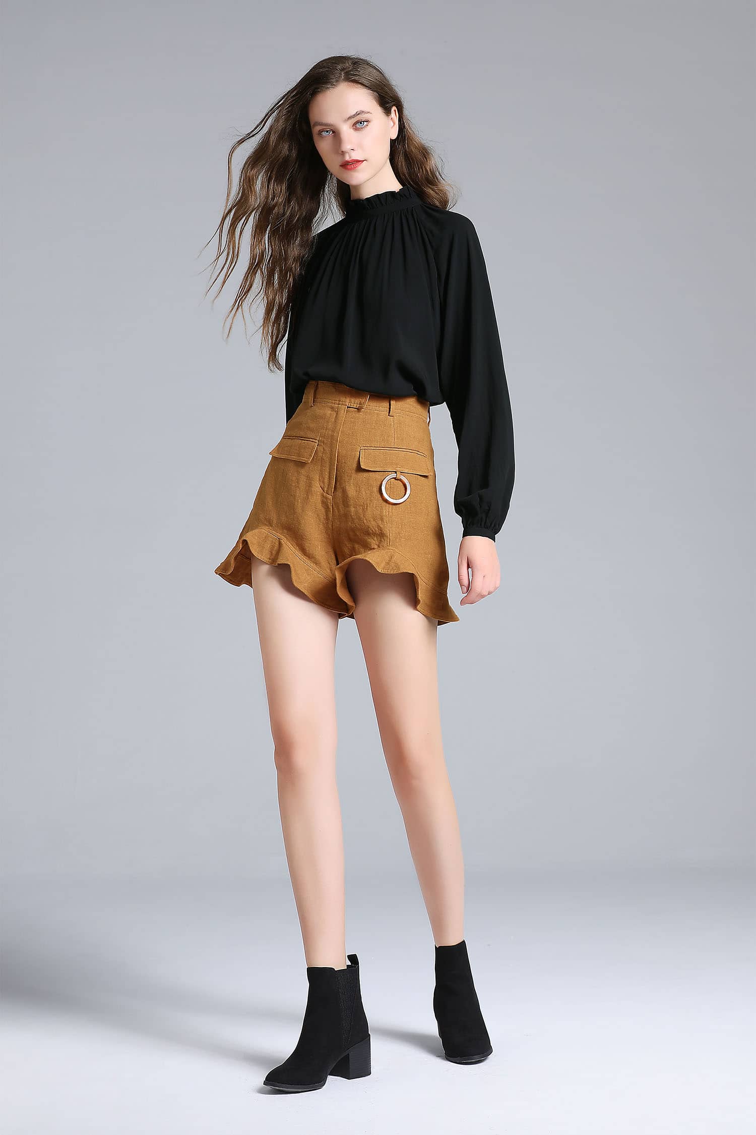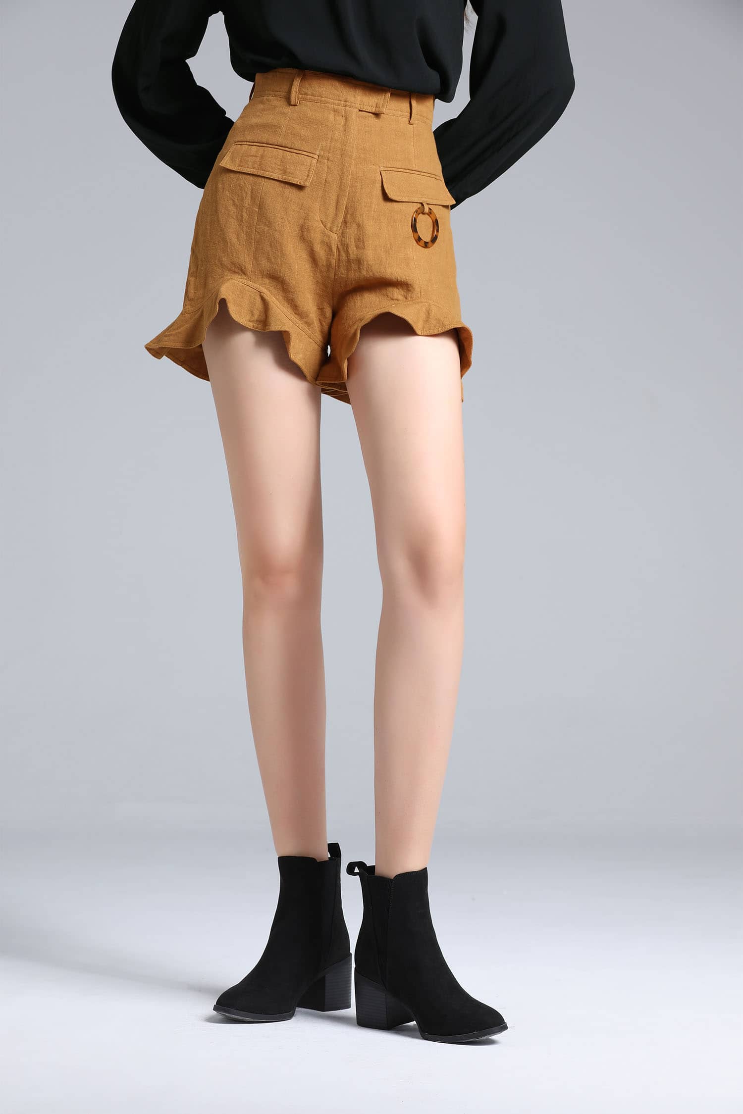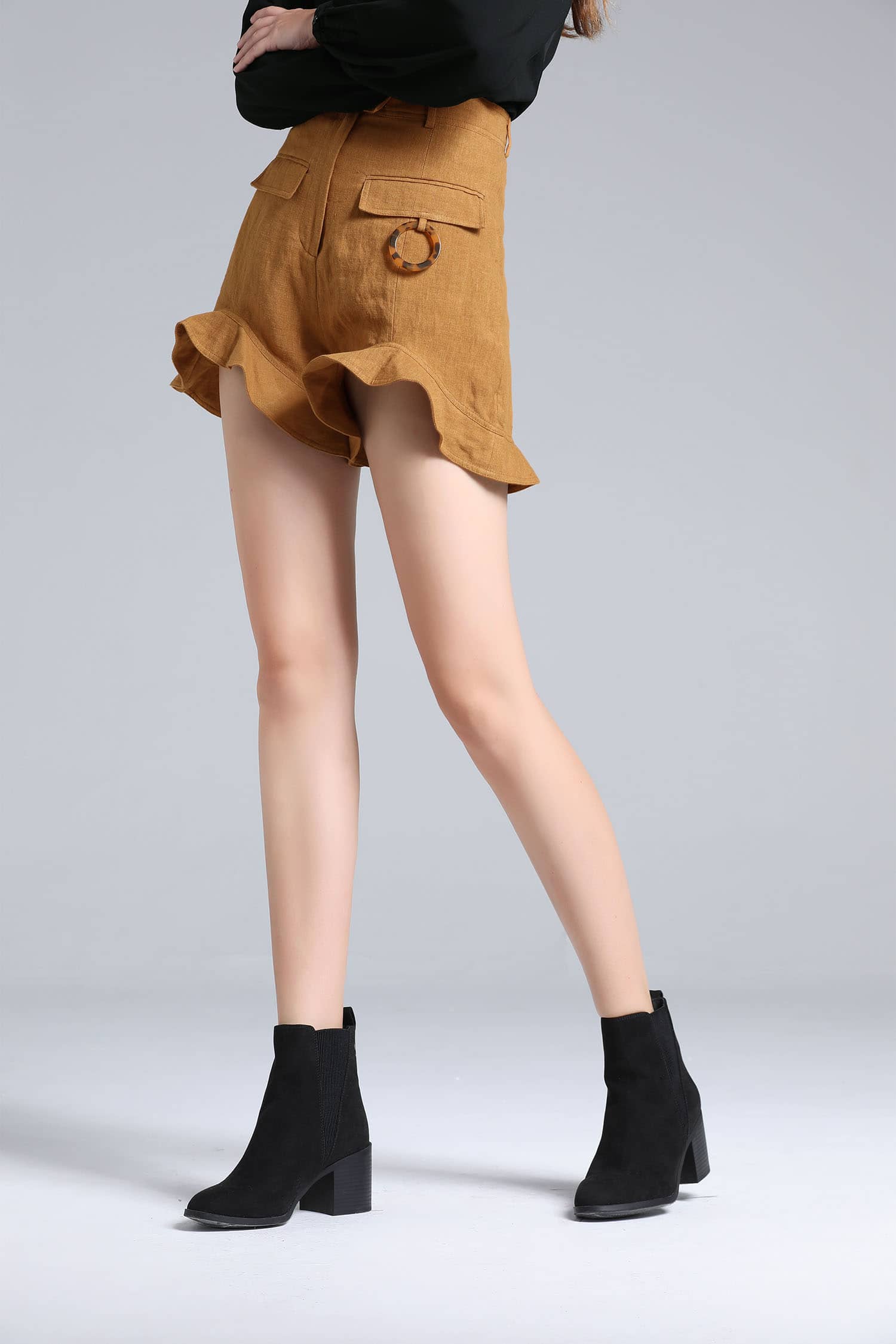 简约直腰头,拉链门襟,袋盖口袋,圆环装饰,荷叶裤边设计,令廓形更立体显瘦。