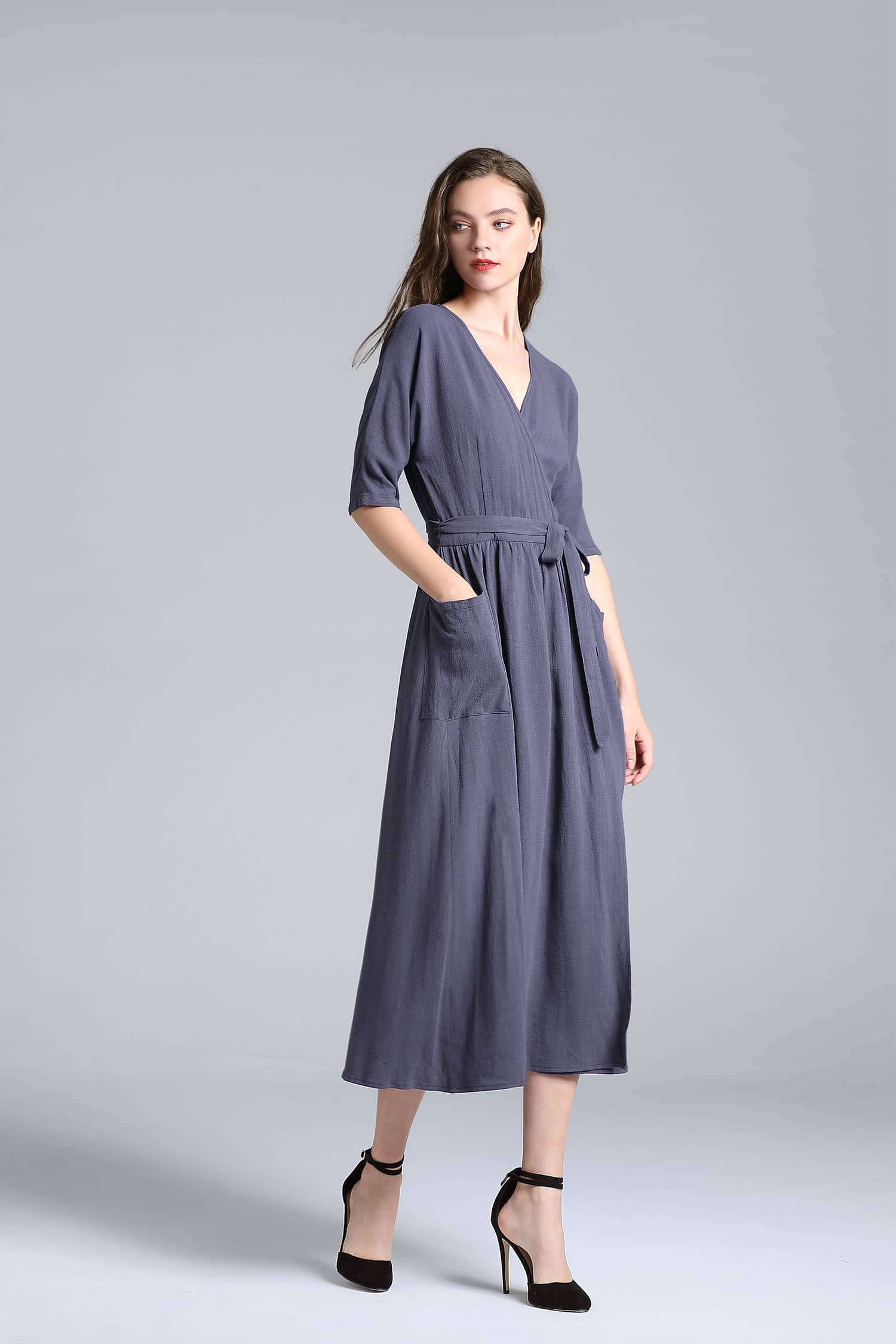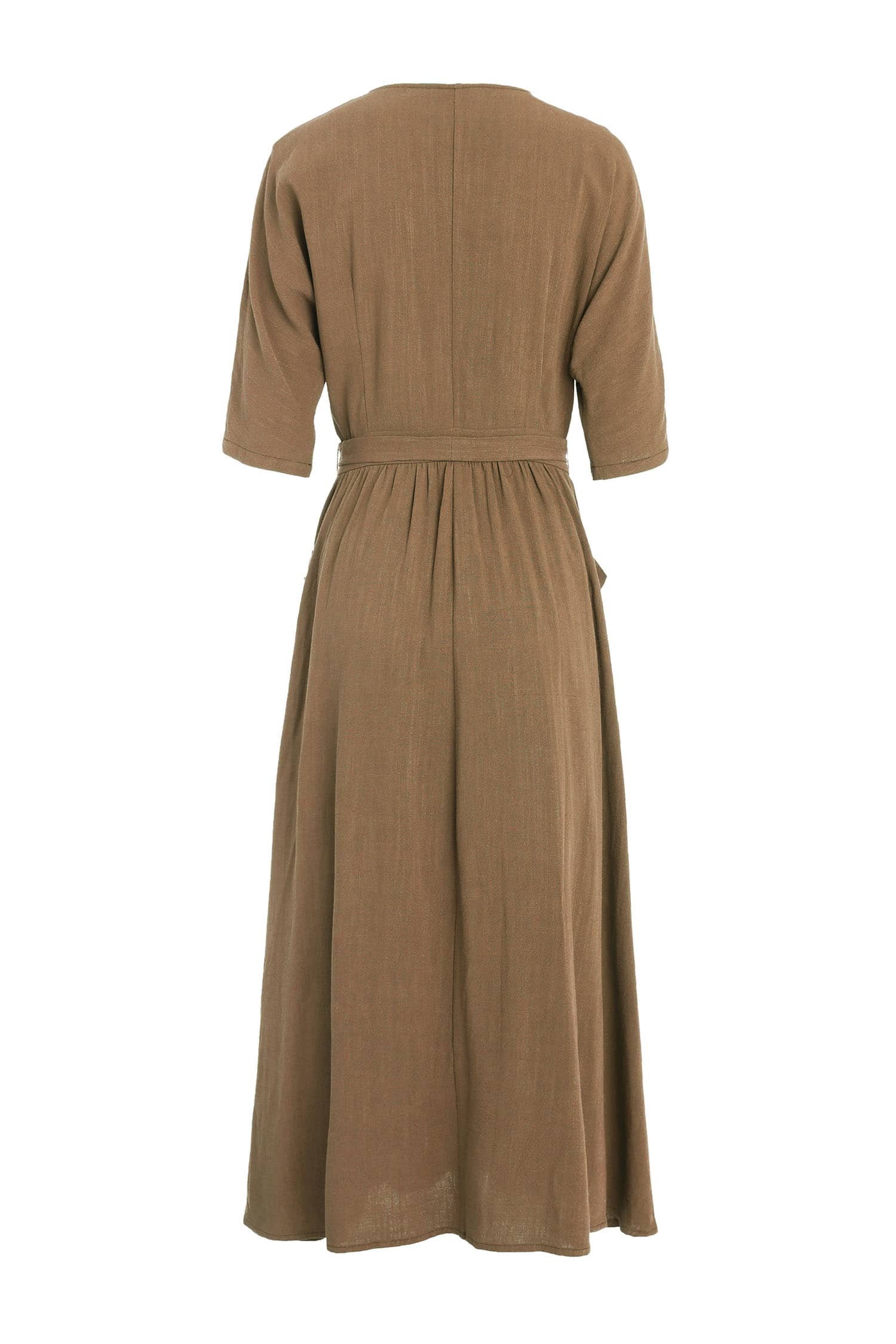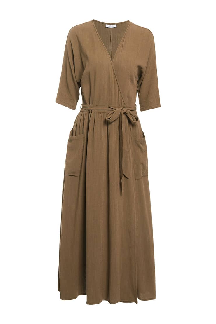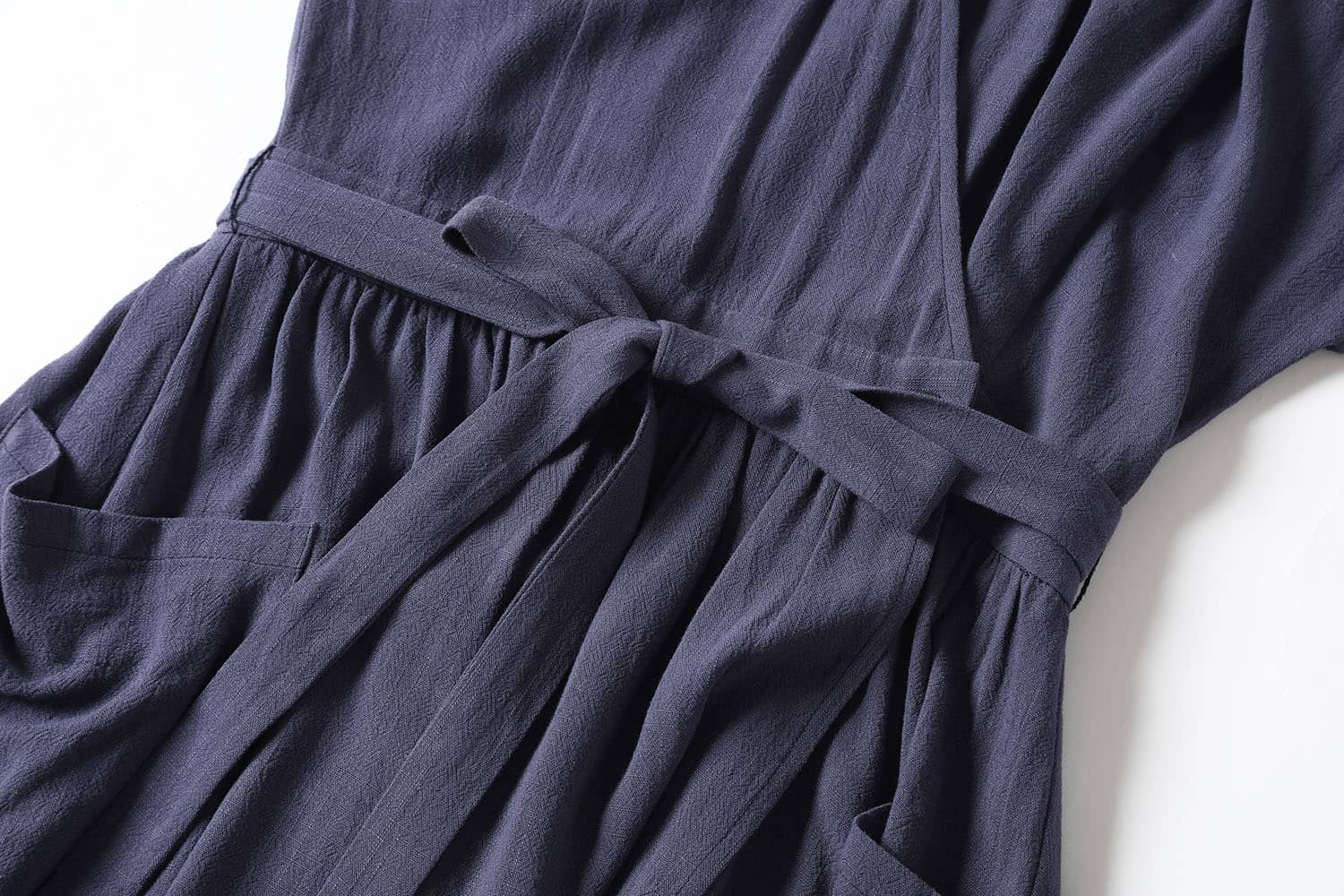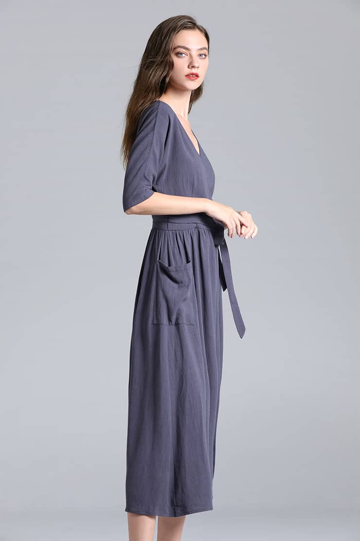 交叉式V领,连肩中袖,抽褶A型裙摆,前侧大贴袋,腰间设有绑带束腰,呈现出自然极简气场