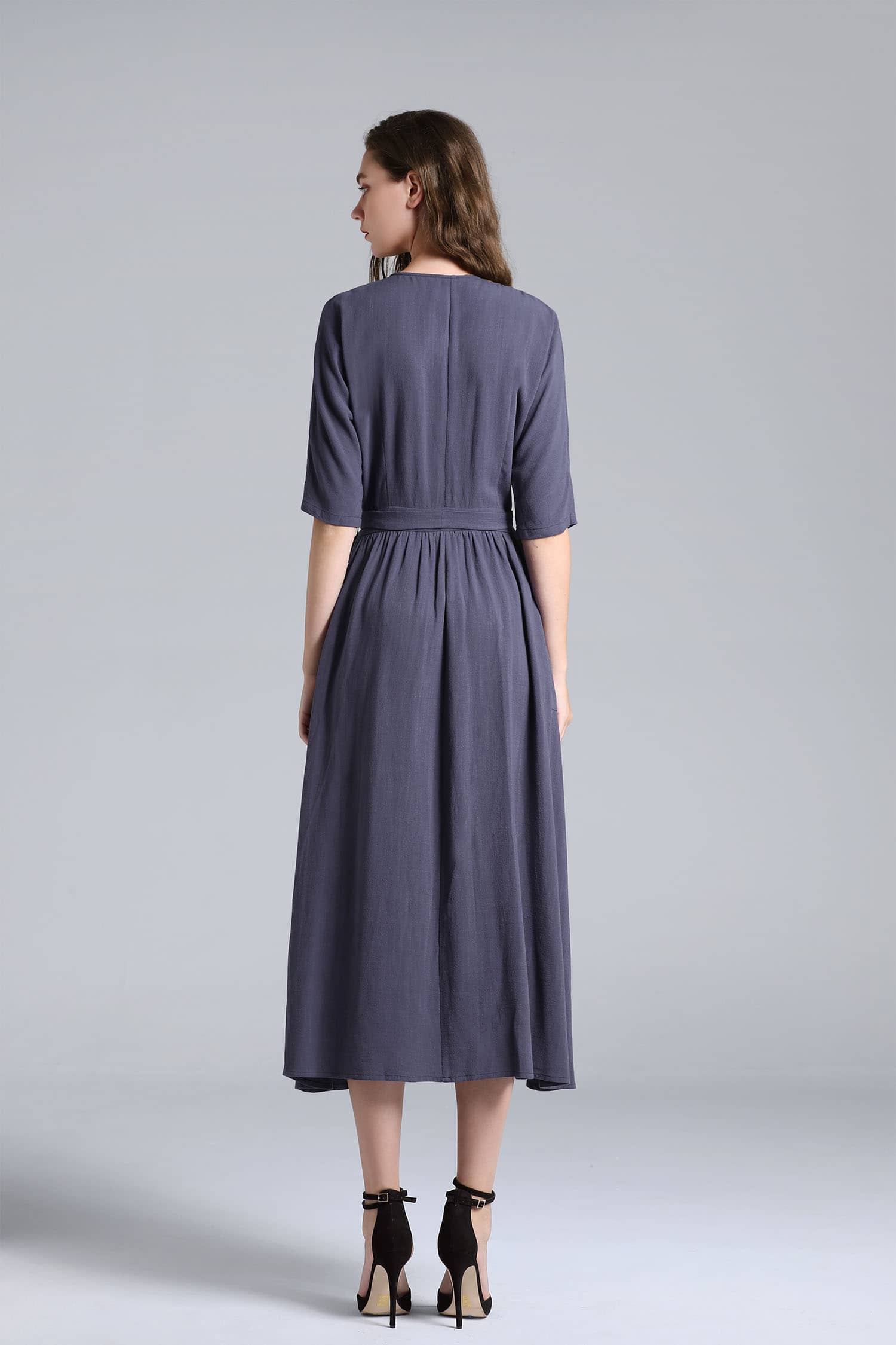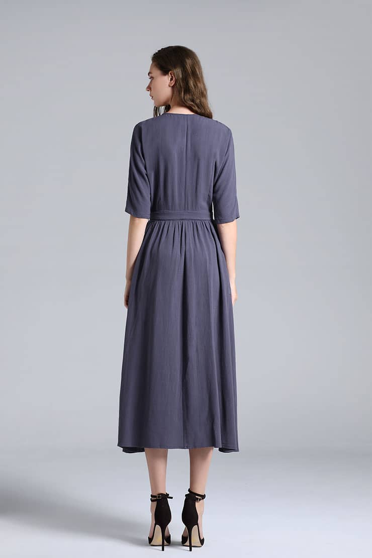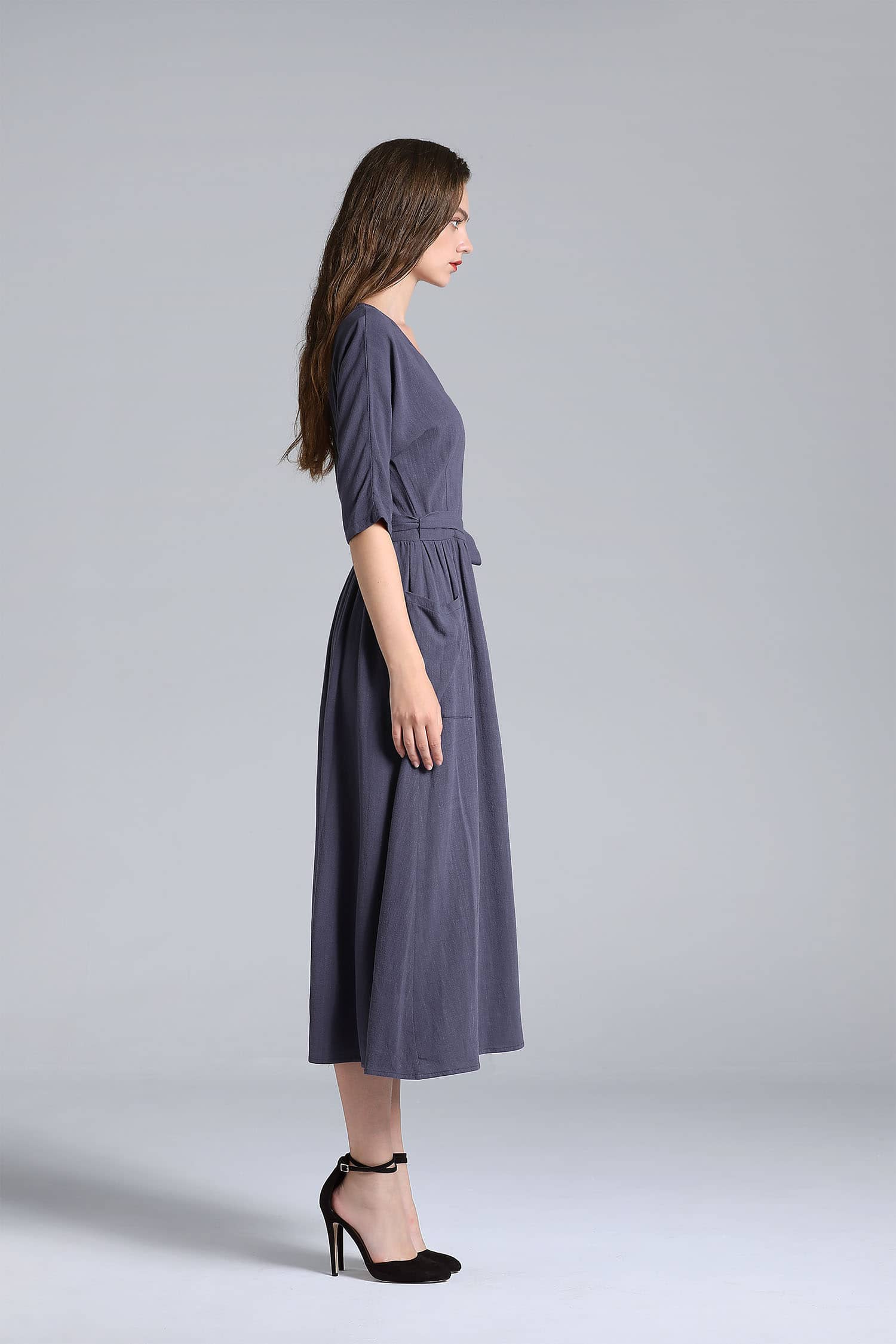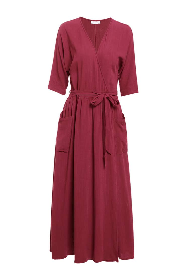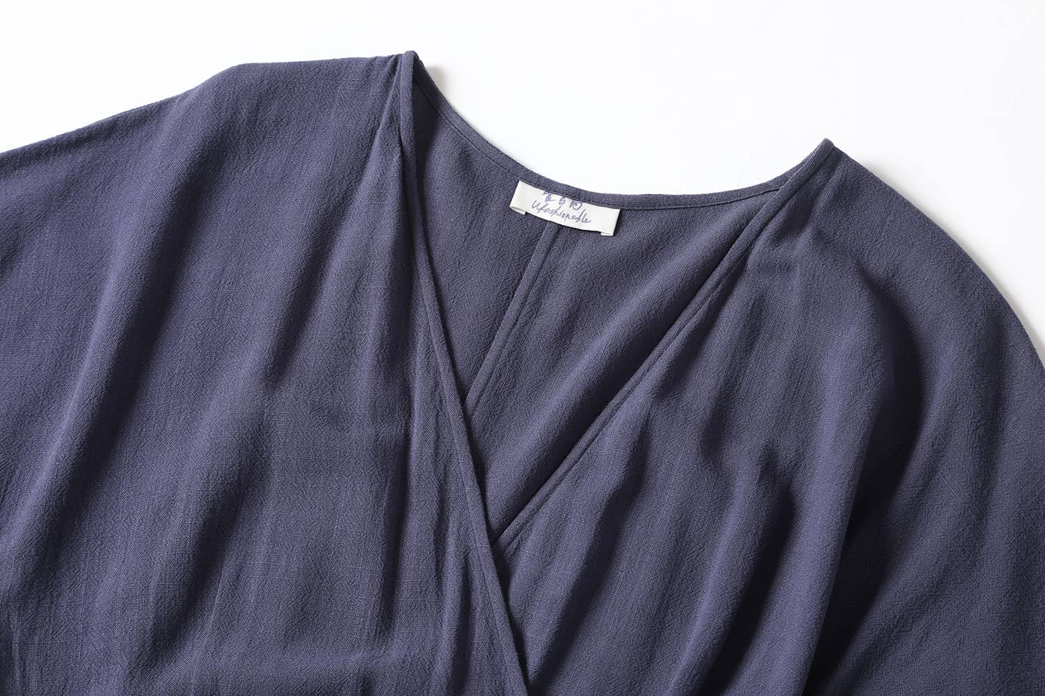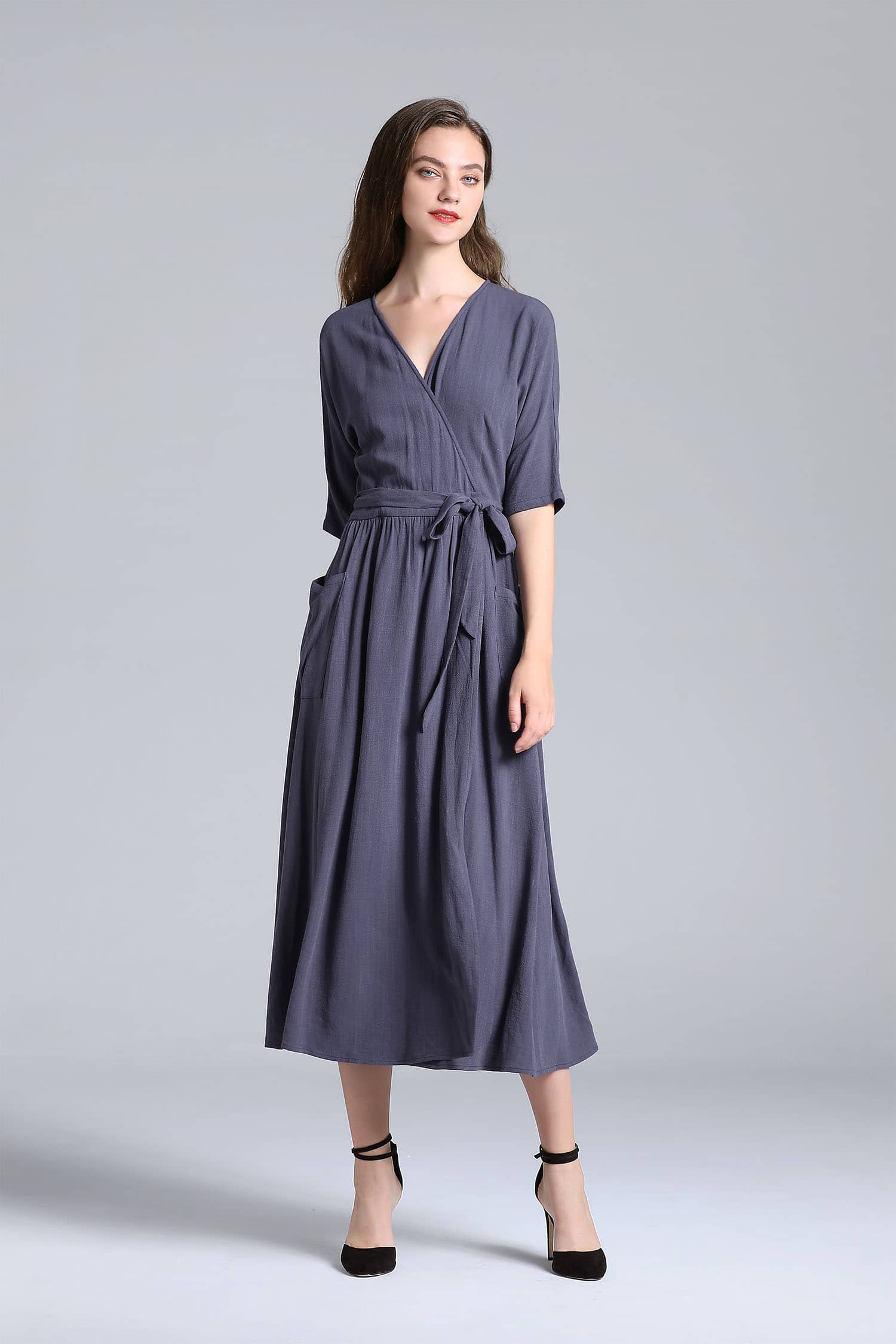 交叉式V领,连肩中袖,抽褶A型裙摆,前侧大贴袋,腰间设有绑带束腰,呈现出自然极简气场