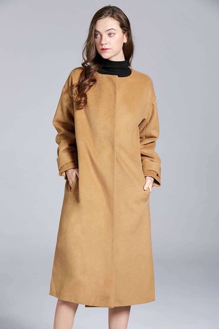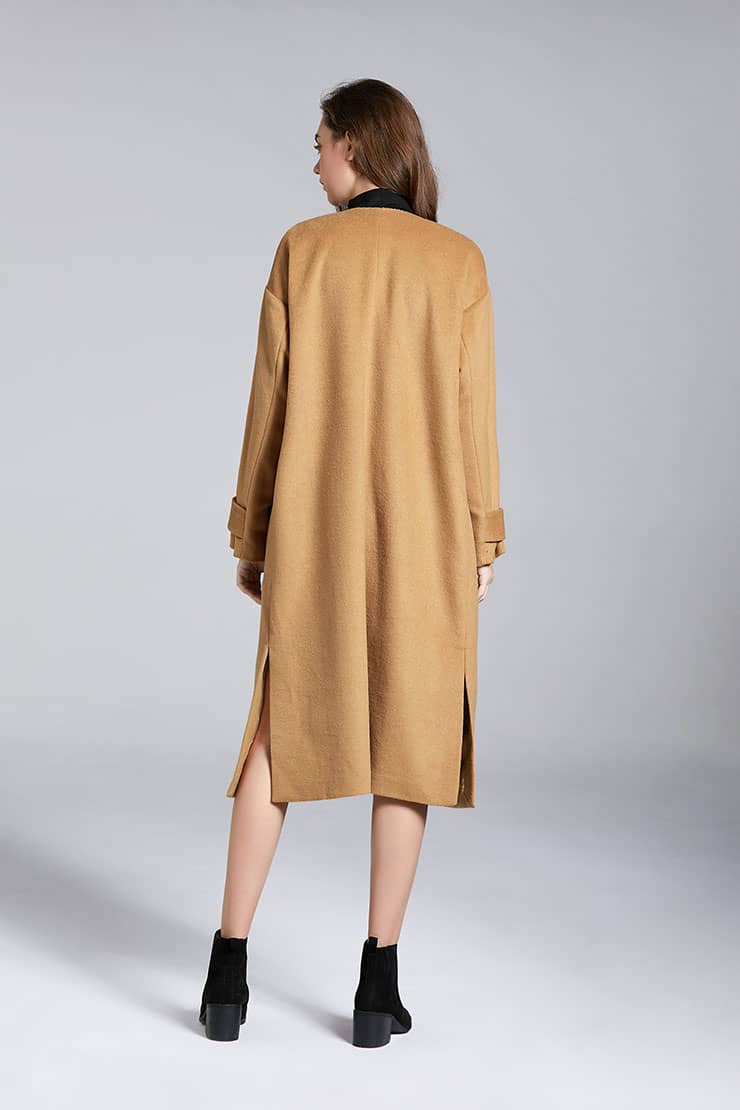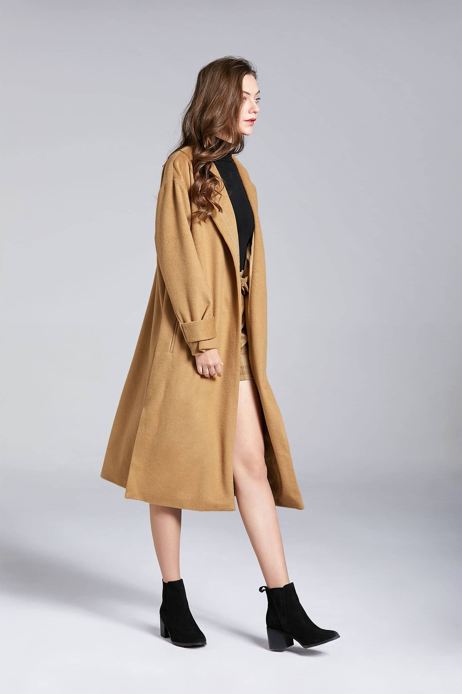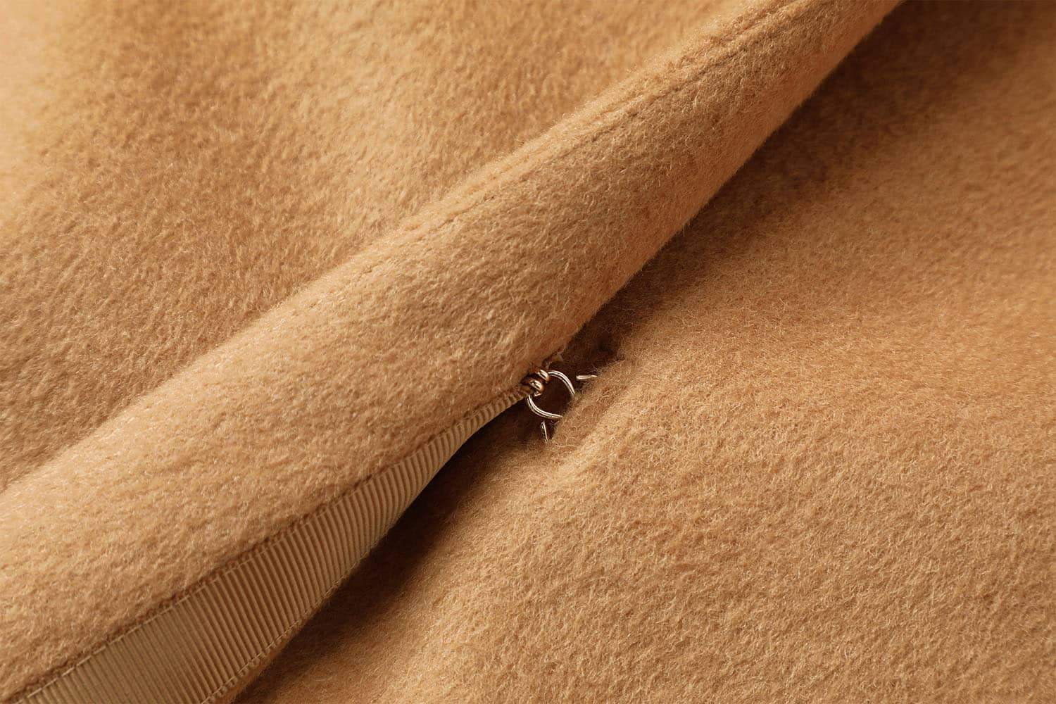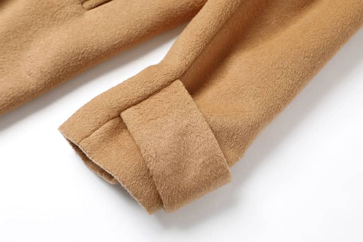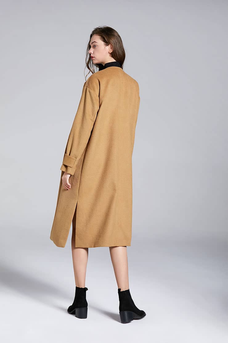 圆领,别致单钩扣宽门襟,袖口加袖袢落肩袖,下摆侧开衩,造型立体美观;柔软细腻的毛呢面料,造型挺括,穿着舒适。