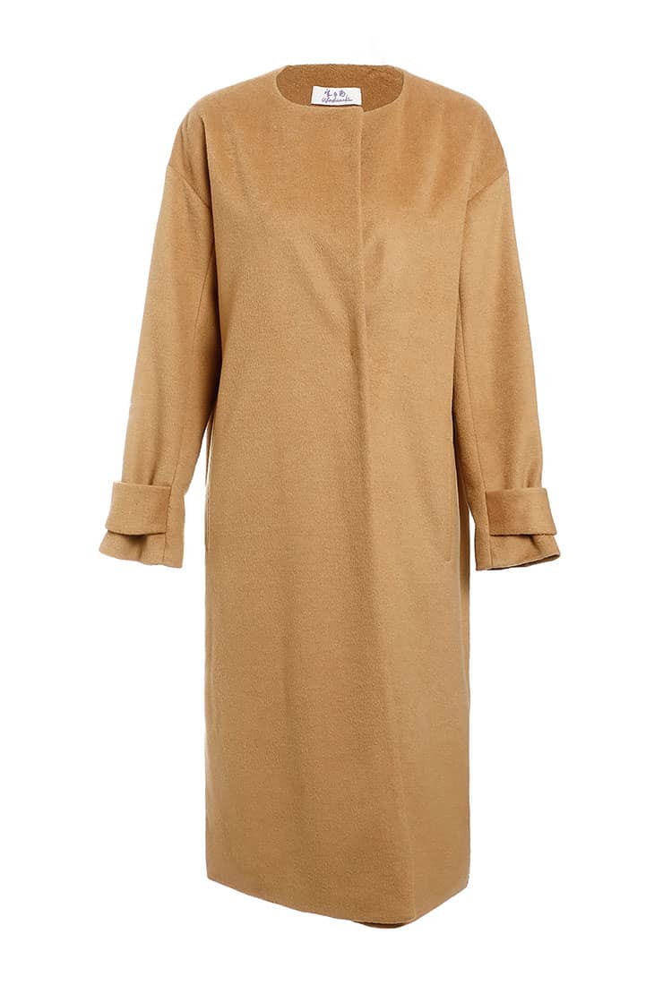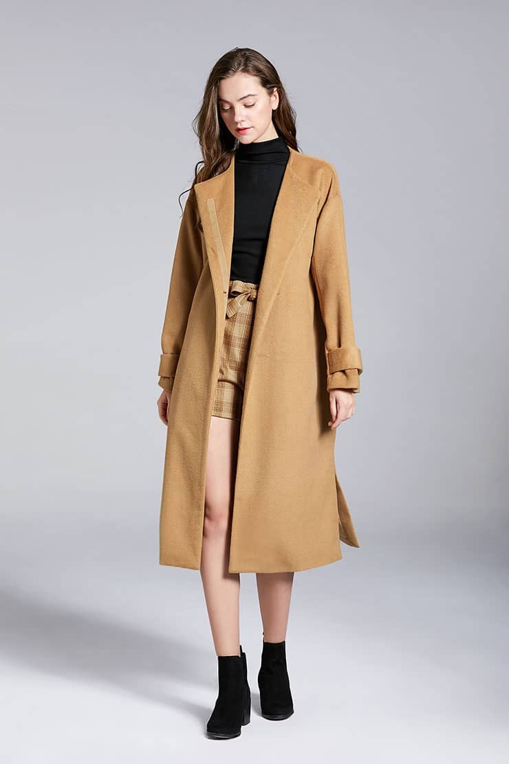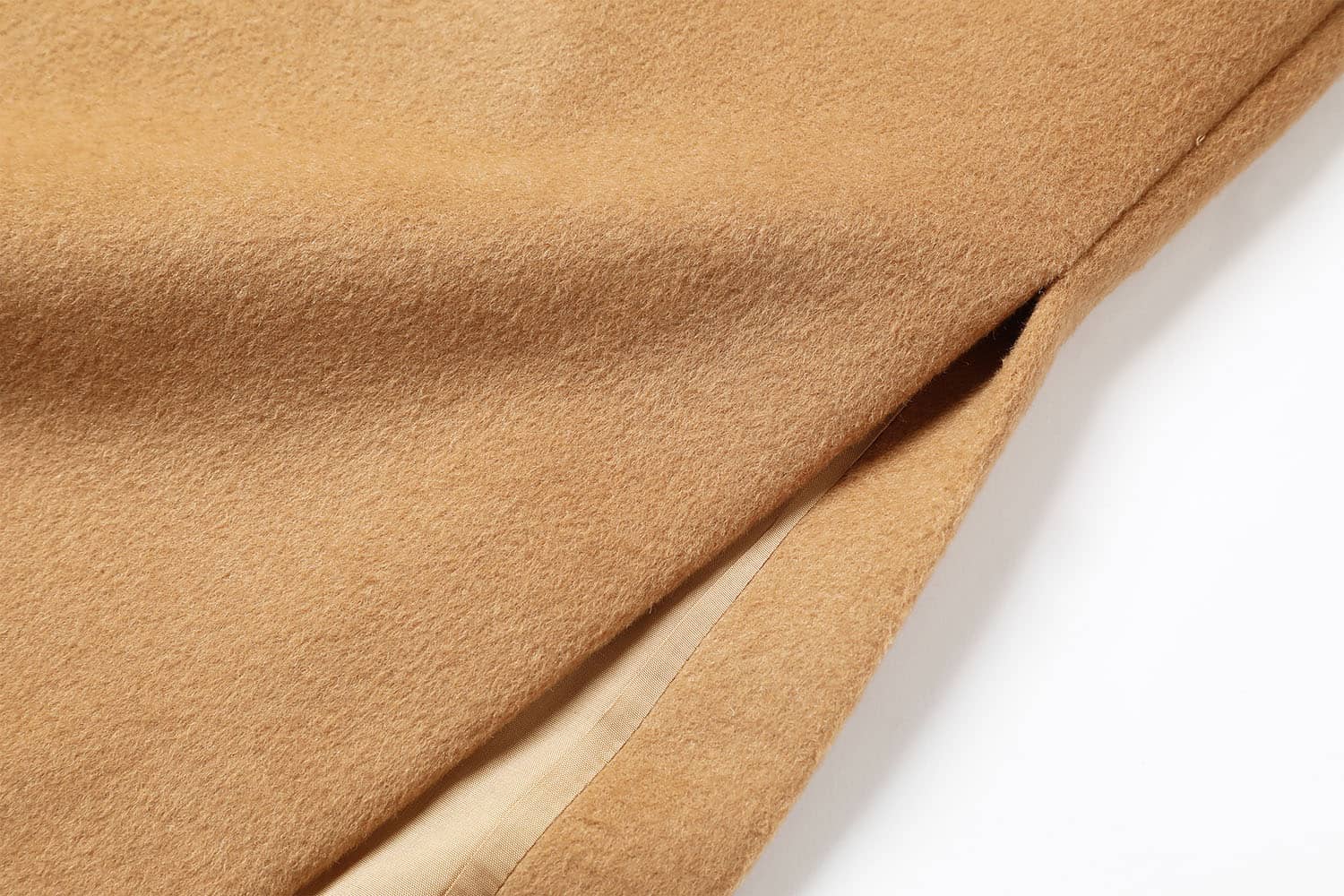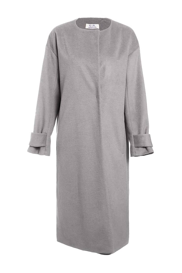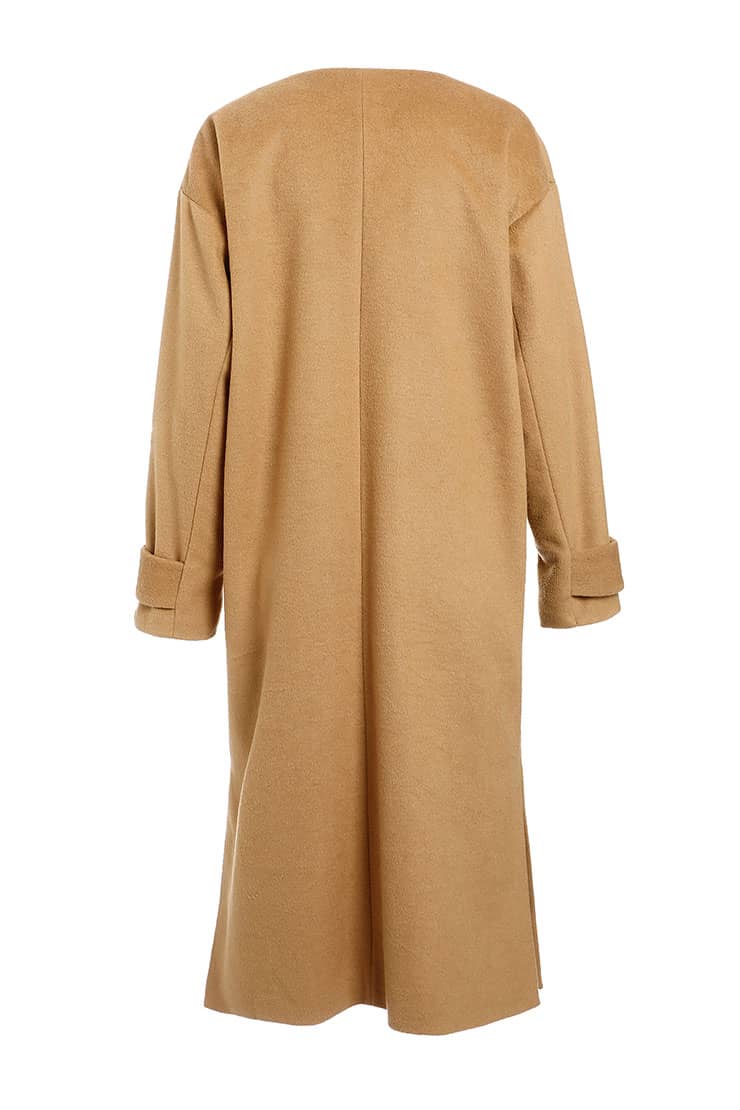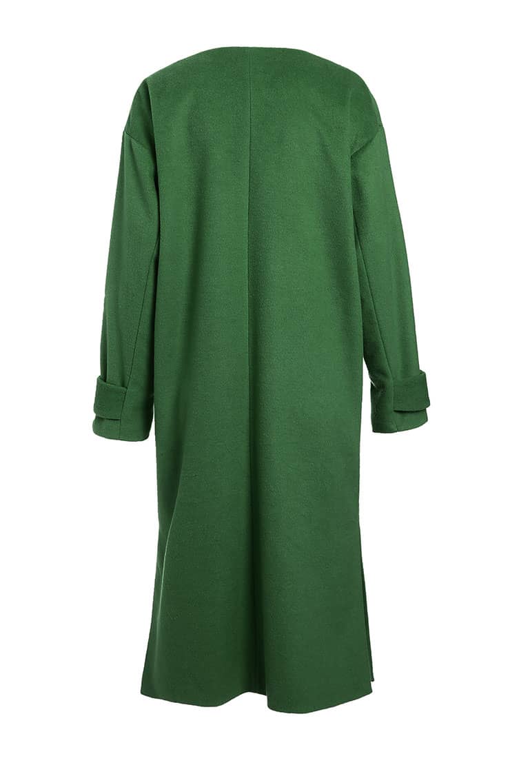 圆领,别致单钩扣宽门襟,袖口加袖袢落肩袖,下摆侧开衩,造型立体美观;柔软细腻的毛呢面料,造型挺括,穿着舒适。