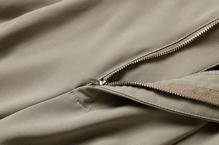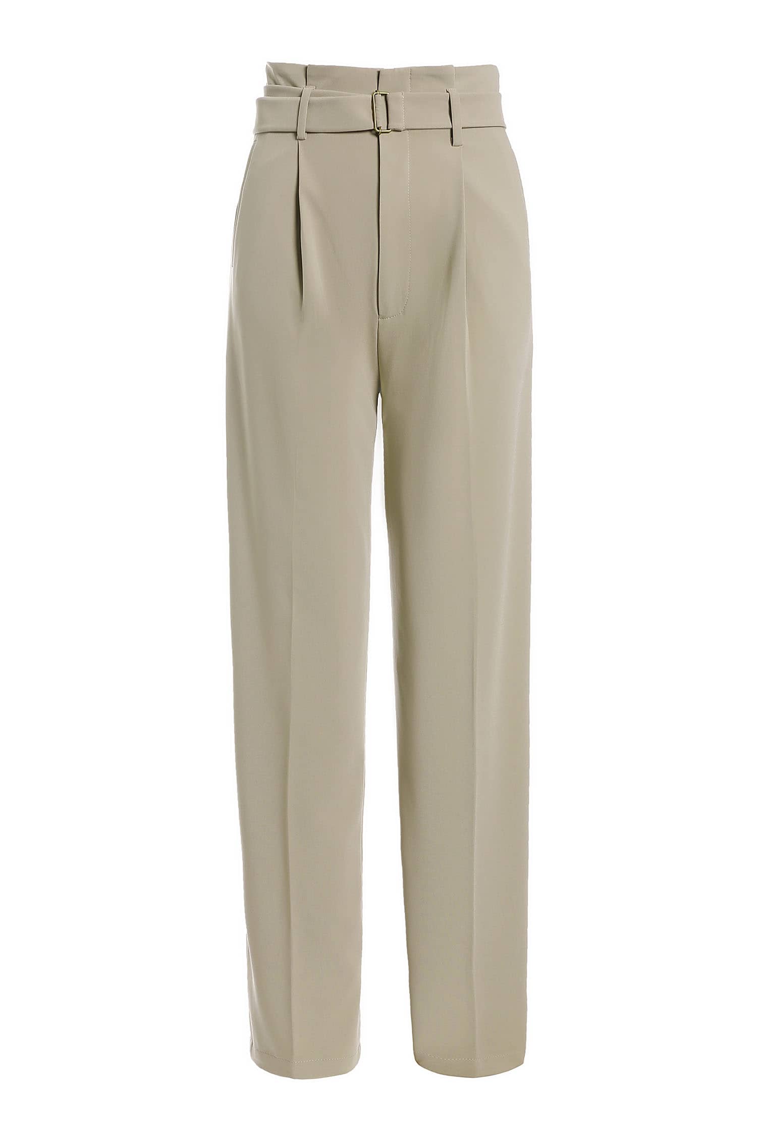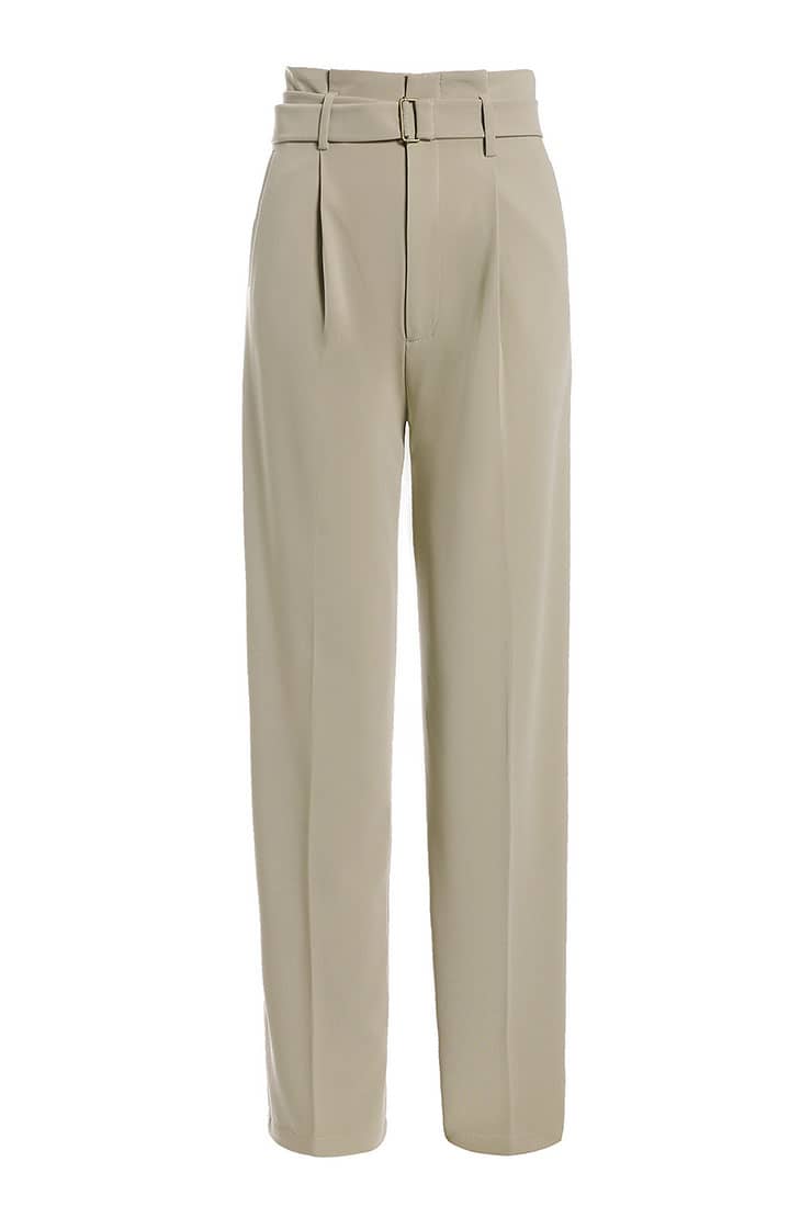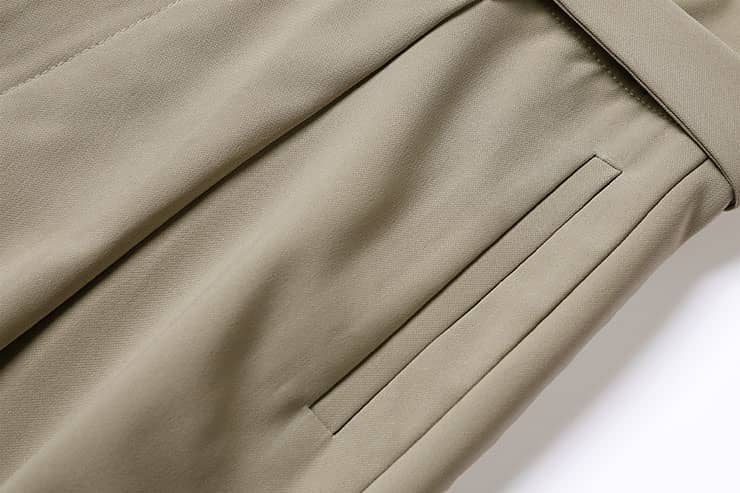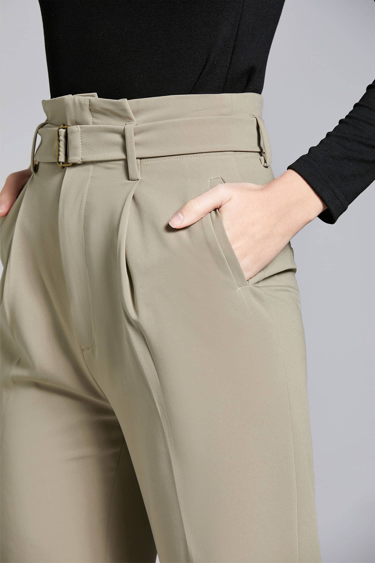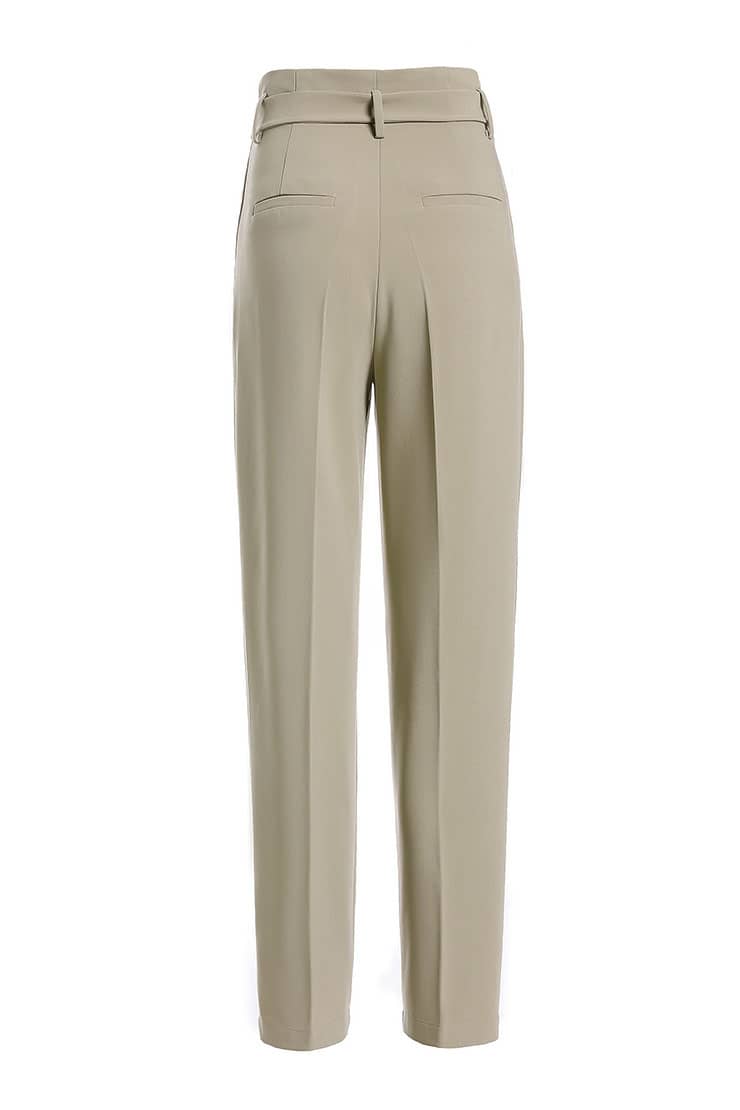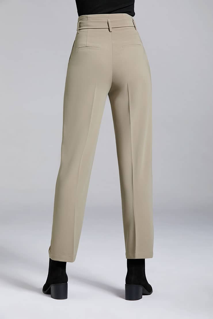 单裥褶高连腰,前开襟,两侧设有手插袋,同色系腰带装饰;九分裤长,合体锥形廓形,立体显瘦,时尚雅致;梭织面料,布面肌理感强,耐穿易打理。