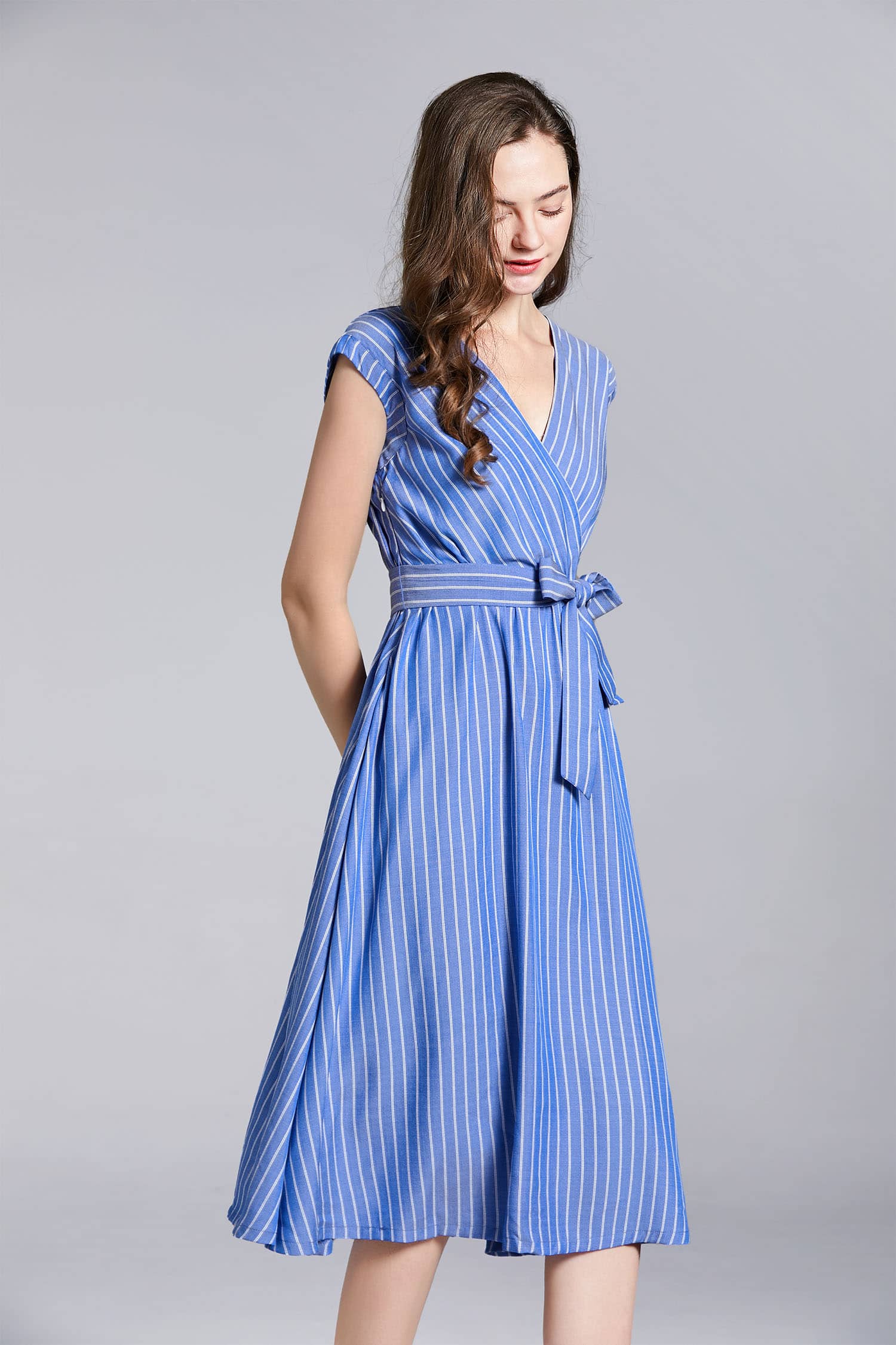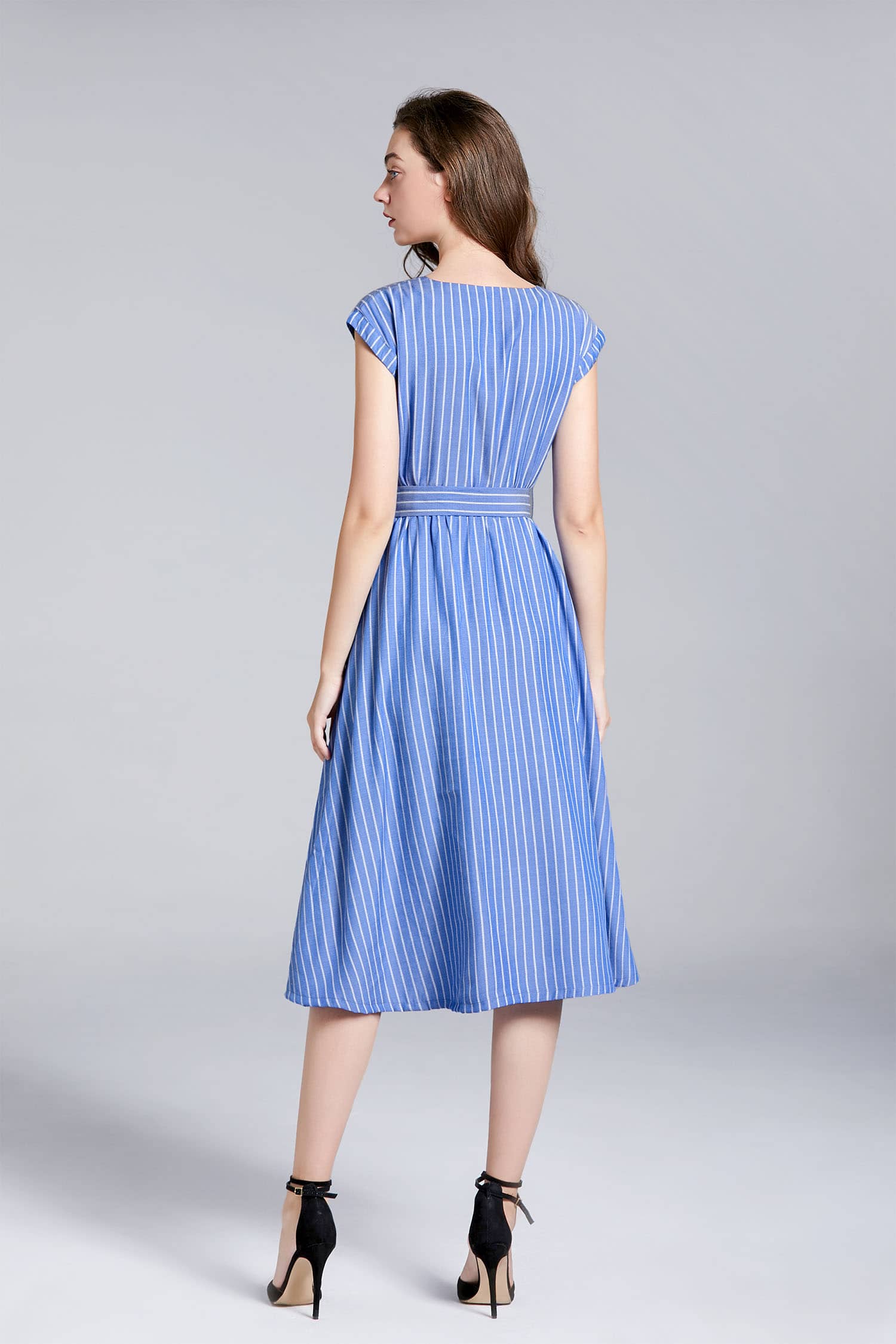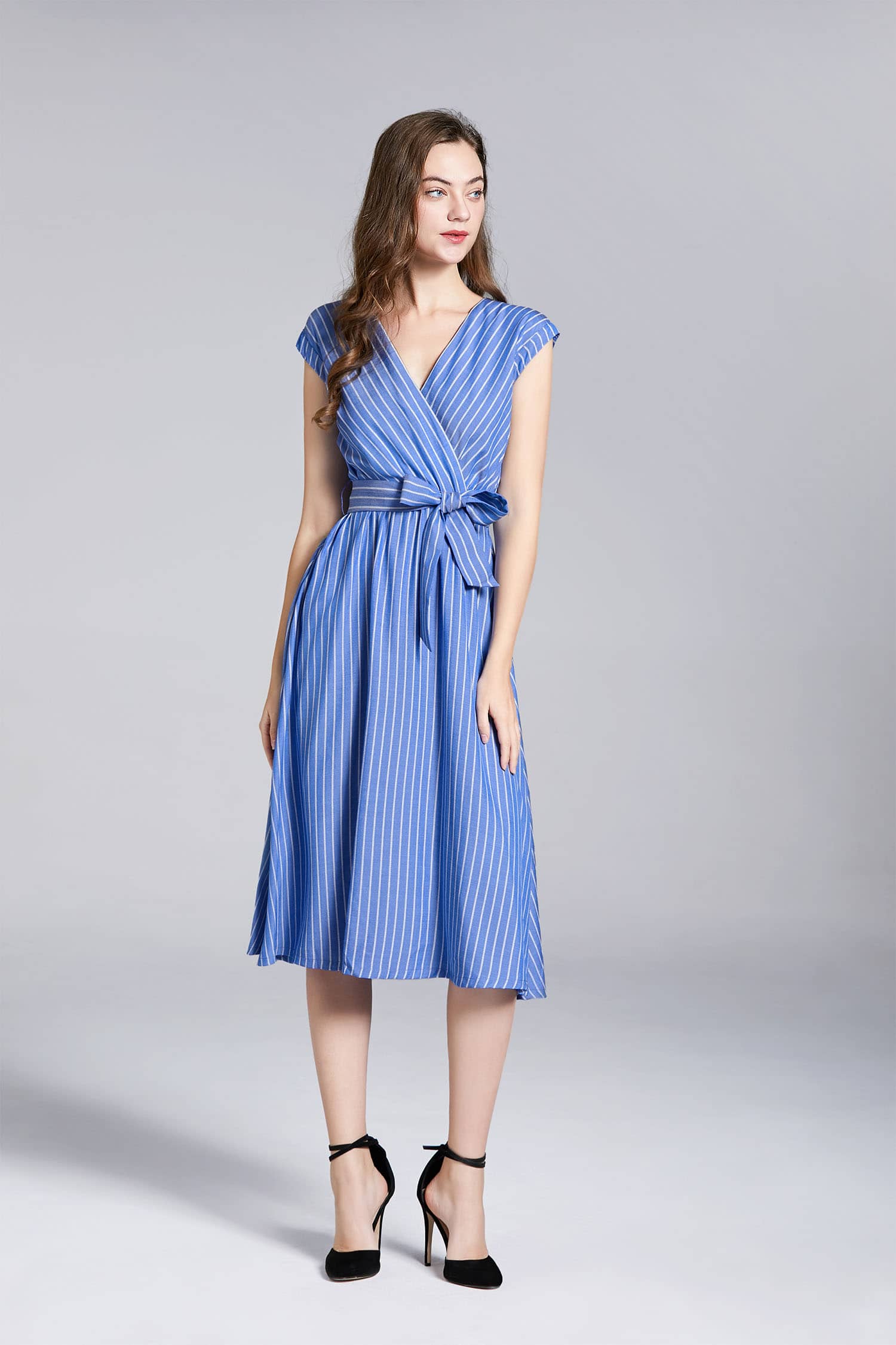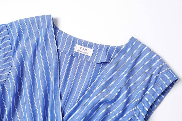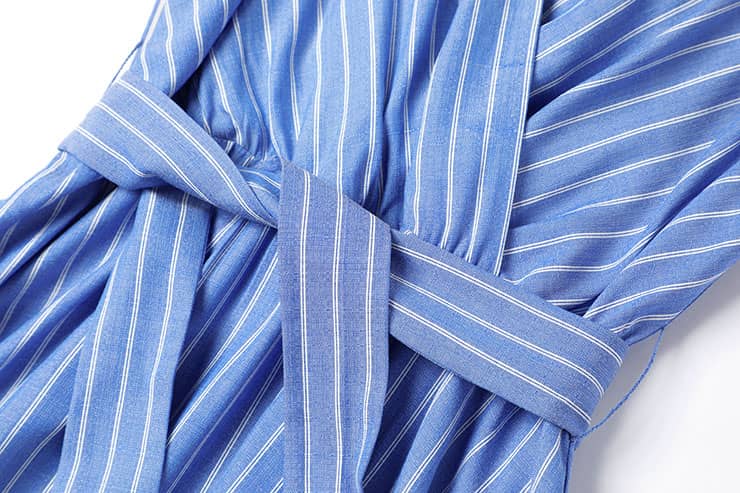 V领交叠门襟,落肩无袖,碎褶收腰,A型荷叶裙摆;配送本布腰带,勾勒腰线,修饰身材比例;及膝A摆合身收腰廓形,蓝白相间条纹,跃动新鲜活力。