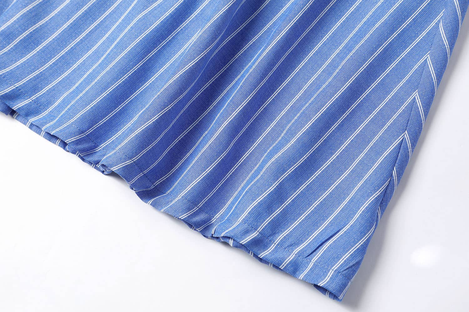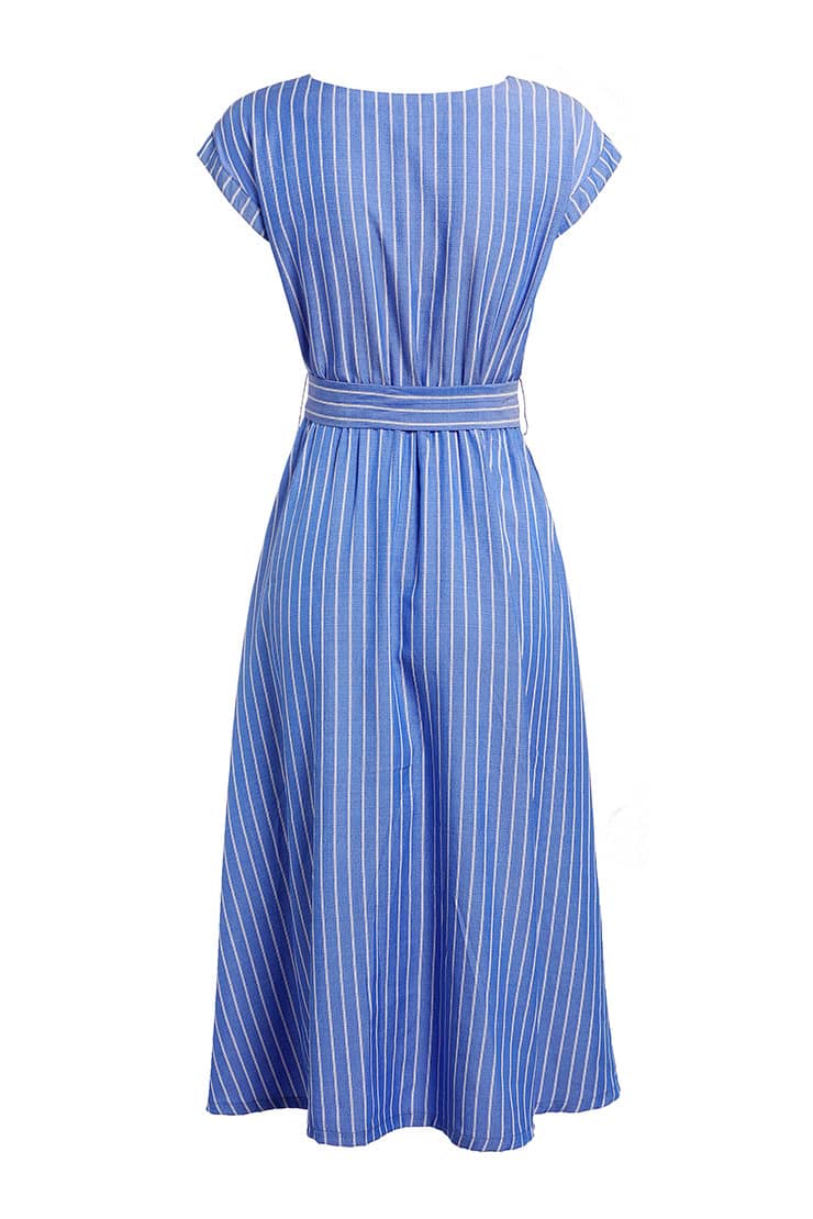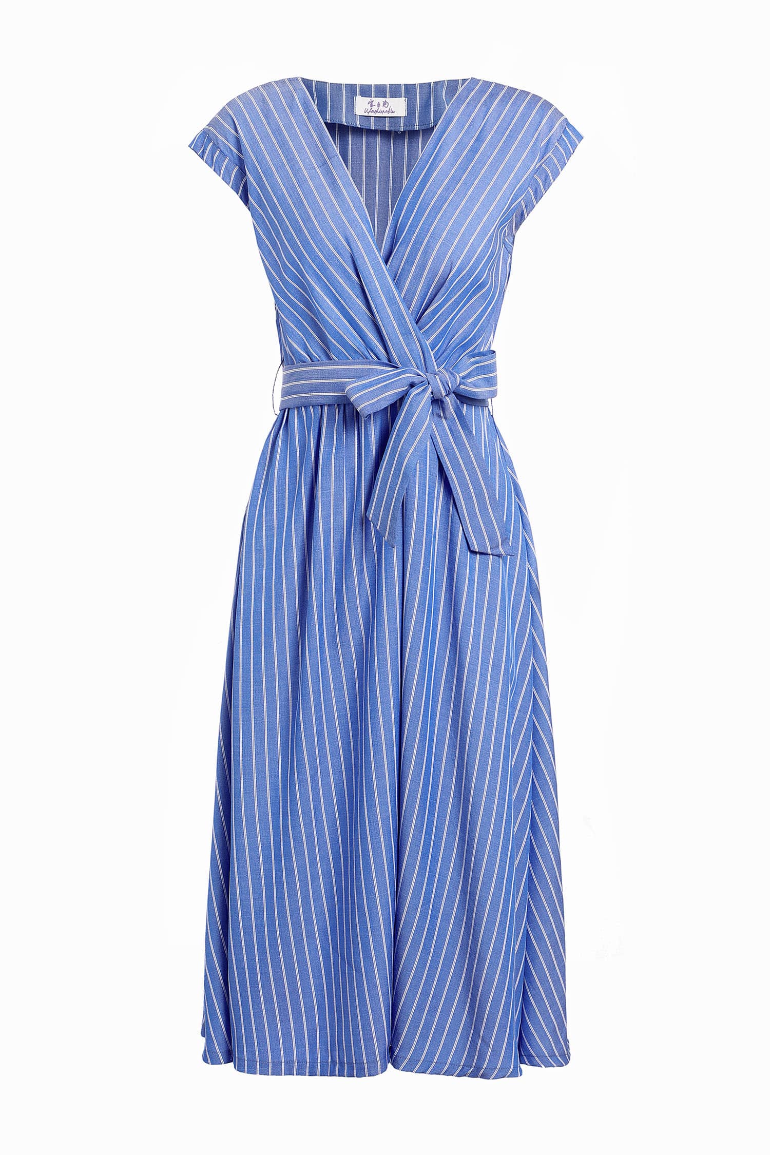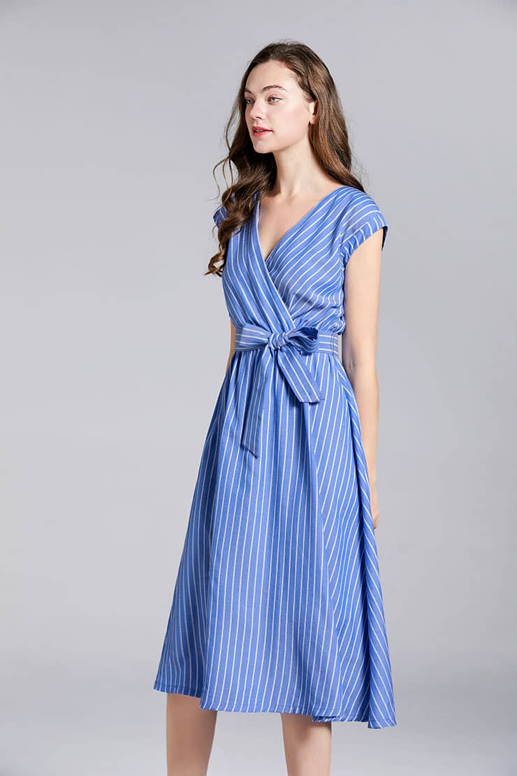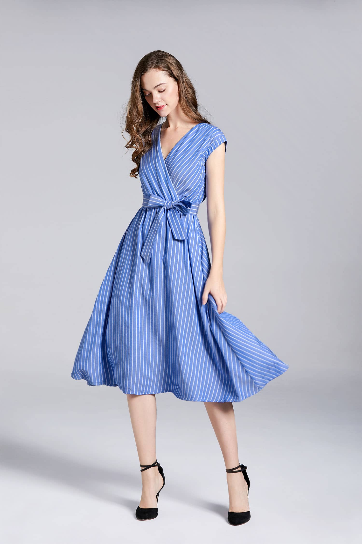 V领交叠门襟,落肩无袖,碎褶收腰,A型荷叶裙摆;配送本布腰带,勾勒腰线,修饰身材比例;及膝A摆合身收腰廓形,蓝白相间条纹,跃动新鲜活力。