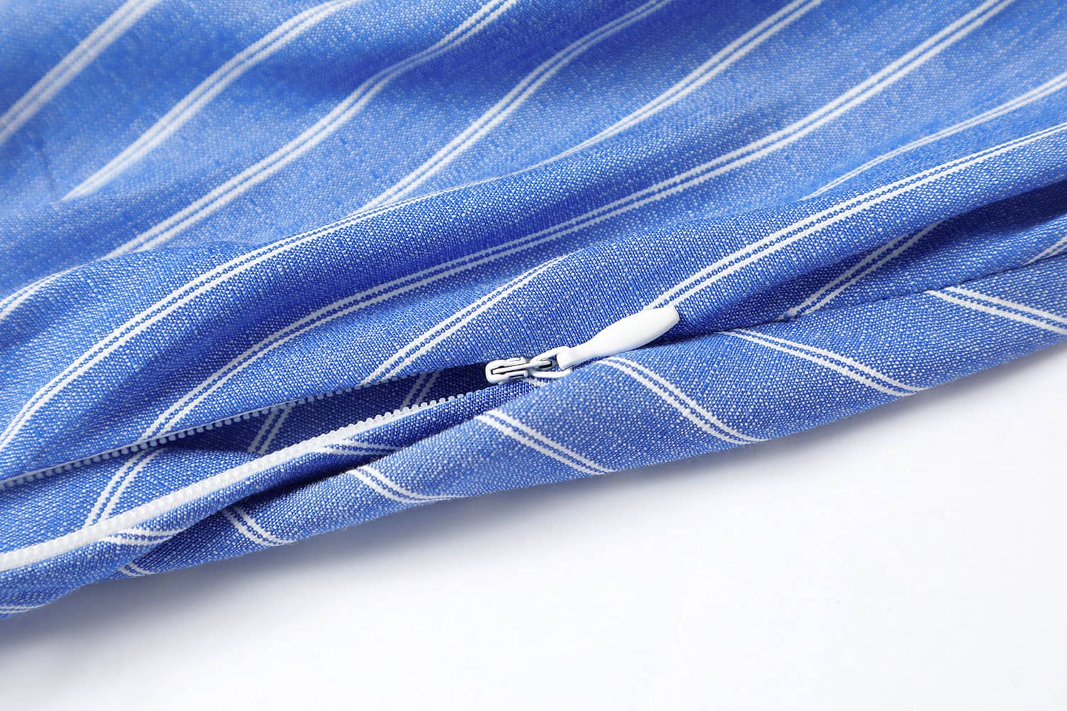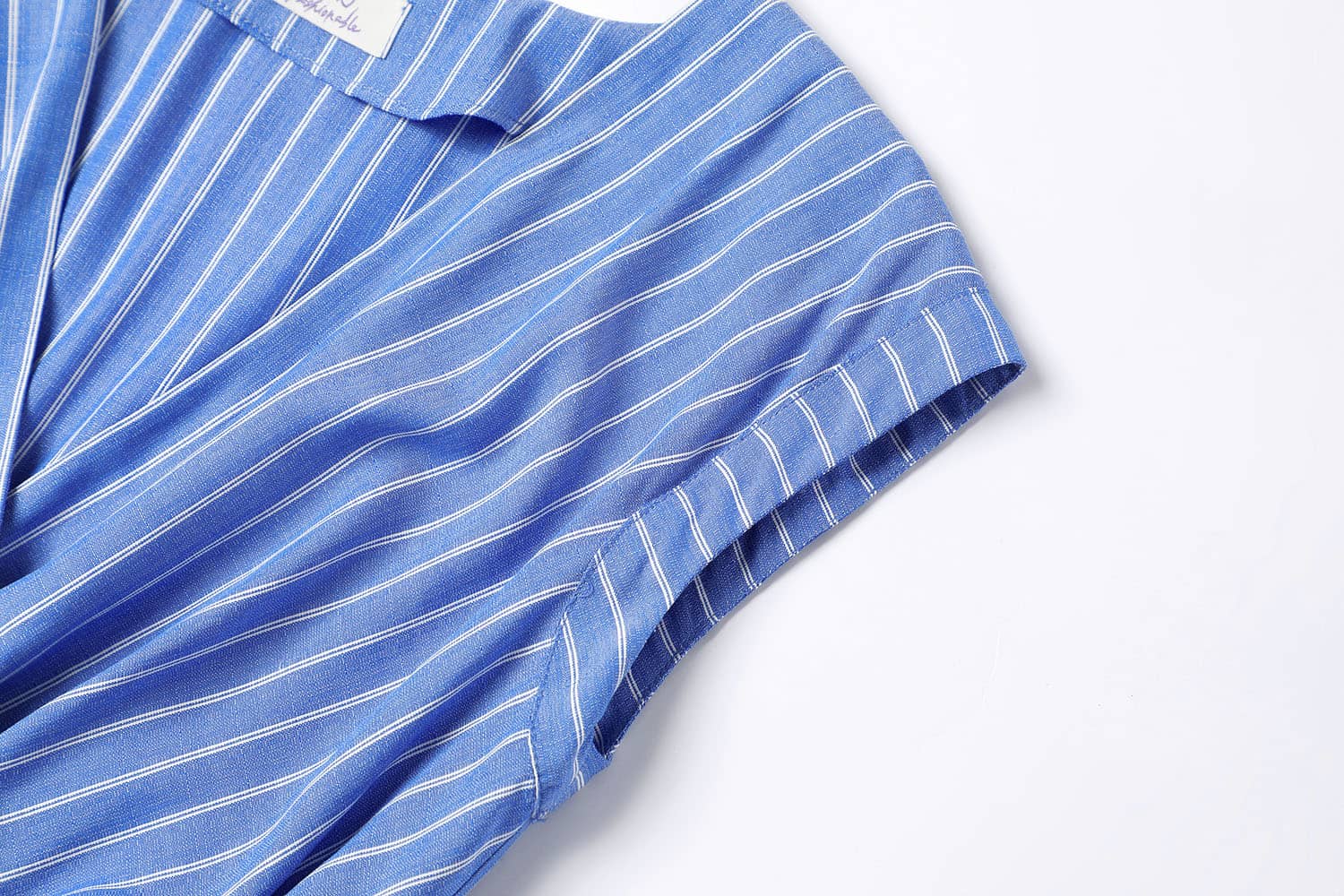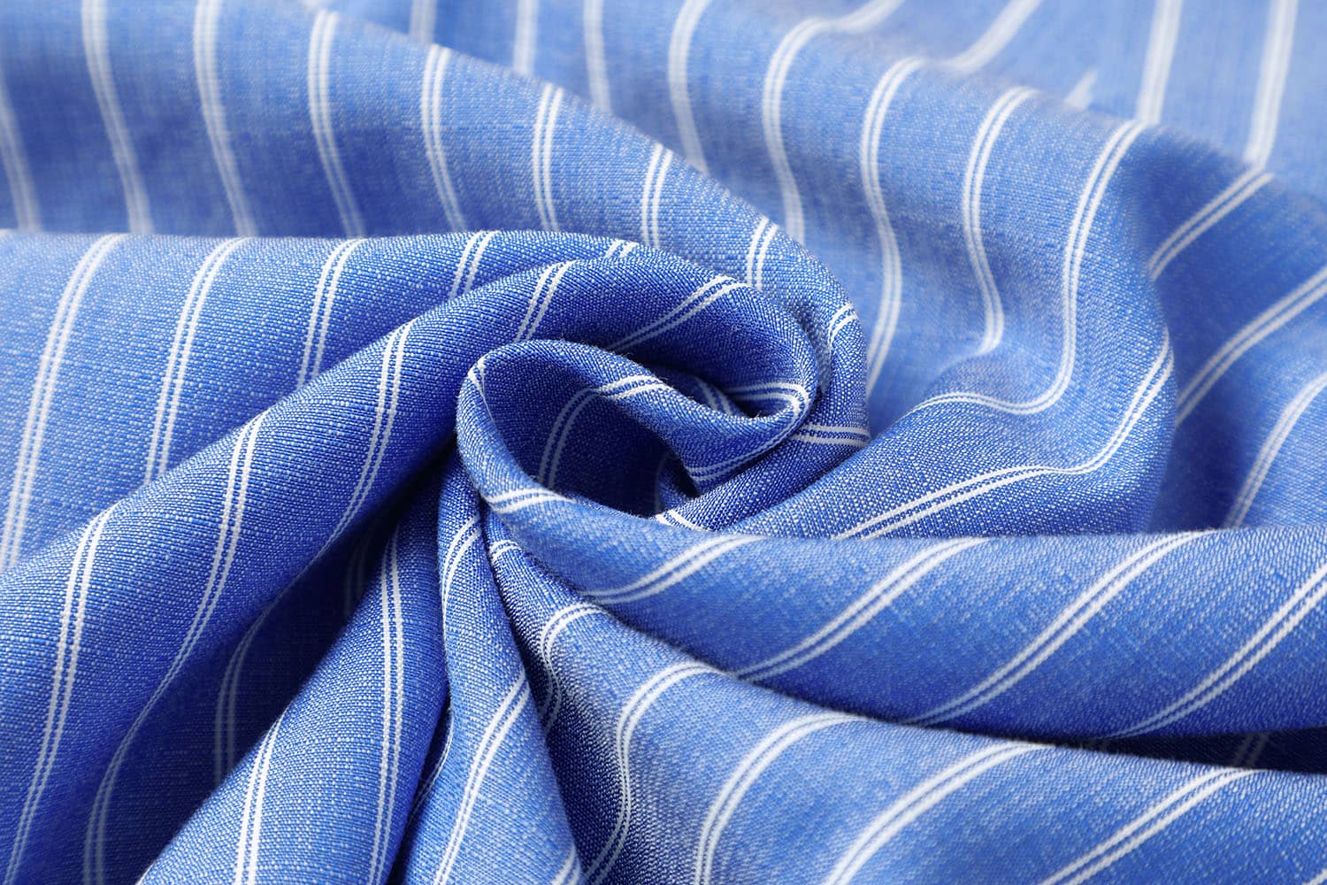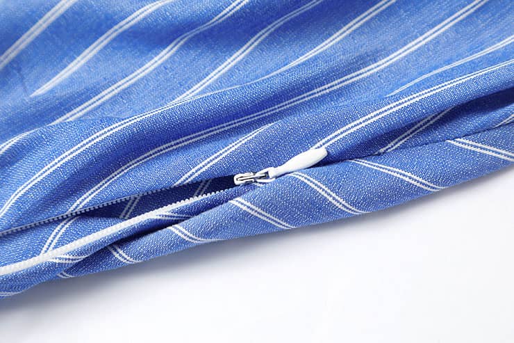 V领交叠门襟,落肩无袖,碎褶收腰,A型荷叶裙摆;配送本布腰带,勾勒腰线,修饰身材比例;及膝A摆合身收腰廓形,蓝白相间条纹,跃动新鲜活力。