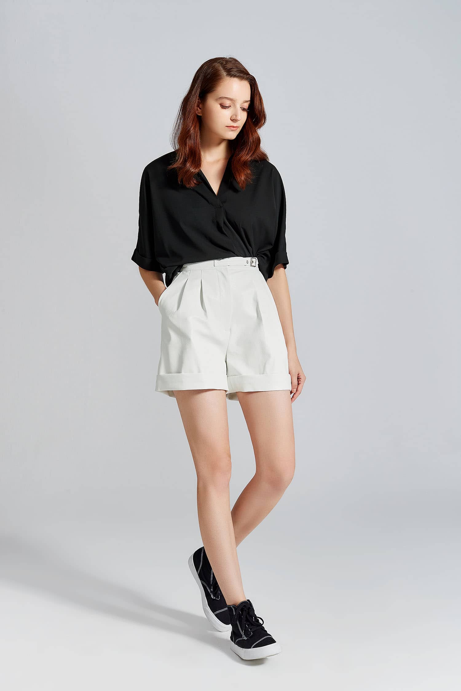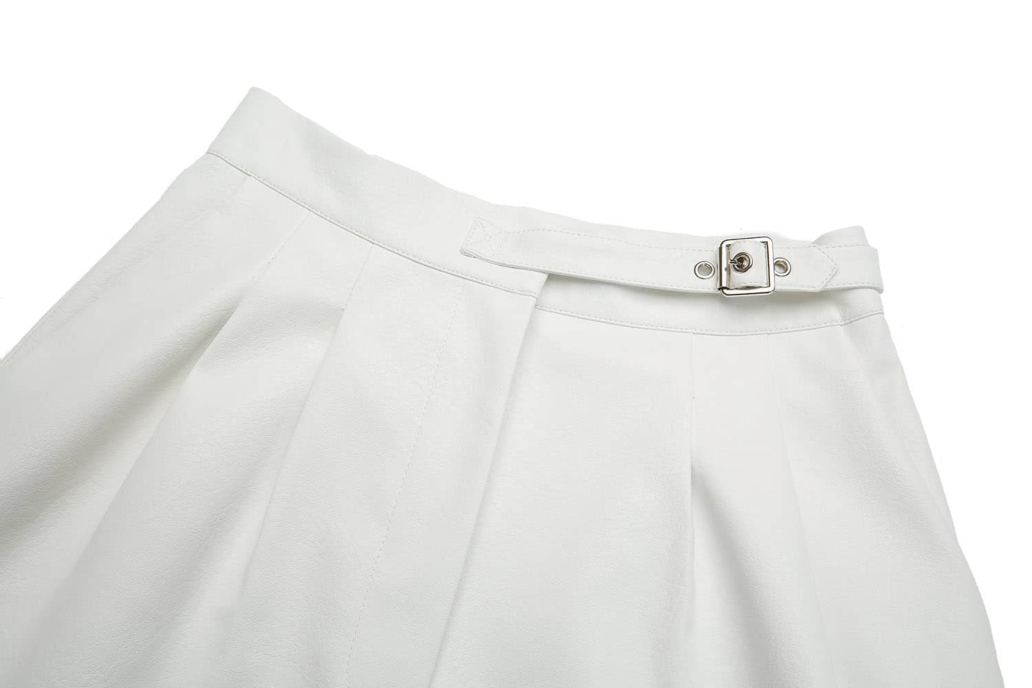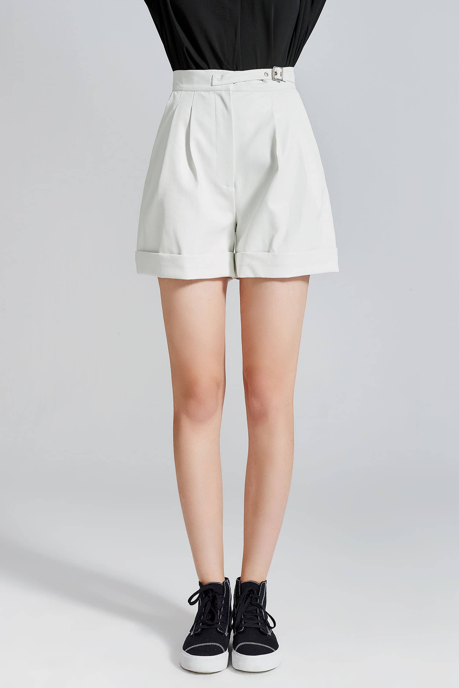 简约直腰,前腰间活动系带,别致实用;侧边斜插袋,前片立体双褶裥,宽边翻折脚口;宽松短裤廓形,休闲通勤两相宜; 布底PU皮革面料,纹理清晰,穿着舒适透气