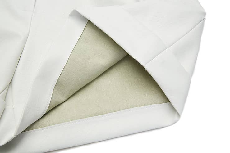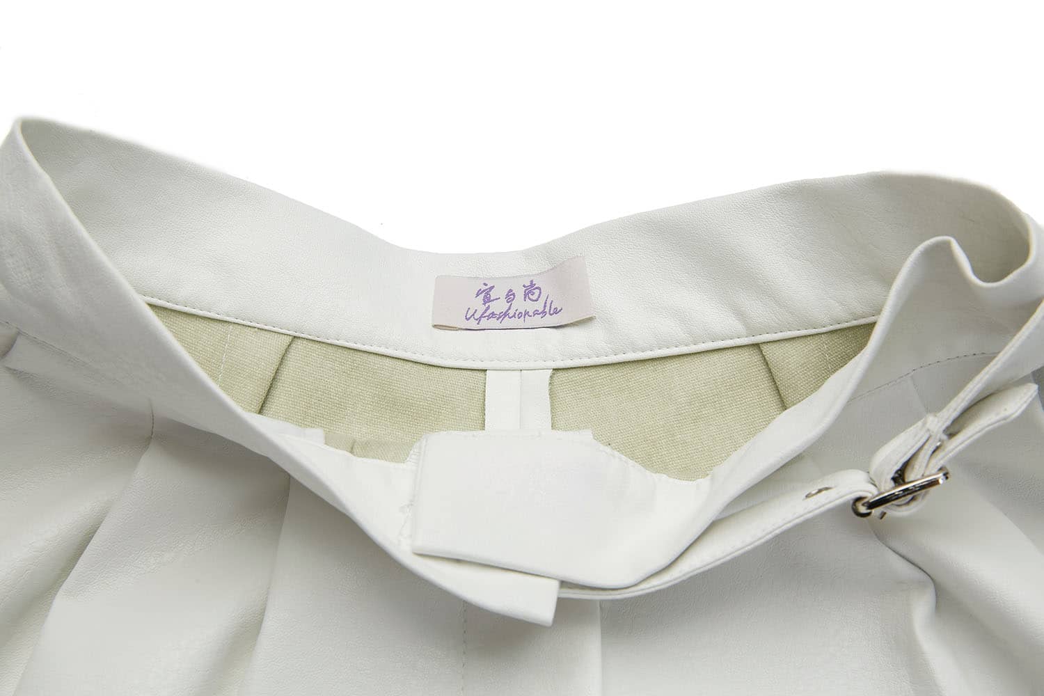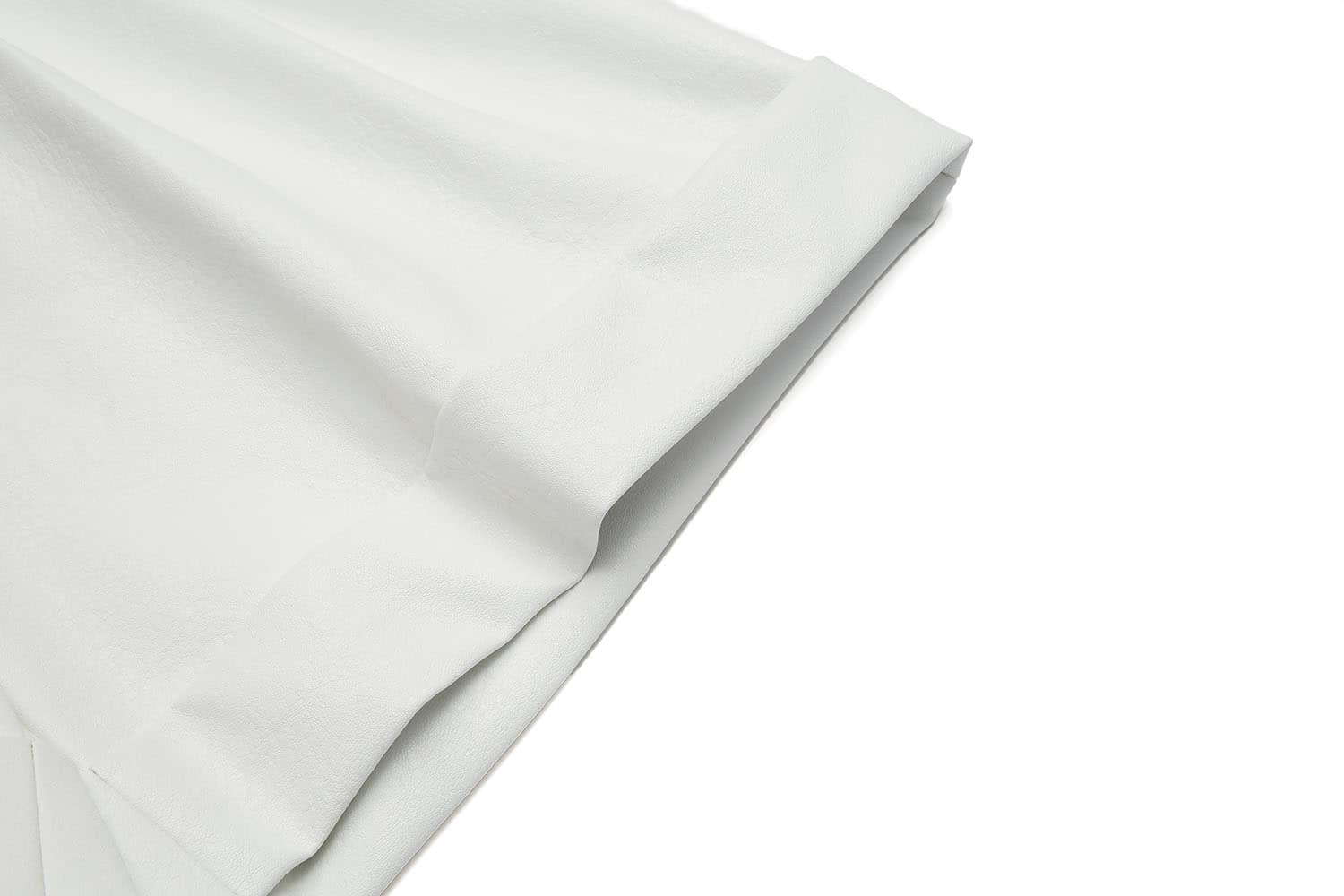 简约直腰,前腰间活动系带,别致实用;侧边斜插袋,前片立体双褶裥,宽边翻折脚口;宽松短裤廓形,休闲通勤两相宜; 布底PU皮革面料,纹理清晰,穿着舒适透气