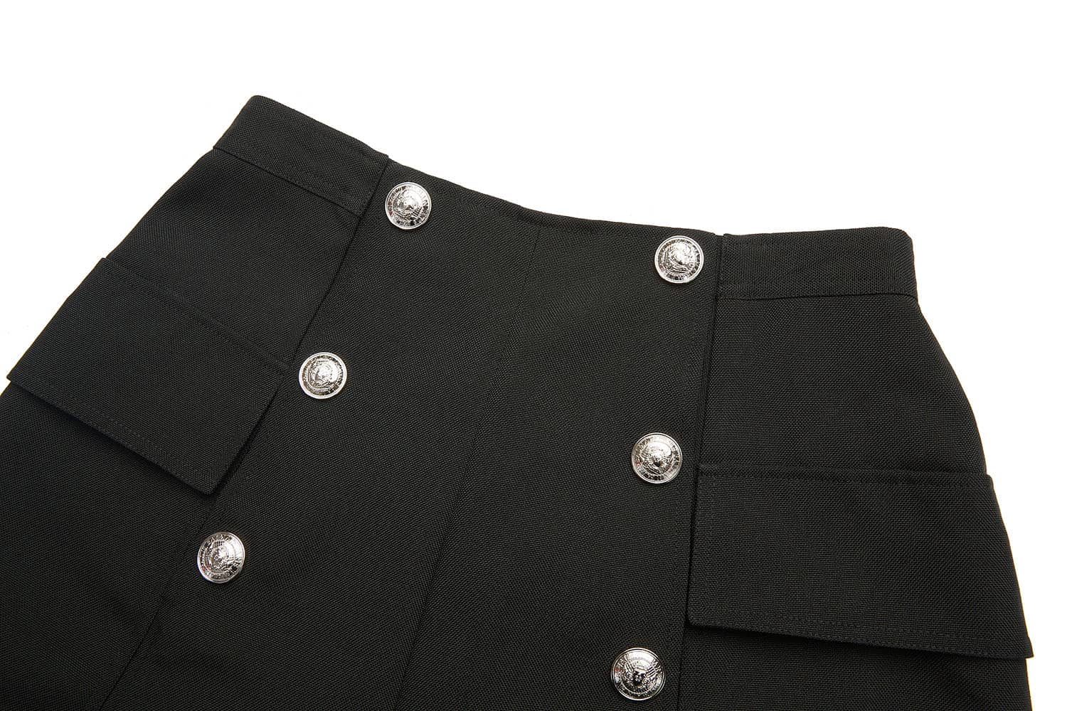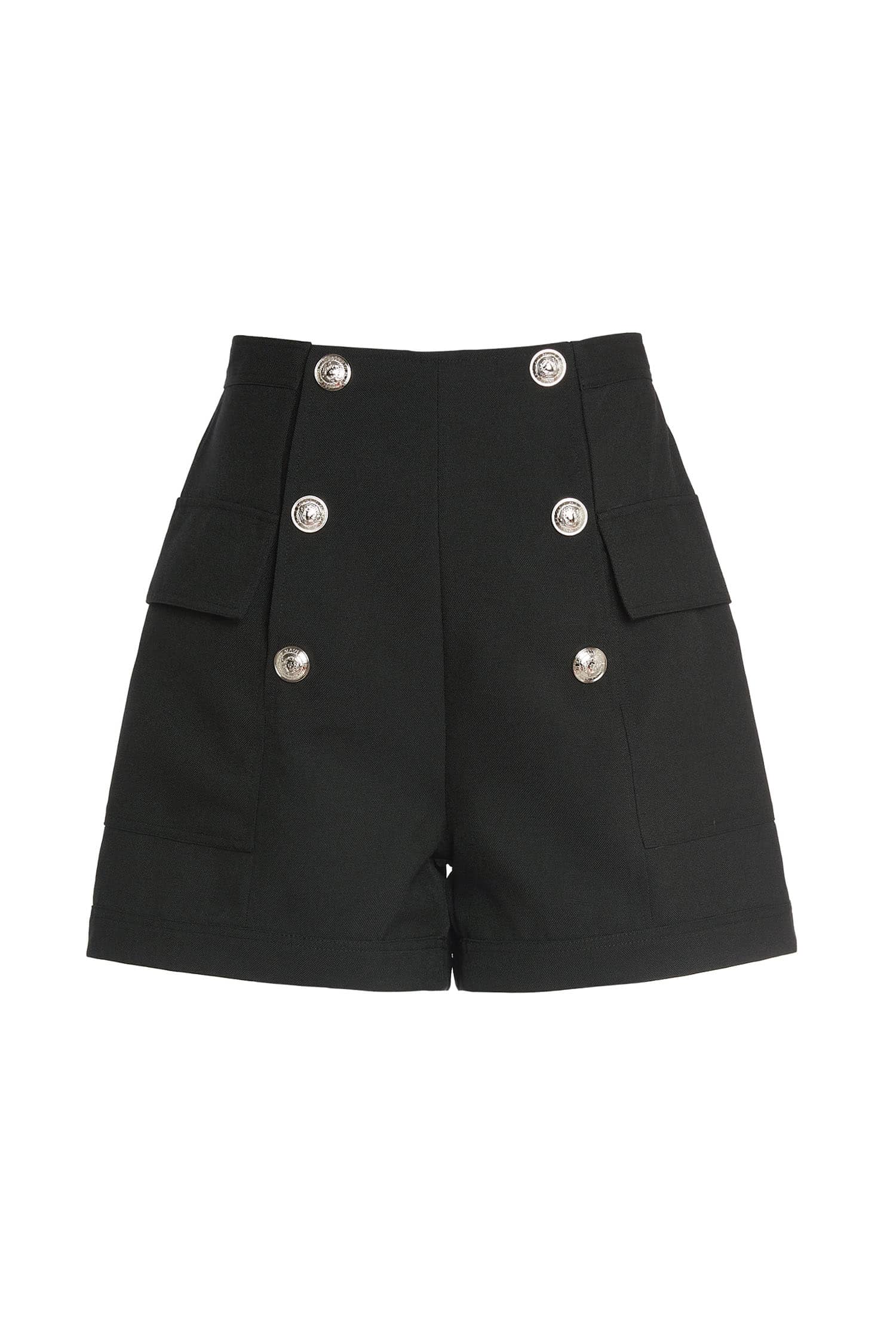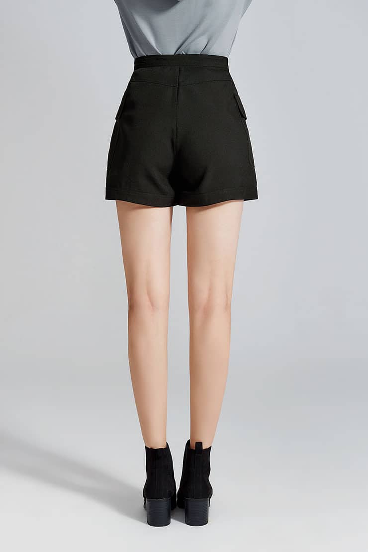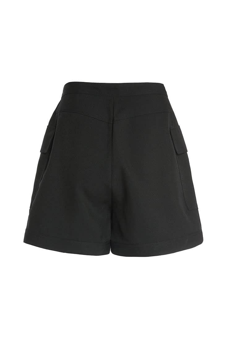前中连腰,两侧大翻盖贴袋,金属四合排扣开缝门襟;合体短裤廓形,精致时髦;面料手感细腻,质感柔韧有型,穿着舒适。