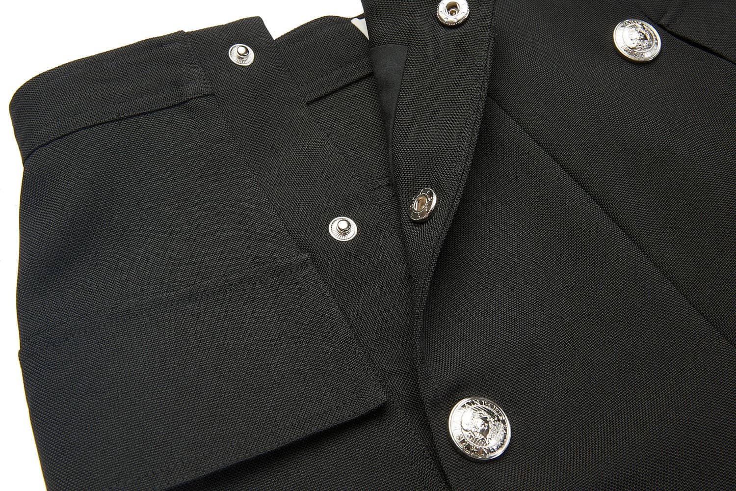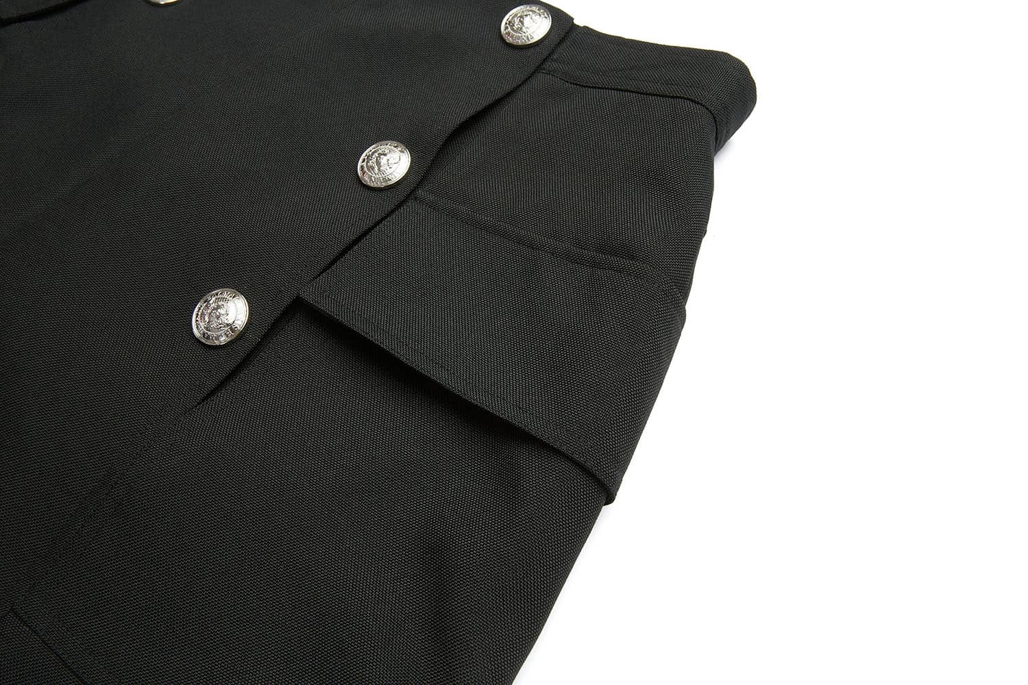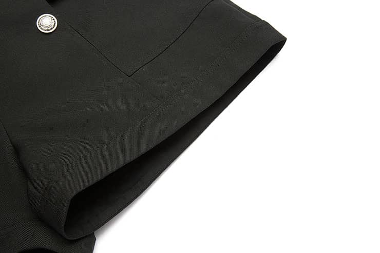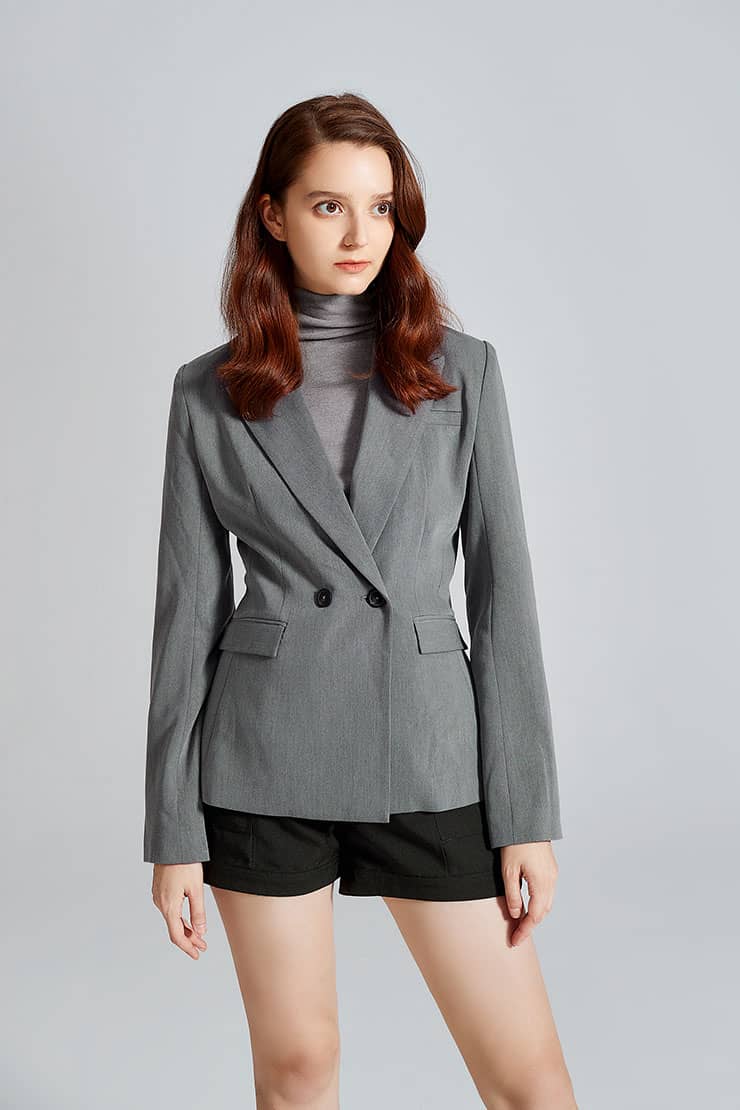 前中连腰,两侧大翻盖贴袋,金属四合排扣开缝门襟;合体短裤廓形,精致时髦;面料手感细腻,质感柔韧有型,穿着舒适。