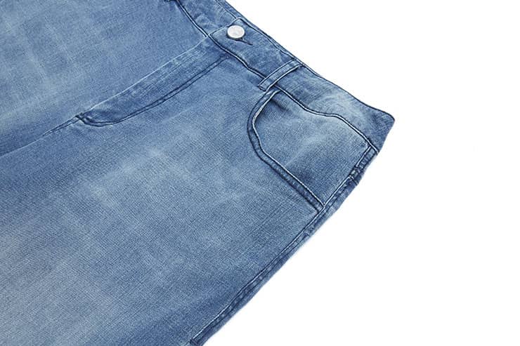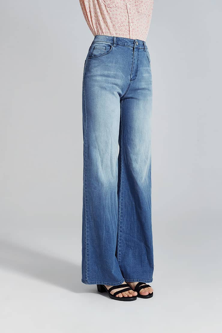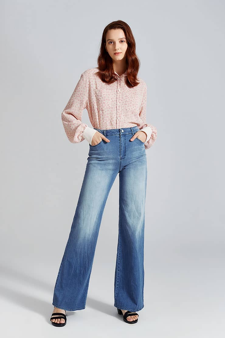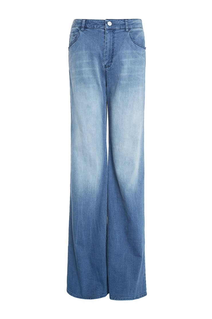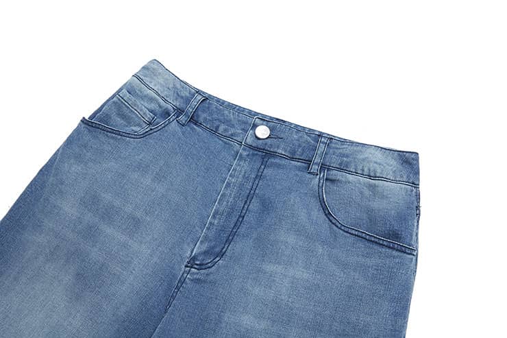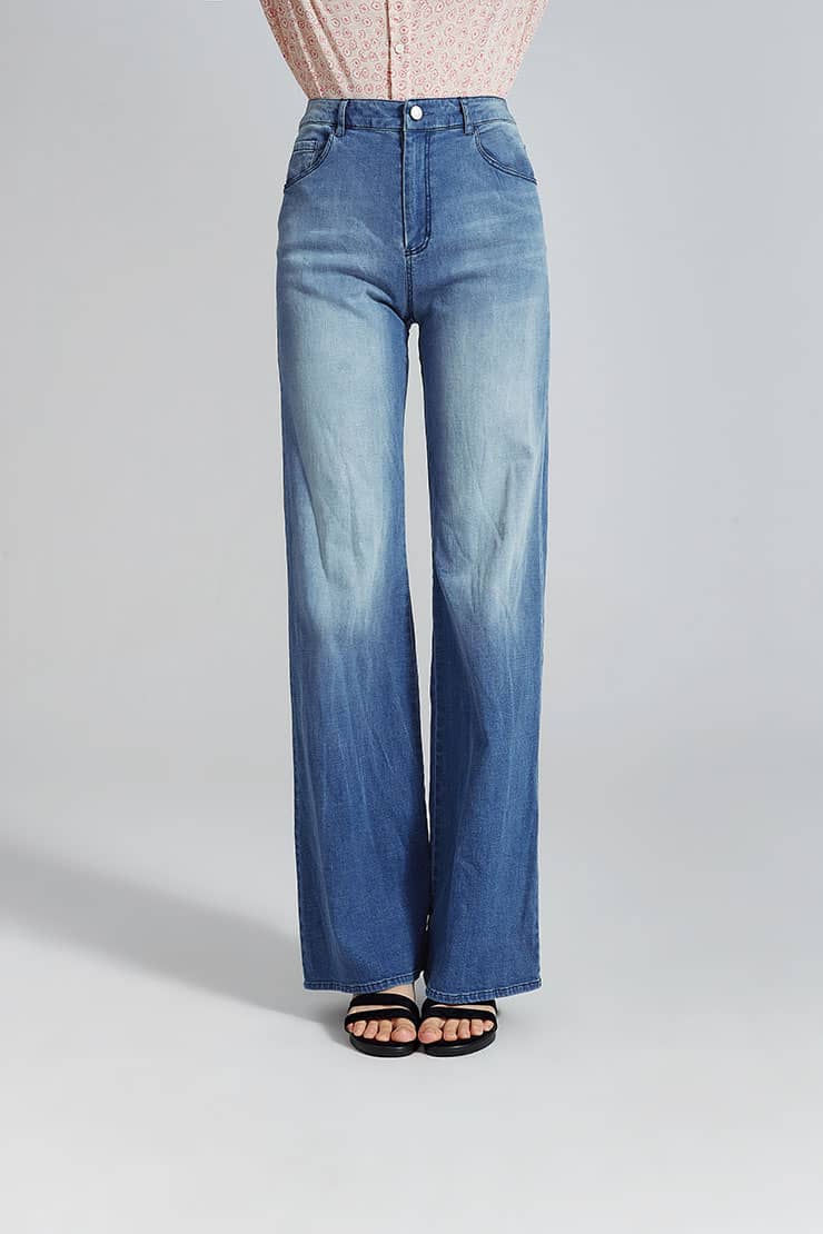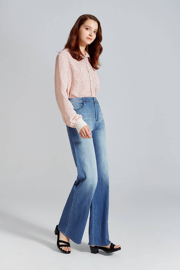 简约贴体腰头,侧边月牙插袋,前中质感金属扣拉链门襟,后幅盾型口袋装饰;过脚裤长,合身阔腿喇叭廓形,修饰拉长腿部线条;裤身加入立体猫须,做旧洗水,令牛仔更具个性,质感松软穿