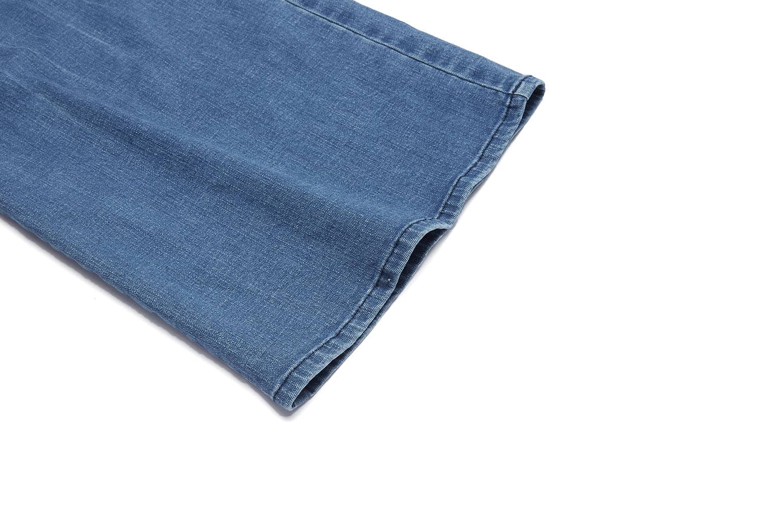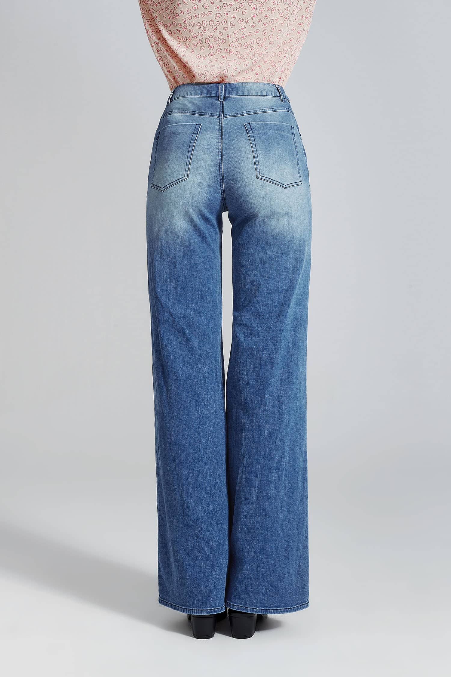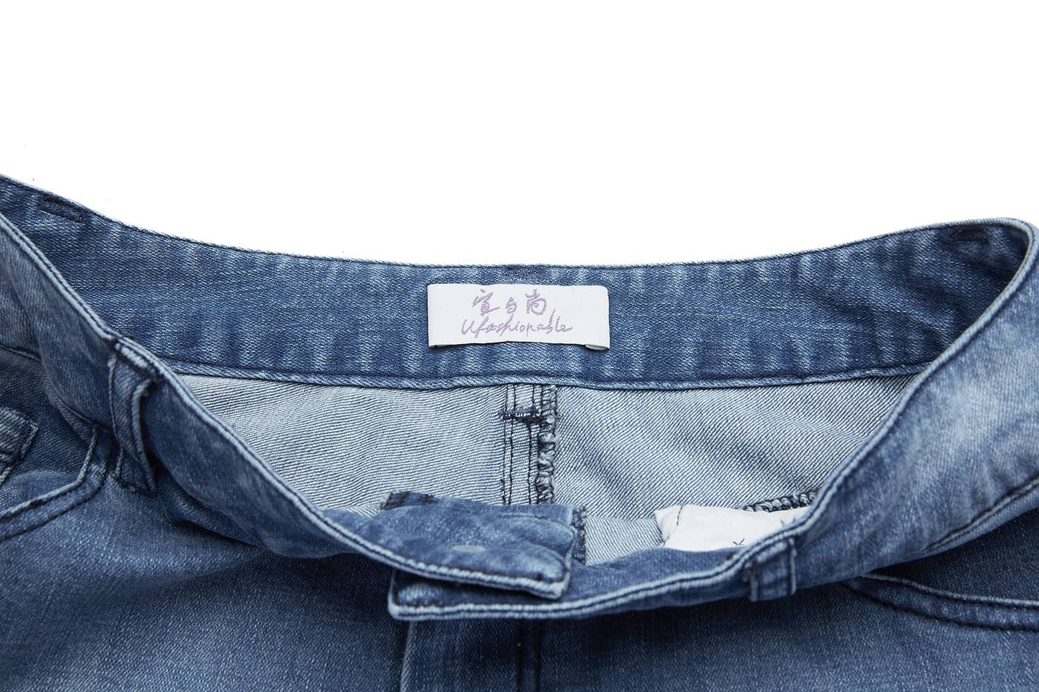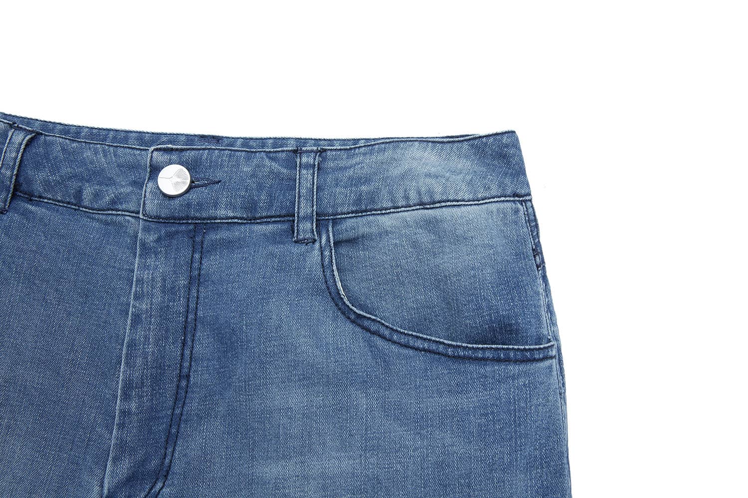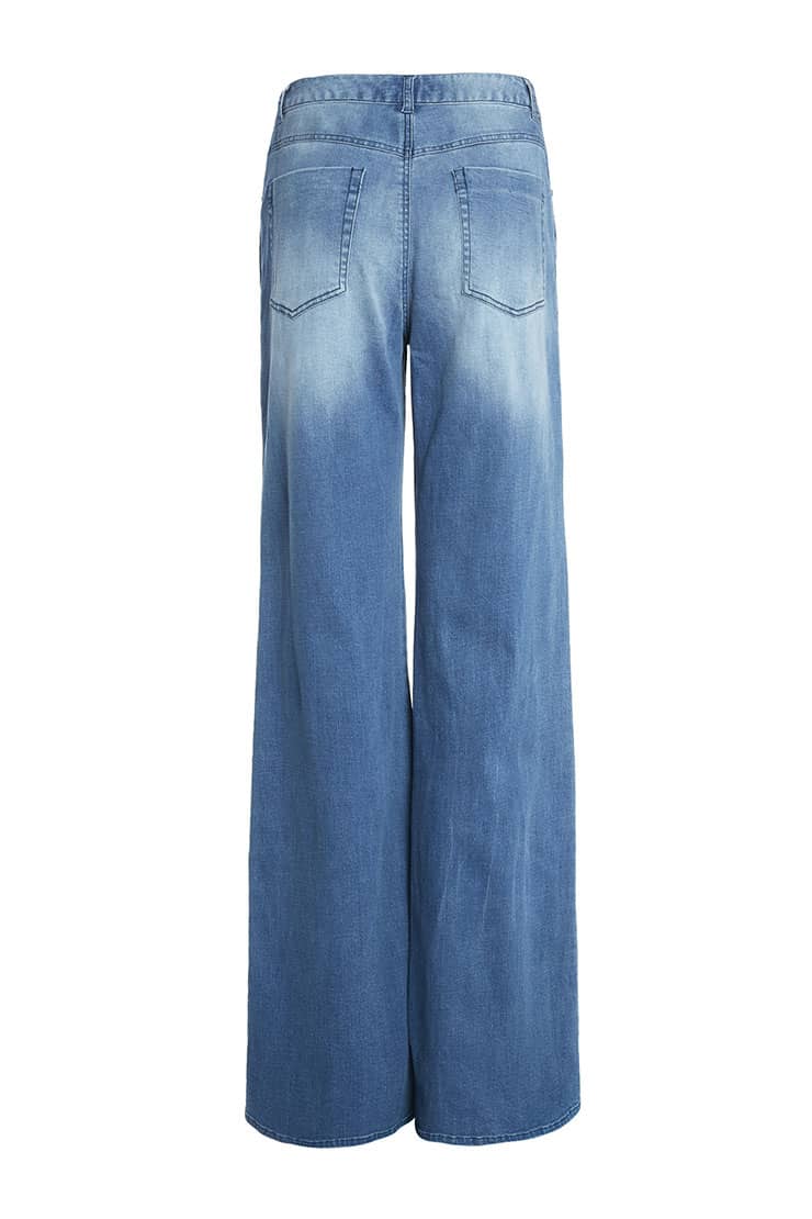简约贴体腰头,侧边月牙插袋,前中质感金属扣拉链门襟,后幅盾型口袋装饰;过脚裤长,合身阔腿喇叭廓形,修饰拉长腿部线条;裤身加入立体猫须,做旧洗水,令牛仔更具个性,质感松软穿