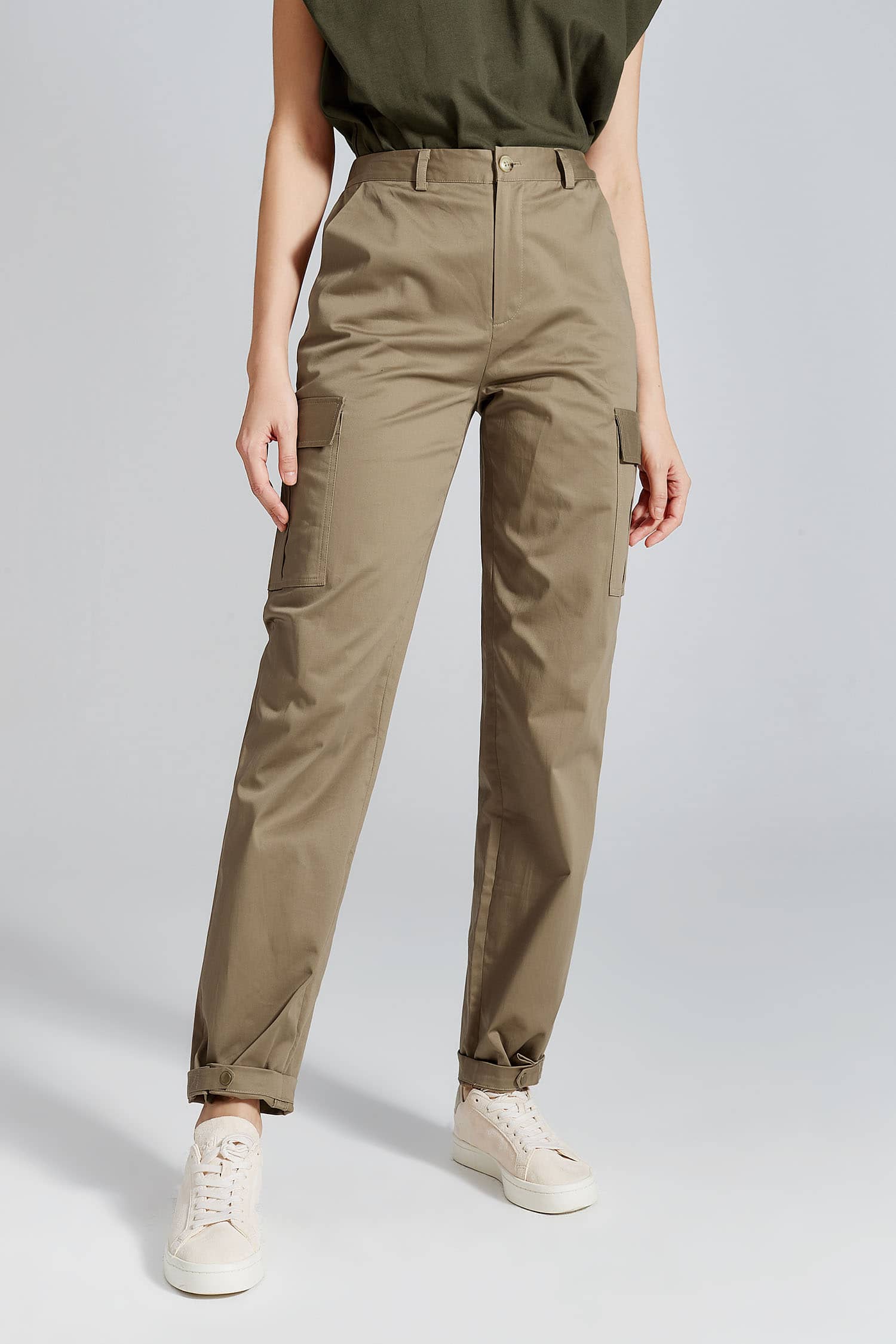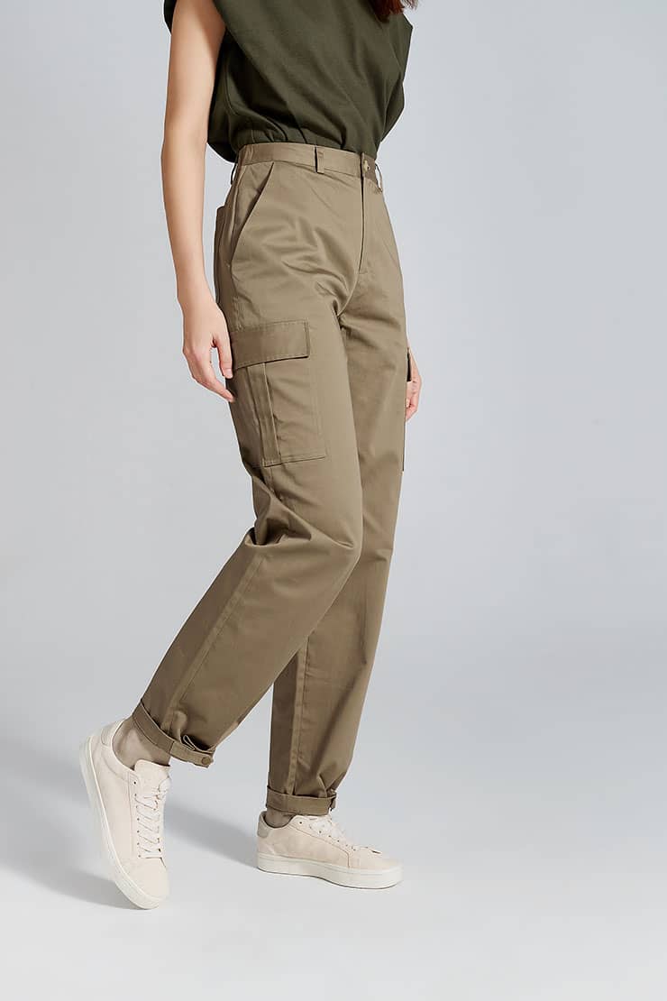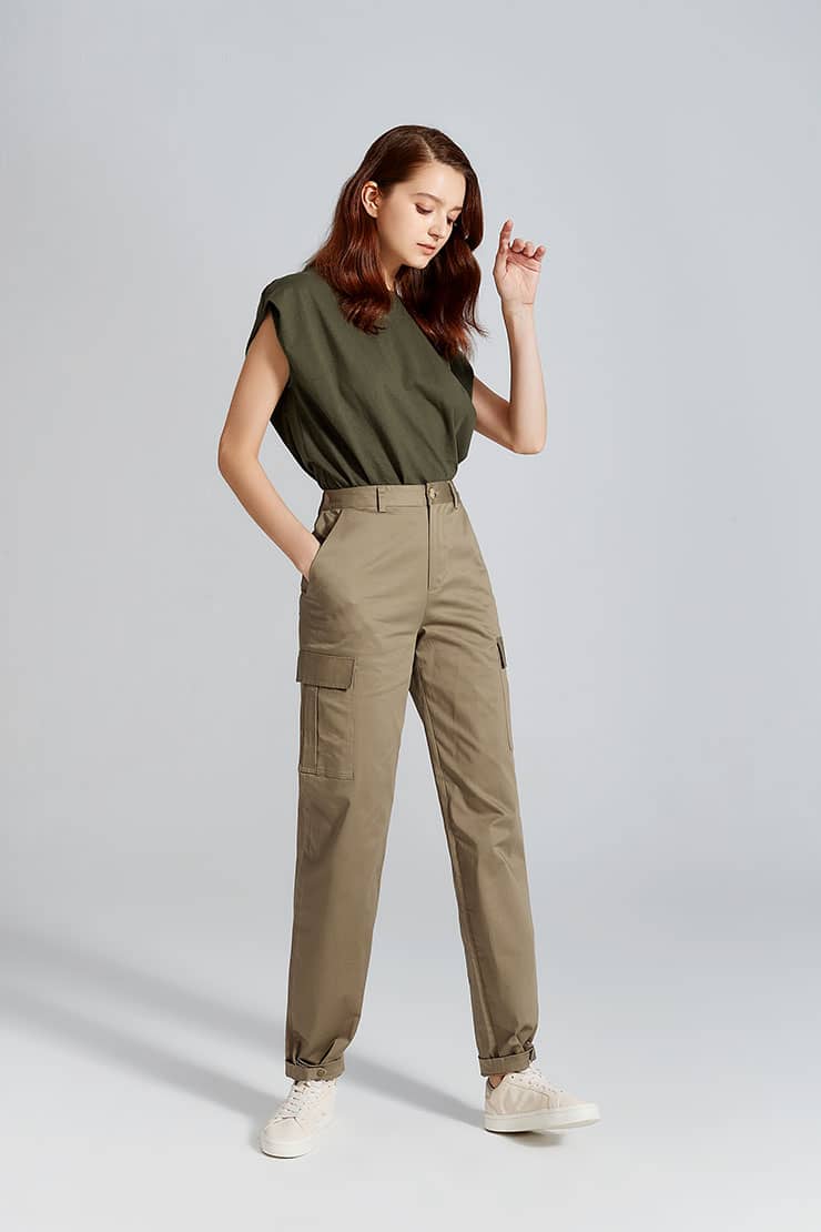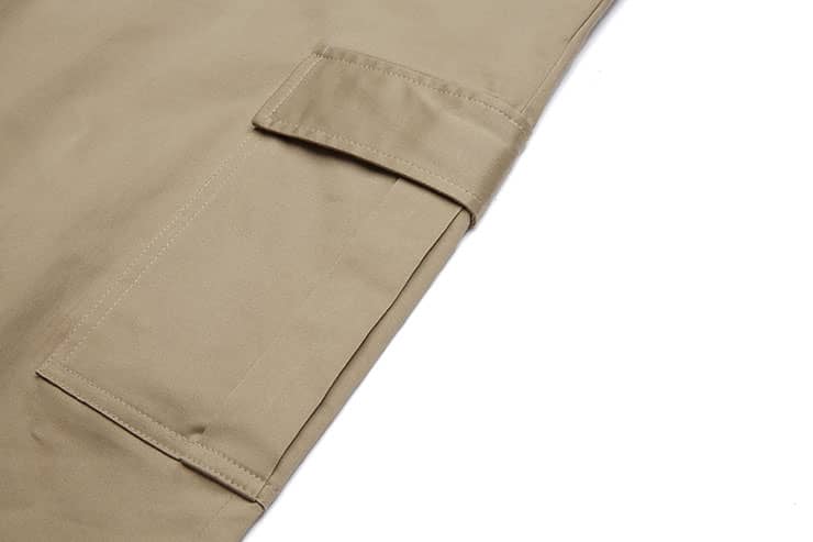松紧调节贴体腰头,侧边斜插袋,前中纽扣拉链门襟,后幅方形贴袋,腿侧工装风翻盖大贴袋;四合扣收拢裤脚,可开合转换多种造型;过踝裤长,合体锥形廓形,时尚帅性;梭织混纺面料,手