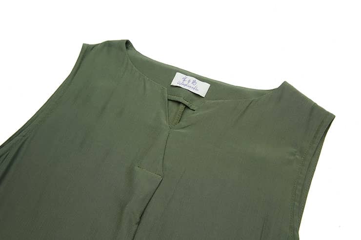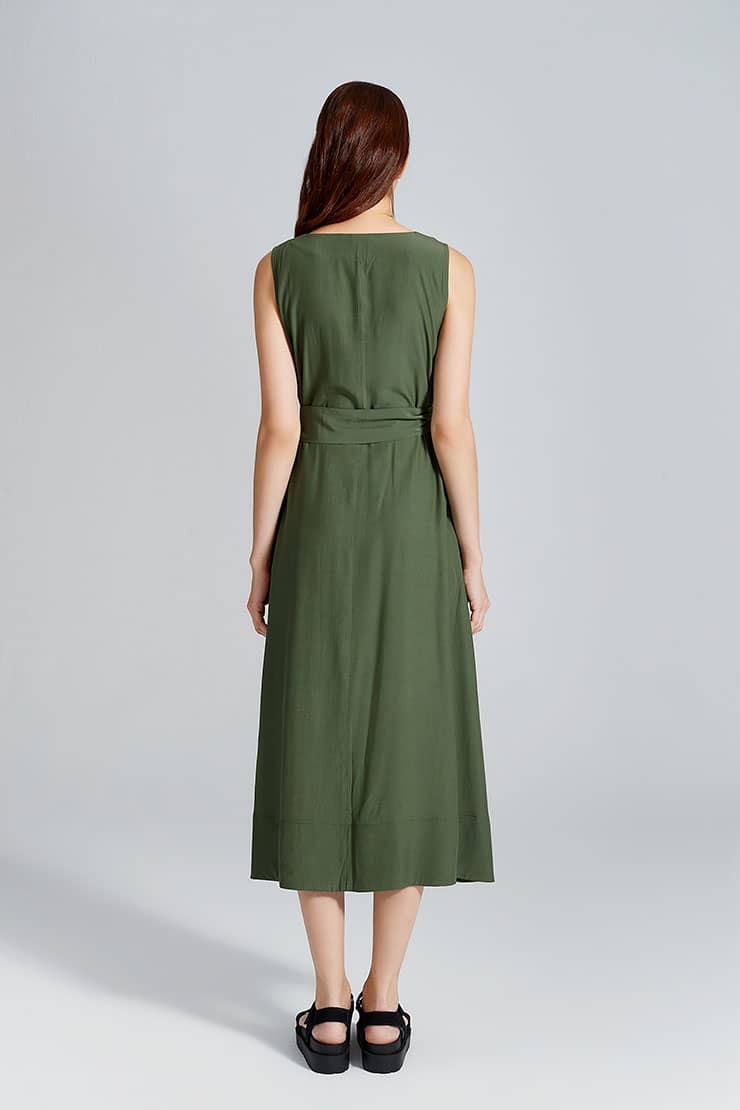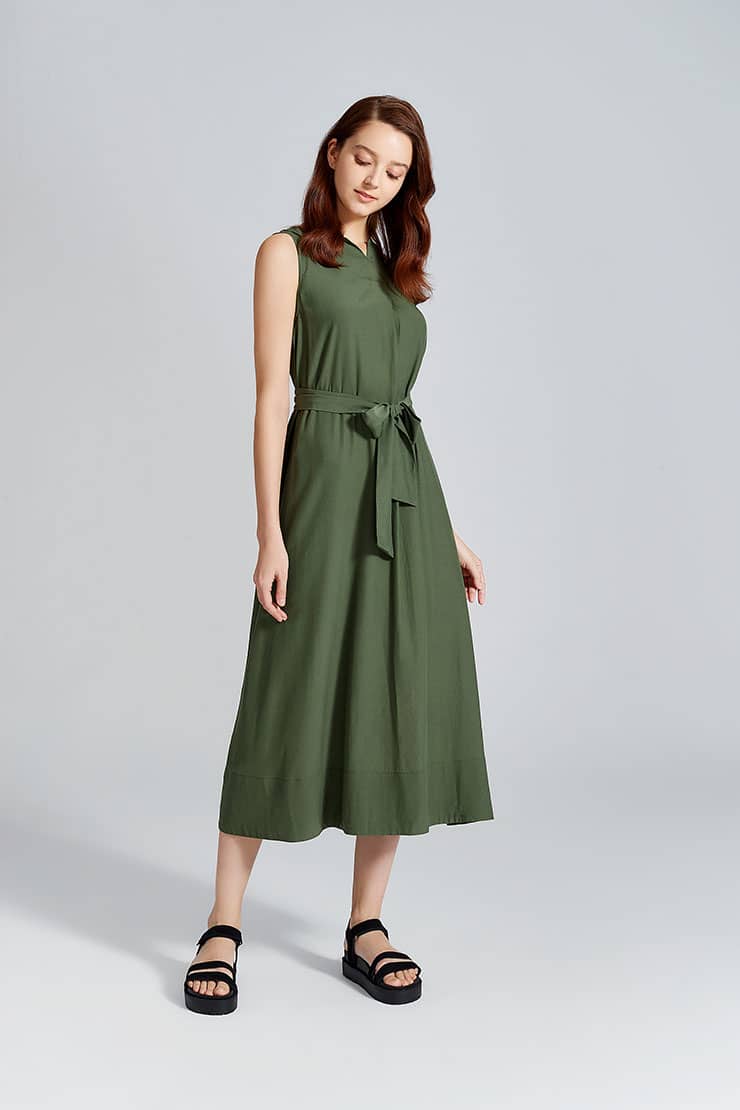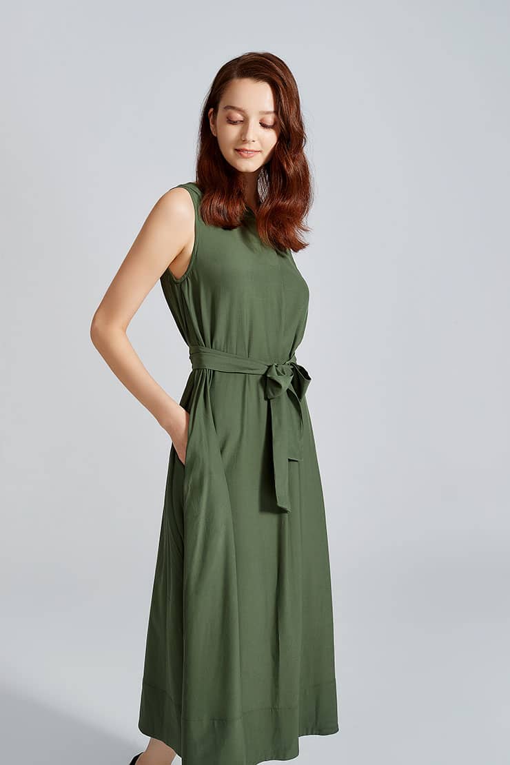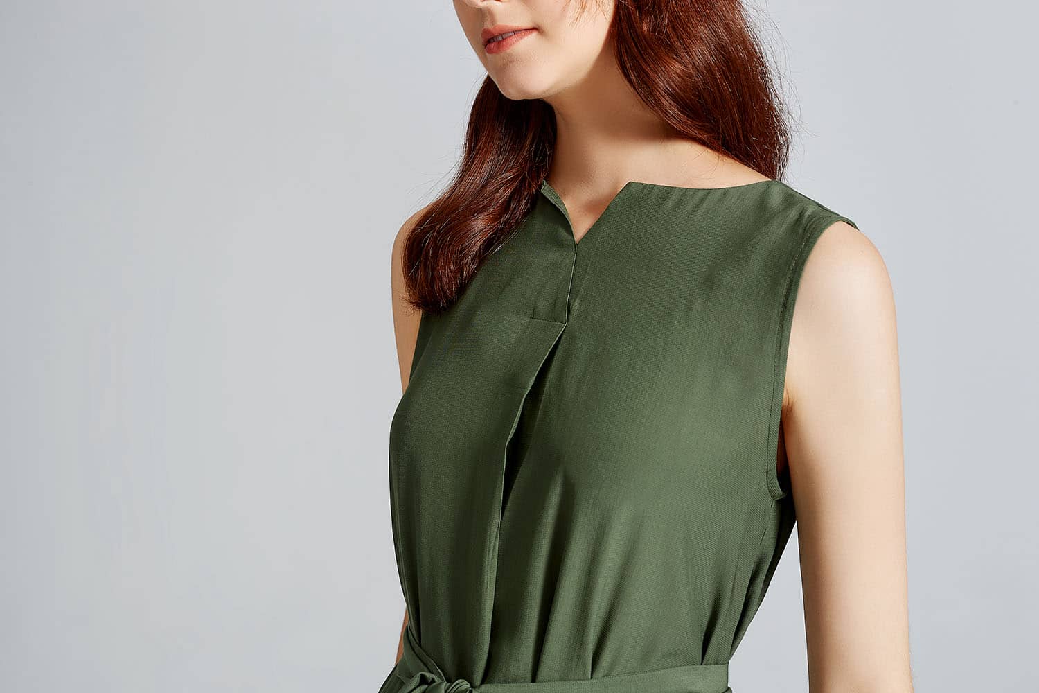 褶裥V嘴船领,简约无袖,侧缝工字褶内设手插袋;过膝及小腿中裙长,宽松A型廓形,本布腰带蝴蝶结束腰,时尚写意;柔软的化纤面料,手感细腻,具有良好的悬垂性,穿着舒适。