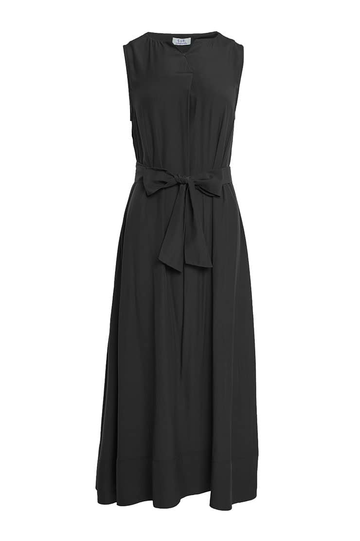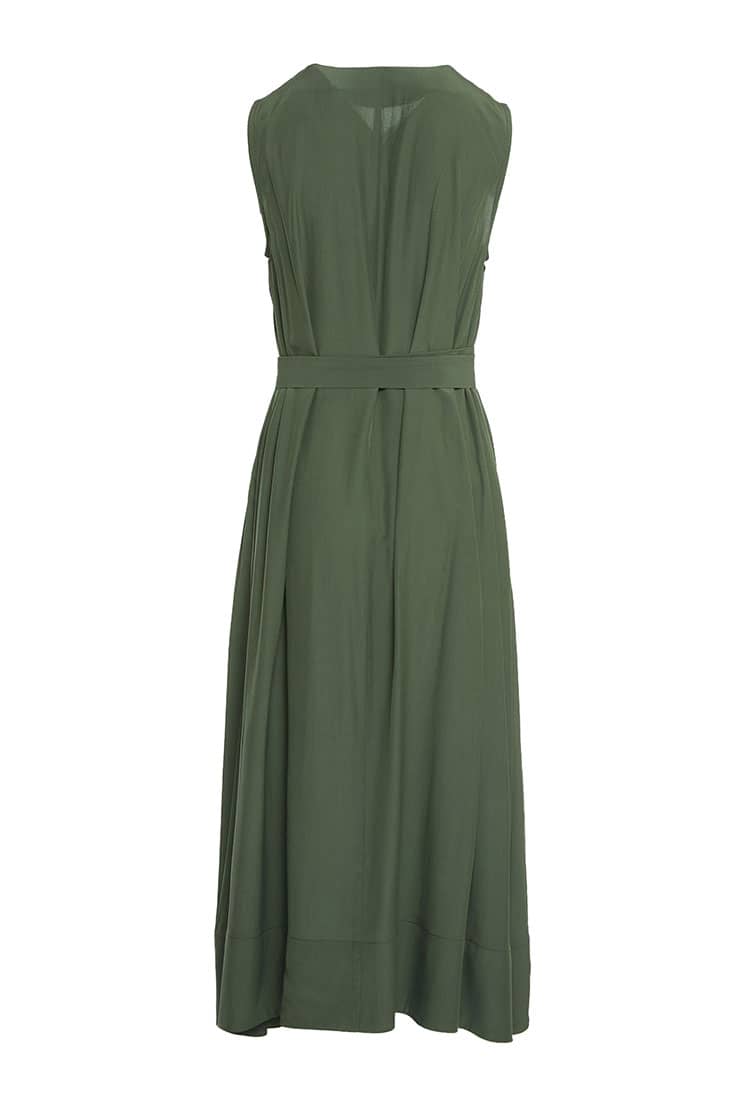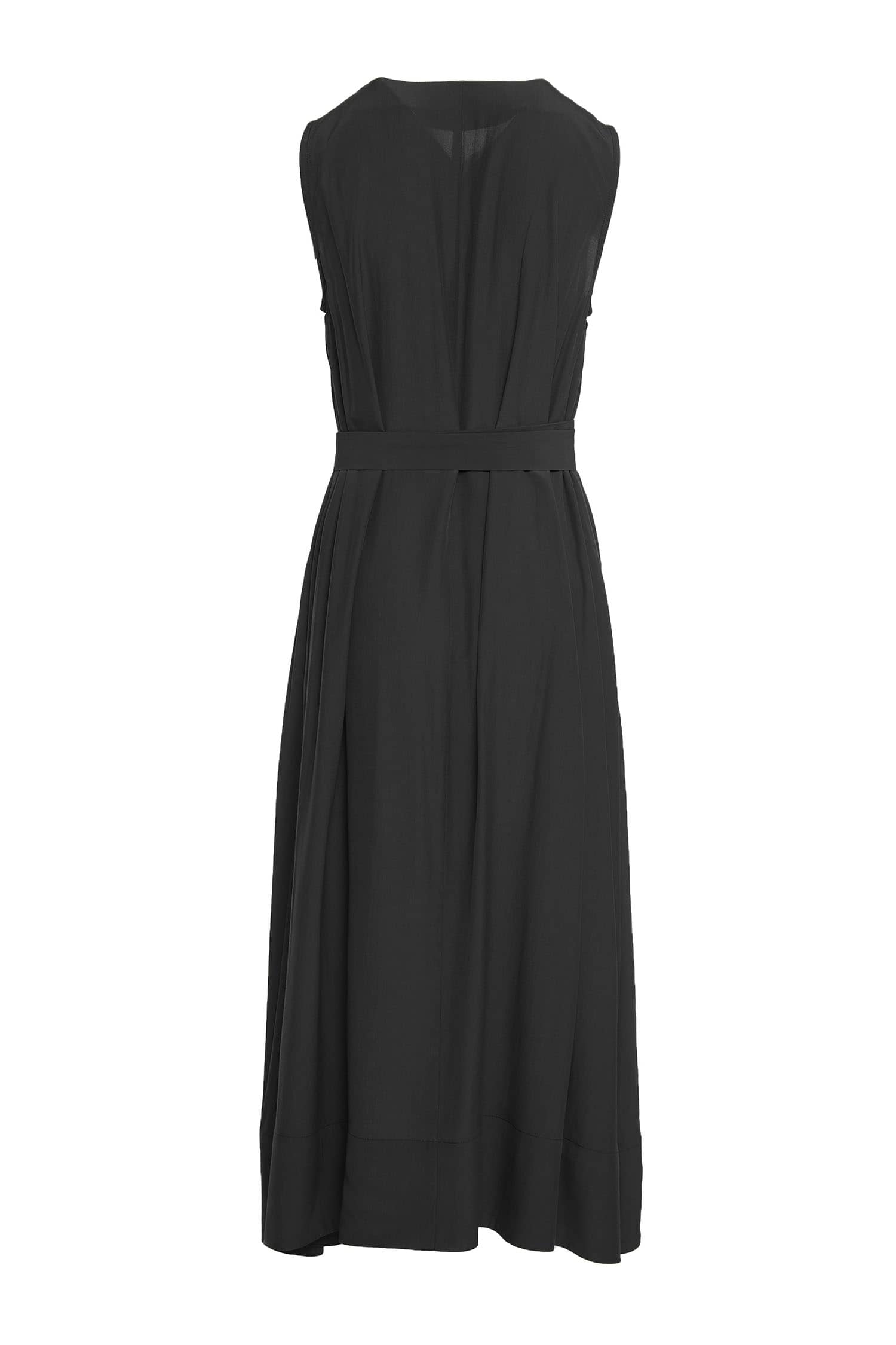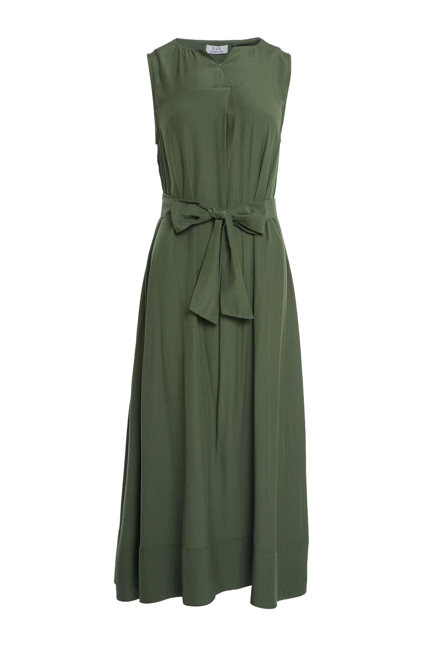 褶裥V嘴船领,简约无袖,侧缝工字褶内设手插袋;过膝及小腿中裙长,宽松A型廓形,本布腰带蝴蝶结束腰,时尚写意;柔软的化纤面料,手感细腻,具有良好的悬垂性,穿着舒适。