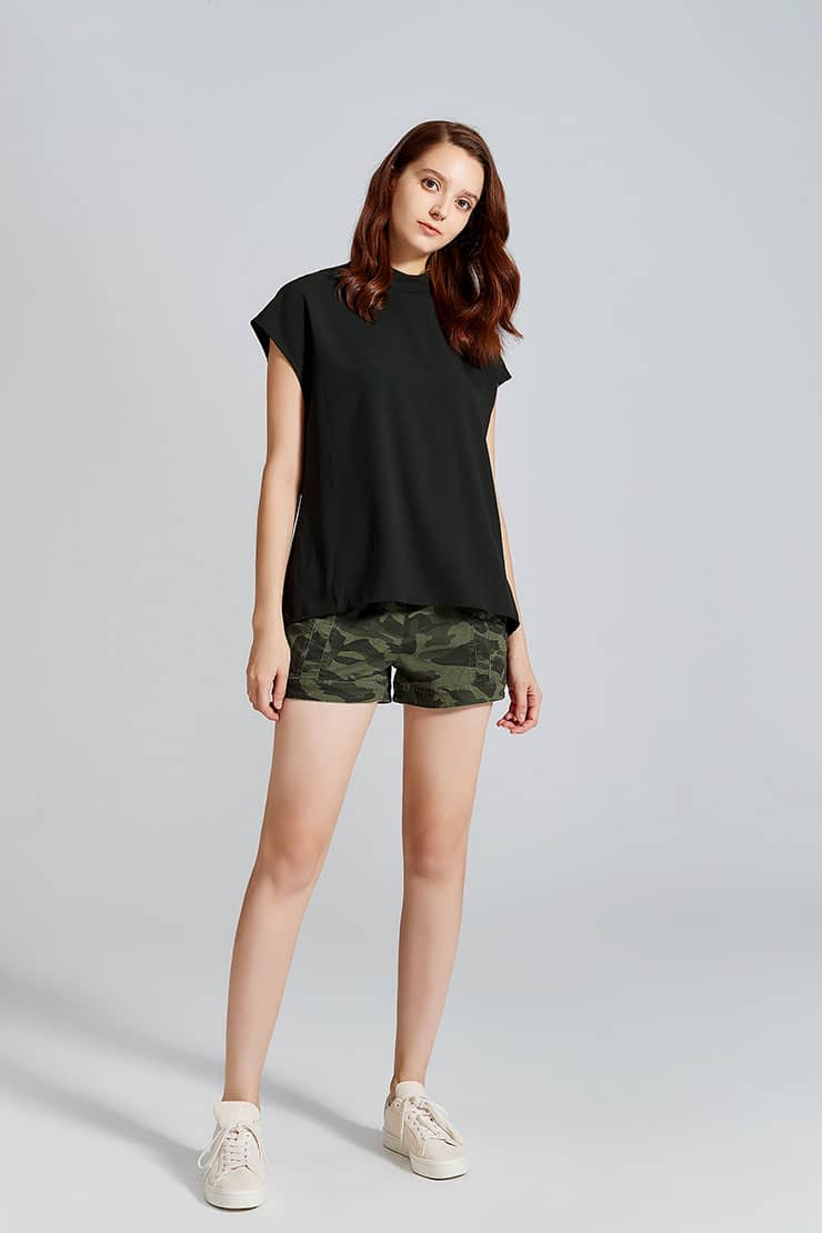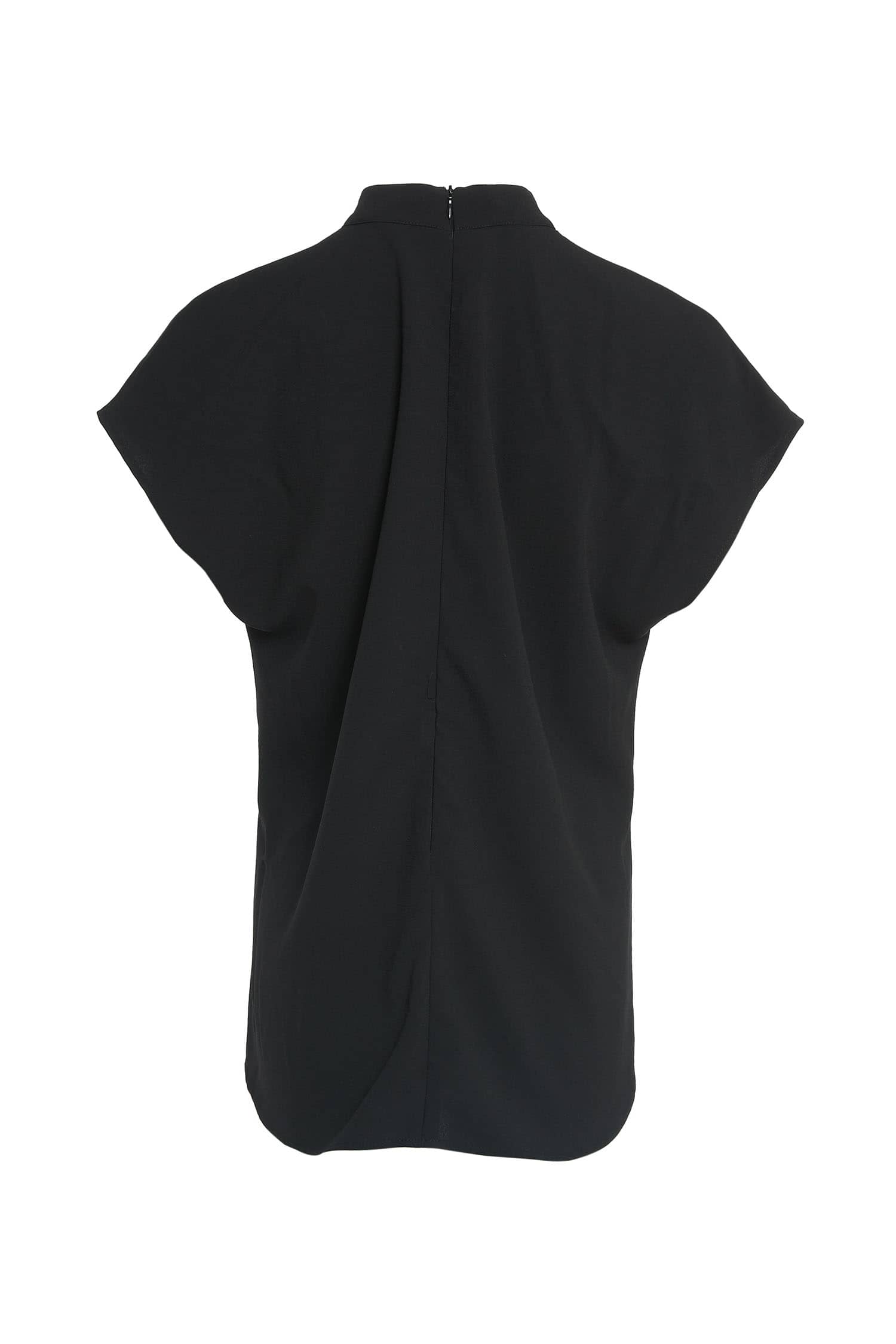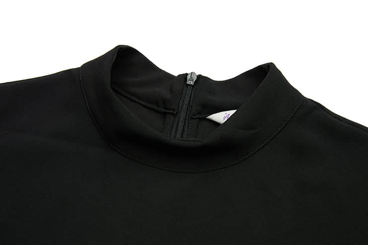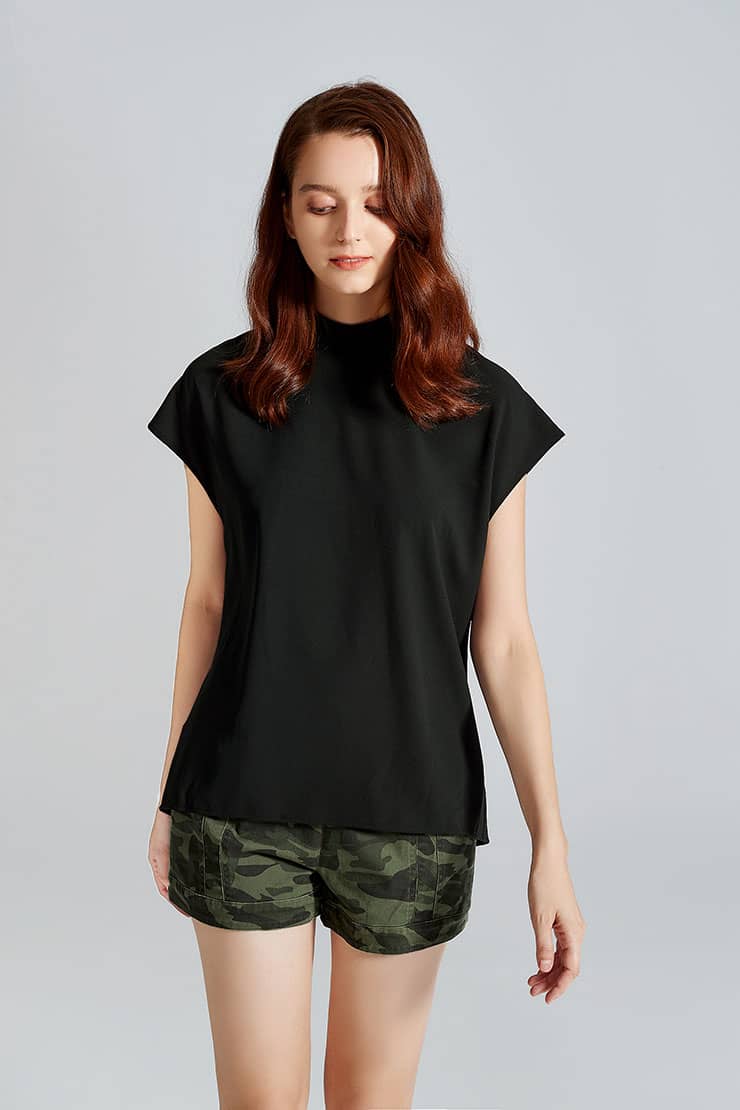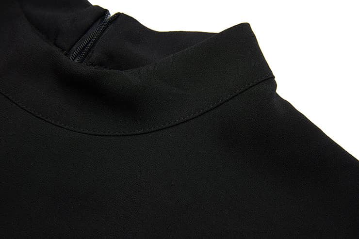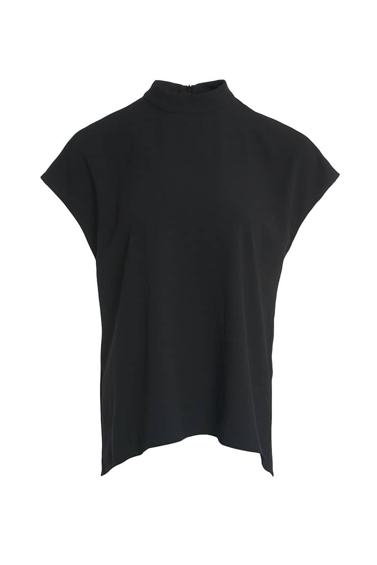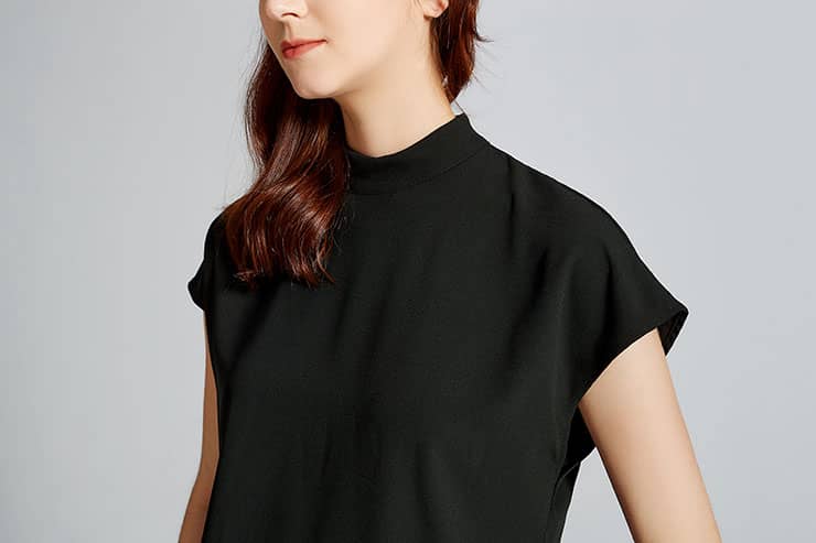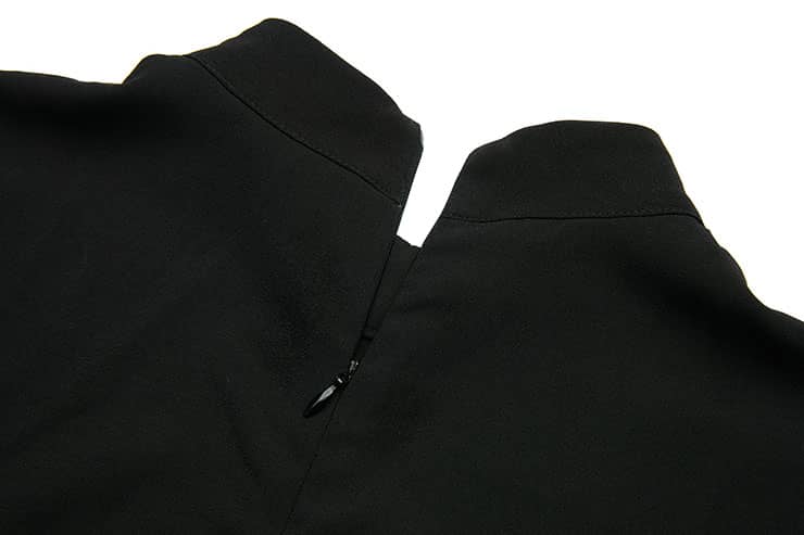 高立领,落肩无袖,后中拉链半开襟,前短后长弧形下摆,A型宽松无袖上衣廓形,优雅时尚;化纤乱麻面料,布面肌理感强,结构紧密,有悬垂感,穿着耐磨抗皱。