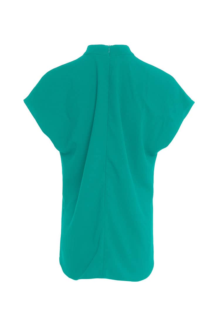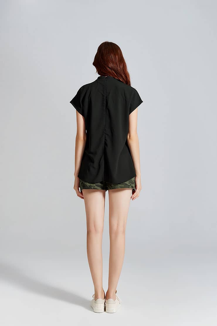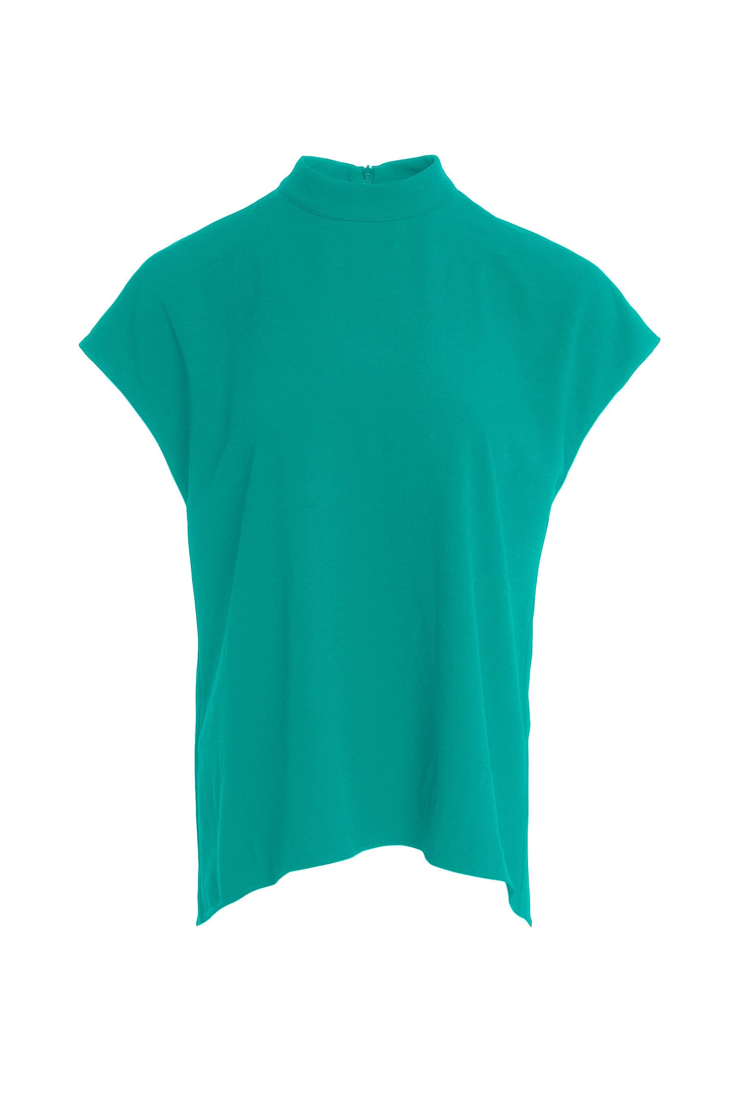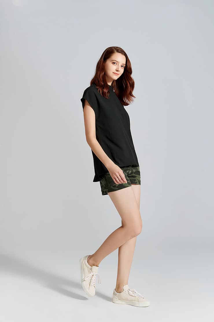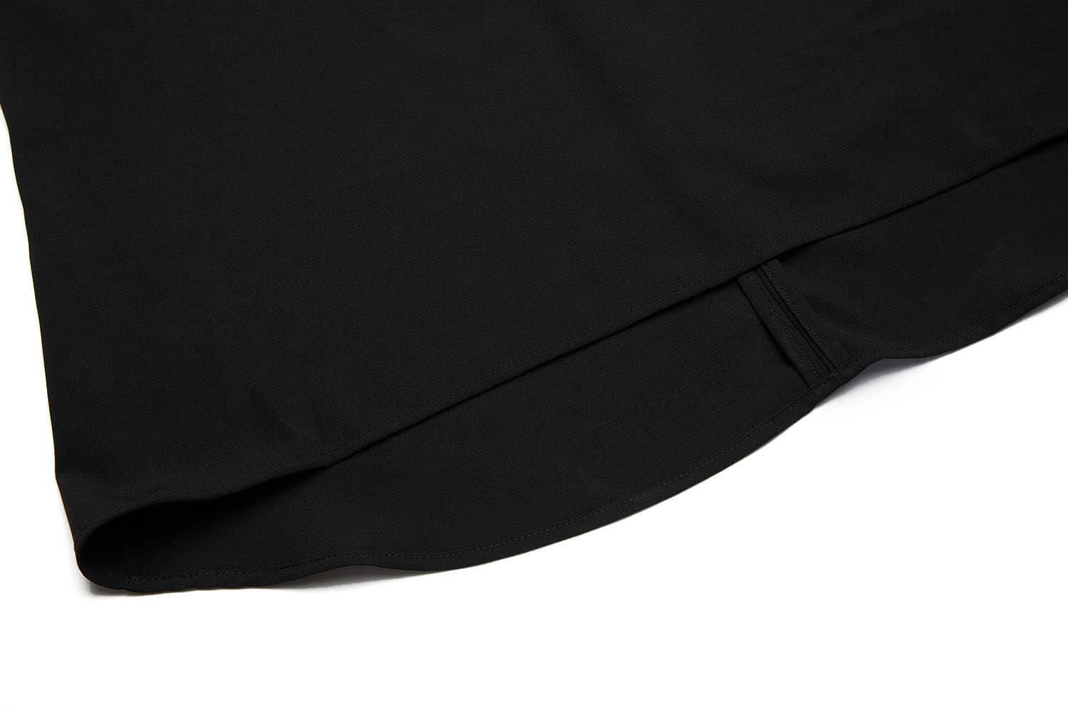 高立领,落肩无袖,后中拉链半开襟,前短后长弧形下摆,A型宽松无袖上衣廓形,优雅时尚;化纤乱麻面料,布面肌理感强,结构紧密,有悬垂感,穿着耐磨抗皱。