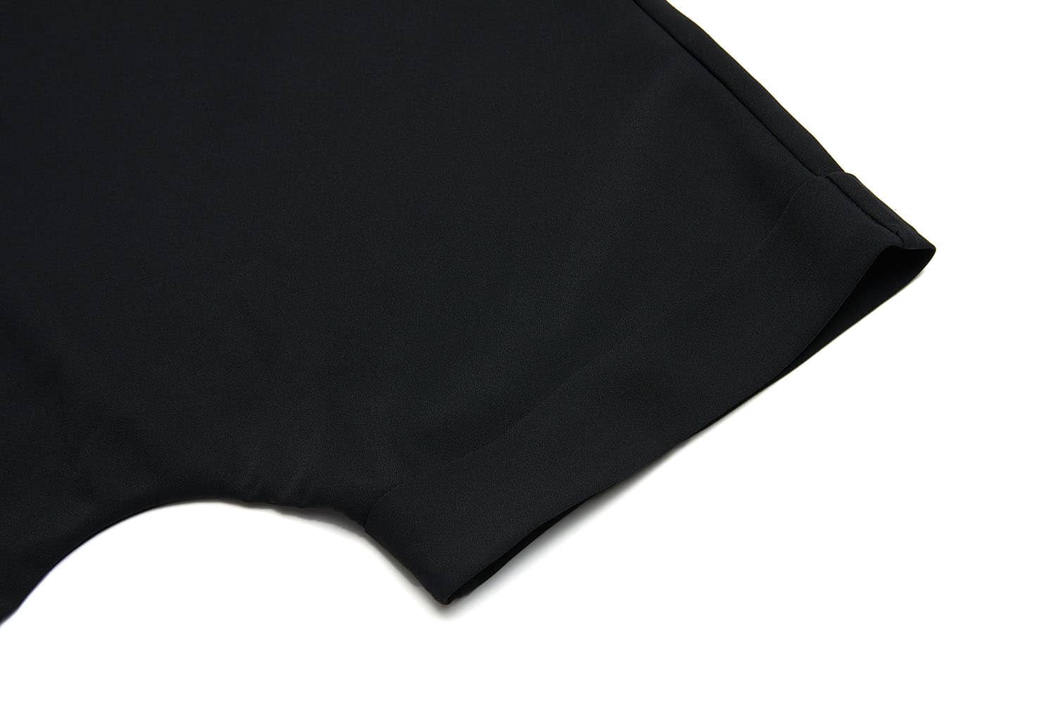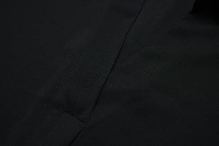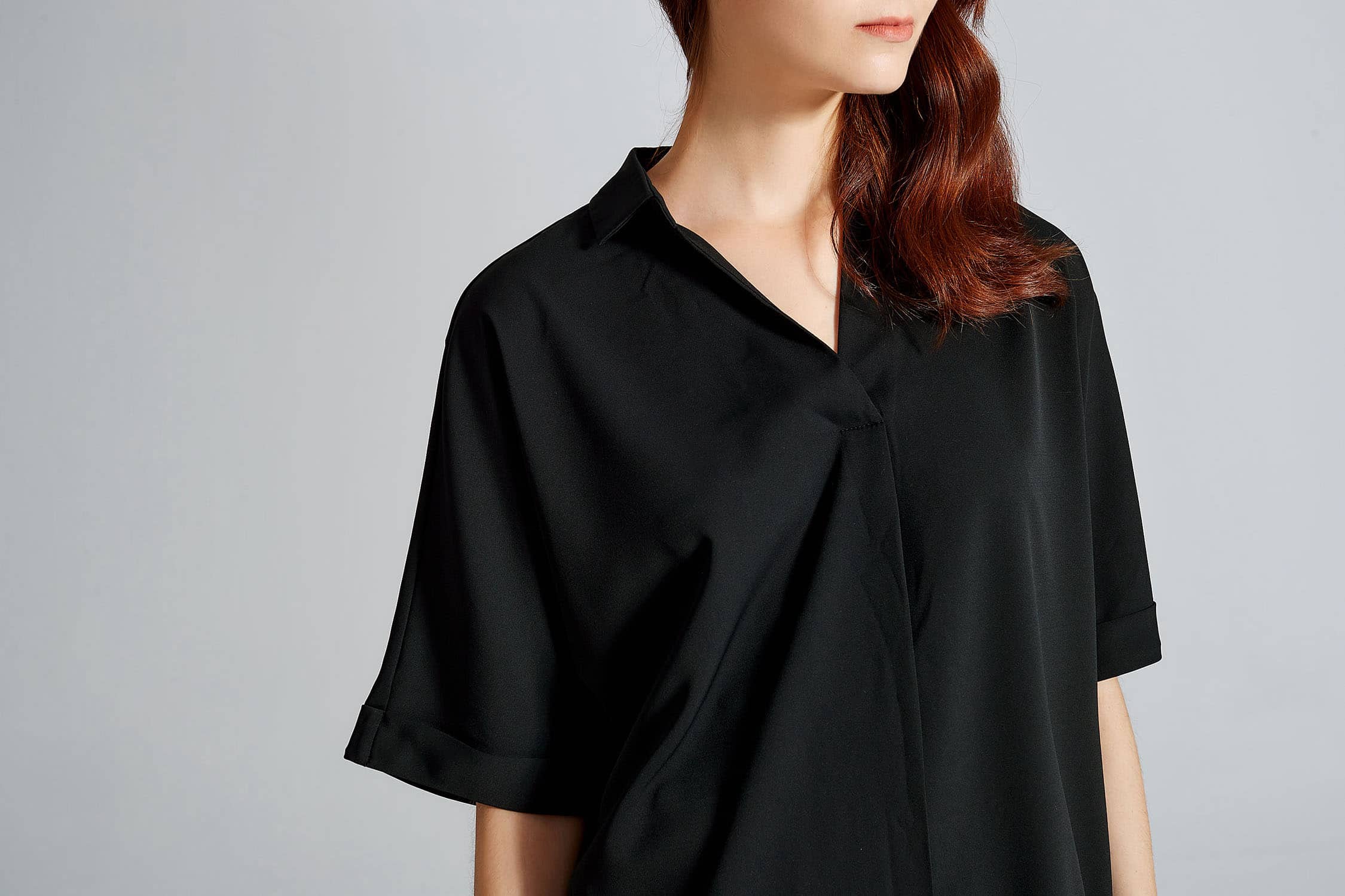 褶裥V领+衬衫翻领,后中大V工字褶;蝙蝠连身中袖,有效修饰手臂线条;平直下摆,衣长过臀,宽松直筒连身中袖上衣廓形,休闲时尚;化纤乱麻面料,布面肌理感强,结构紧密,有悬垂感。