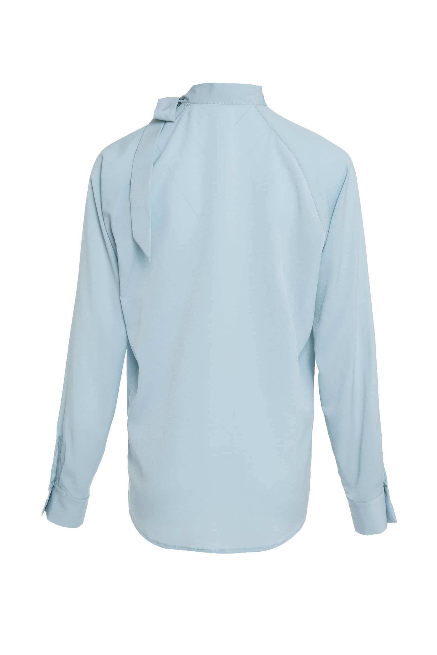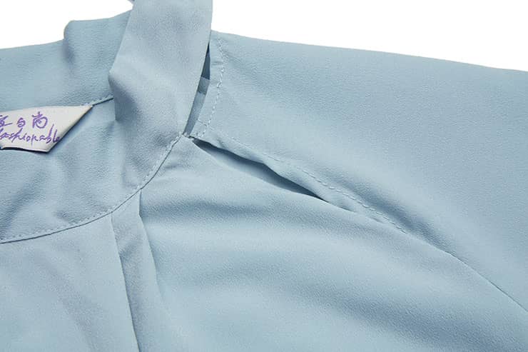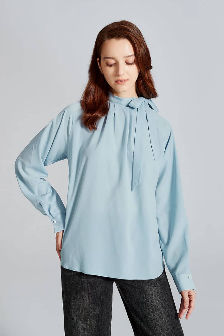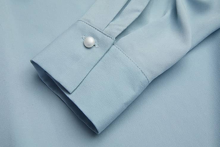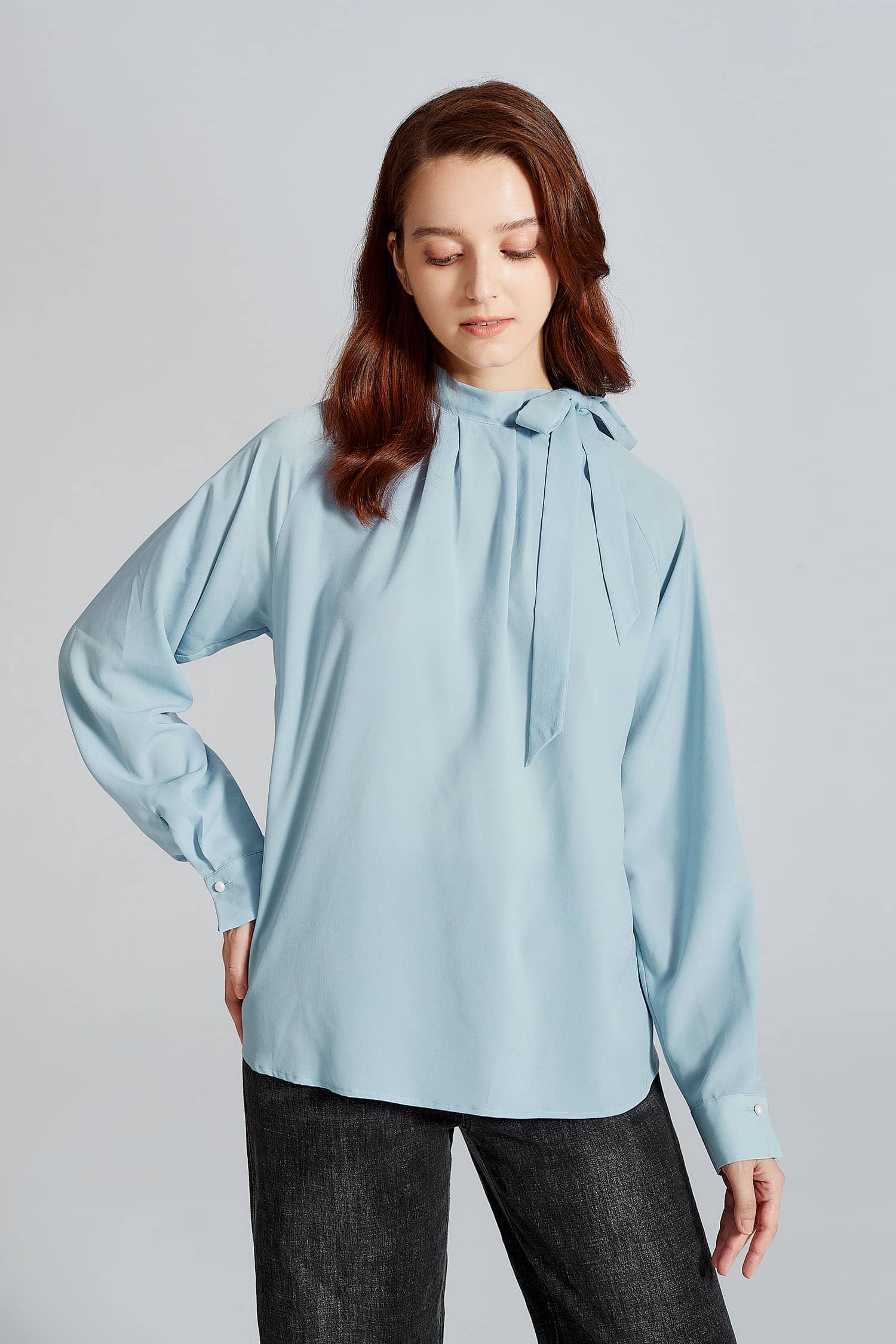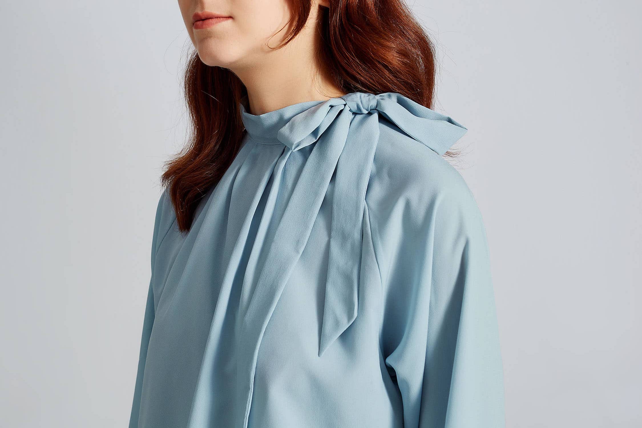 插肩开叉飘带领,侧边蝴蝶结系带,前领口对称双褶裥;插肩衬衫长袖,珍珠扣点缀袖口;前短后长浅弧形下摆,合体插肩长袖飘带领衬衫廓形,浪慢优雅;聚酯纤维面料手感柔和,穿着舒适。