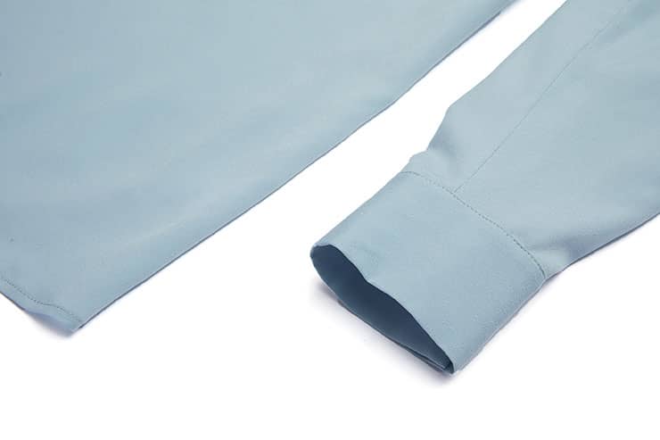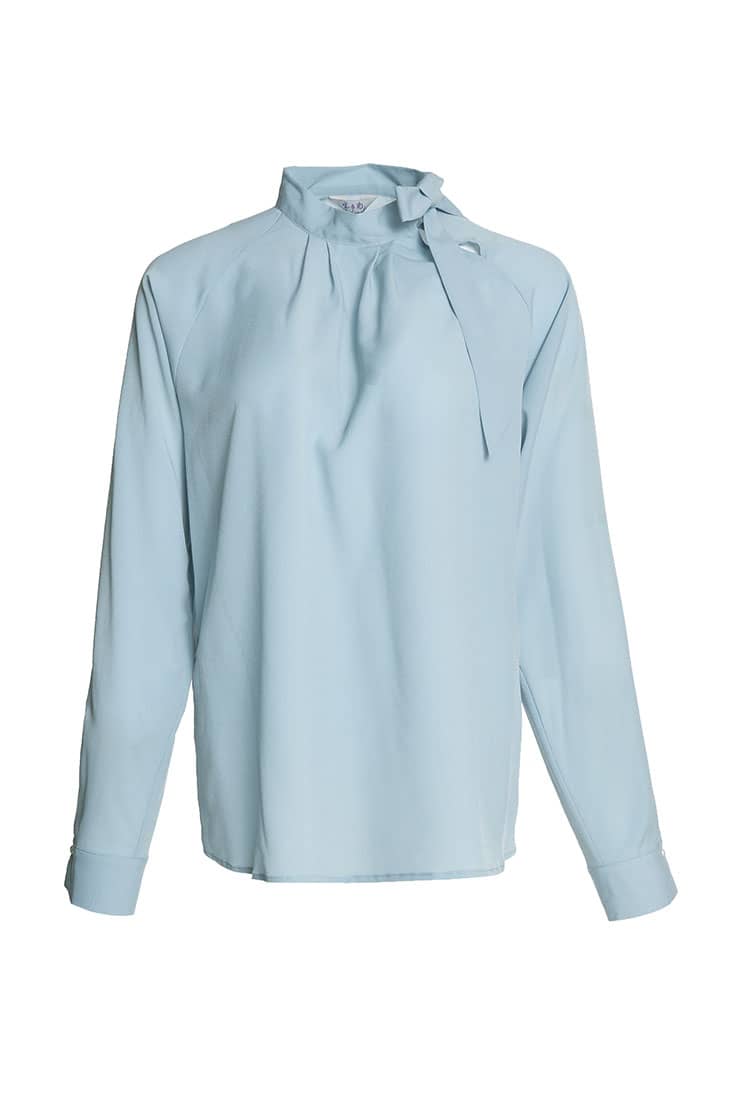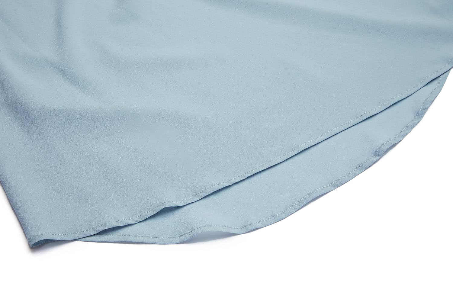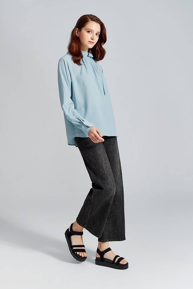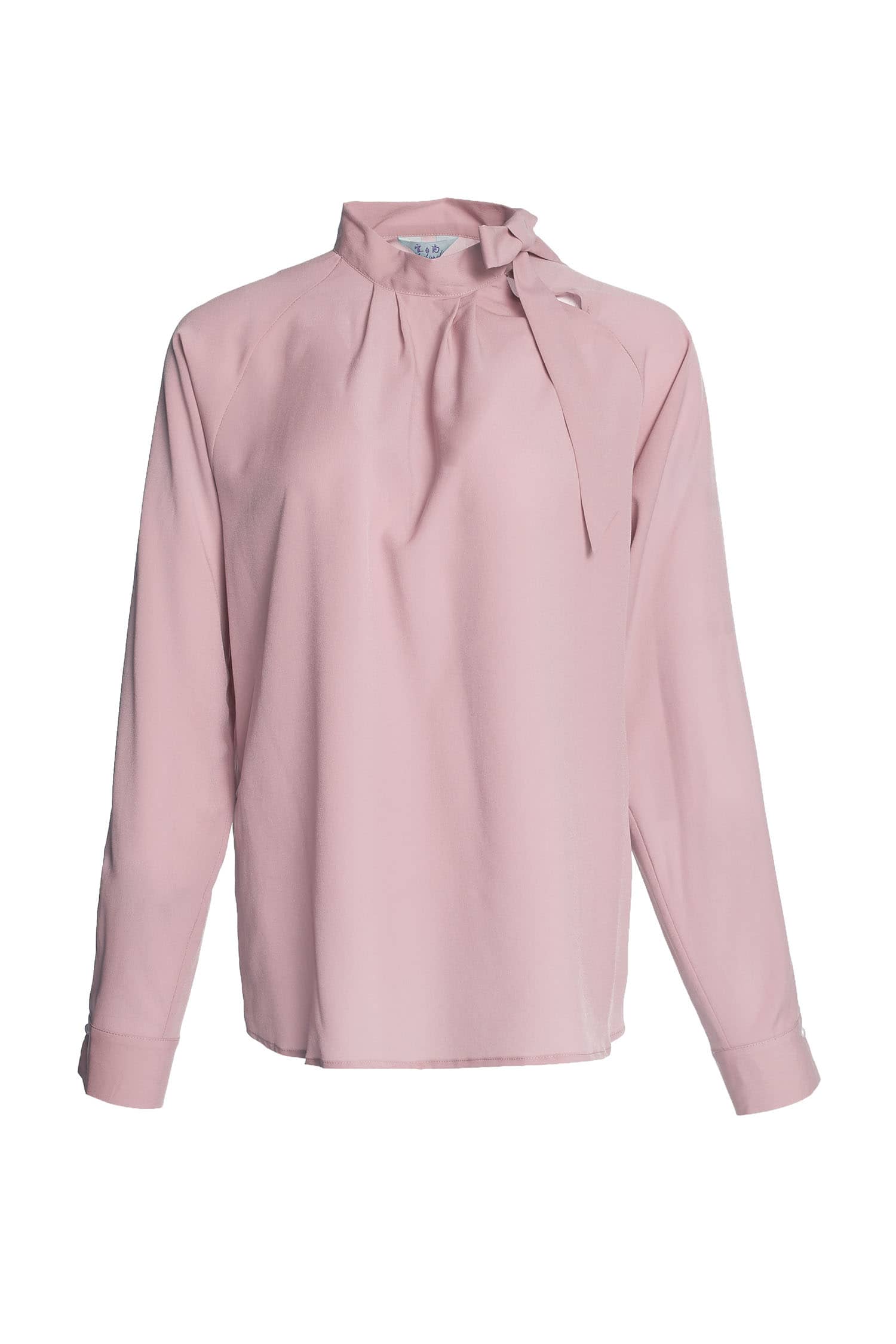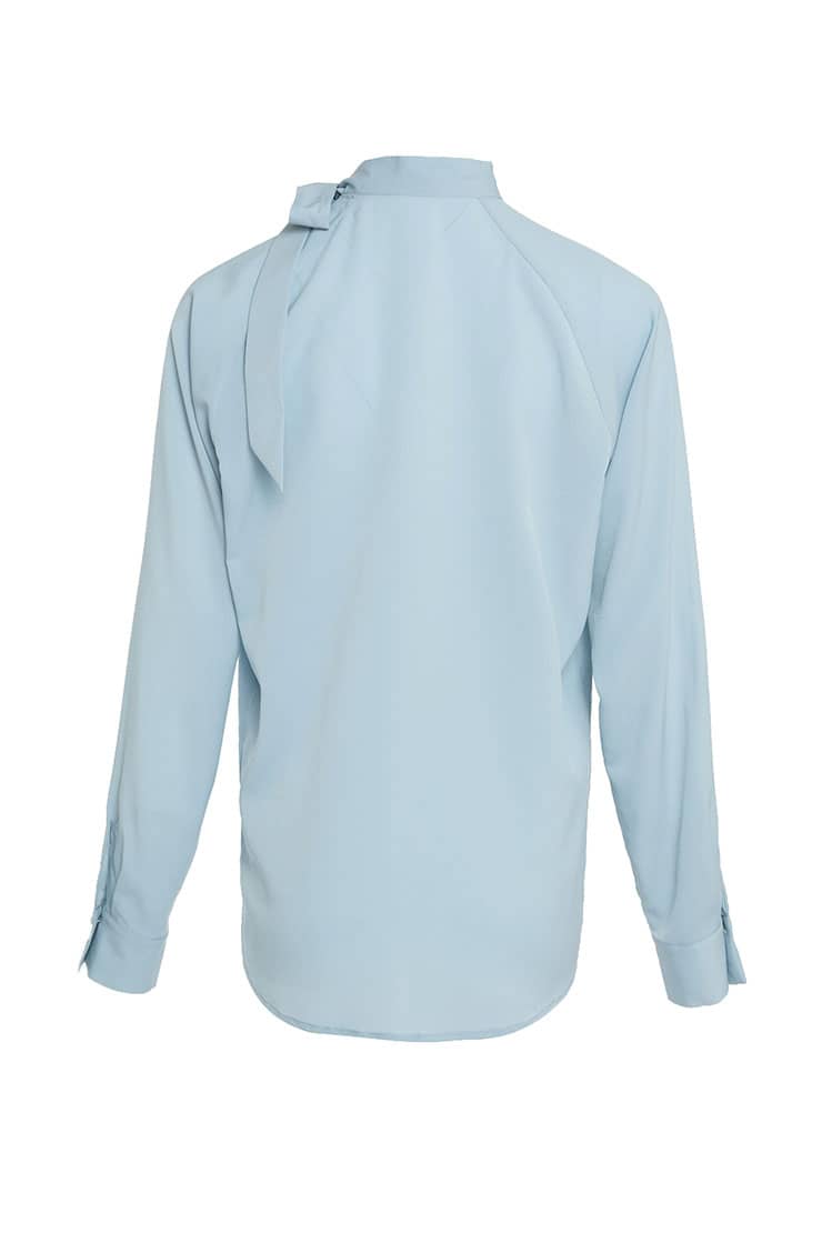 插肩开叉飘带领,侧边蝴蝶结系带,前领口对称双褶裥;插肩衬衫长袖,珍珠扣点缀袖口;前短后长浅弧形下摆,合体插肩长袖飘带领衬衫廓形,浪慢优雅;聚酯纤维面料手感柔和,穿着舒适。