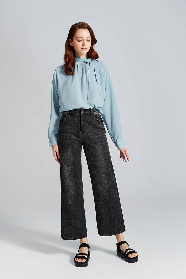 简约贴体腰头,侧边月牙插袋,前中质感金属扣拉链门襟,后幅盾型口袋装饰;露脚裸八分裤长,合身直筒阔腿廓形,修饰拉长腿部线条;舒适纯棉牛仔面料,酵洗工艺,手感松软穿着舒适。