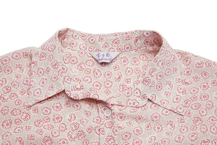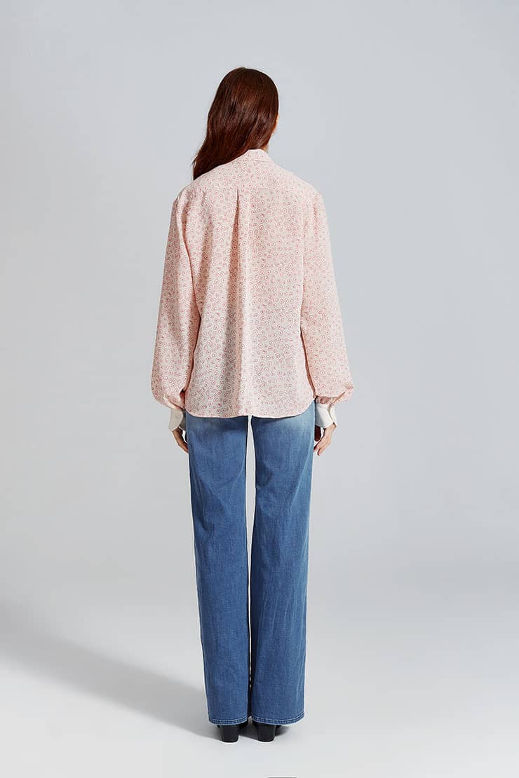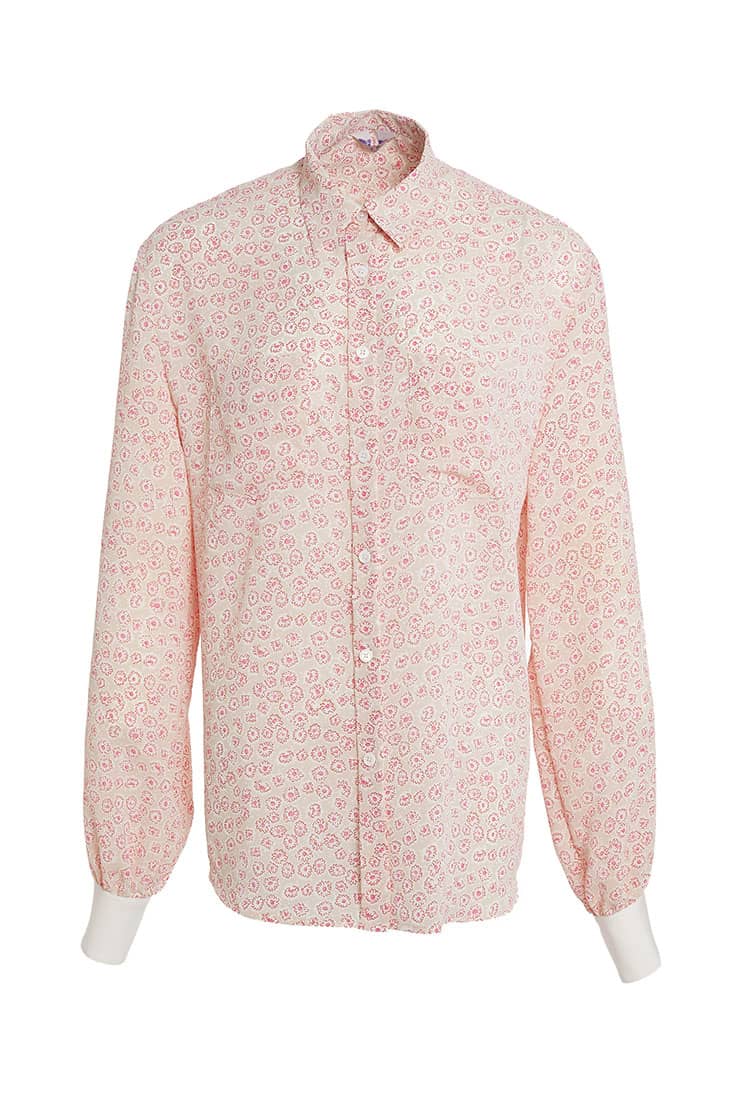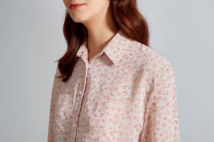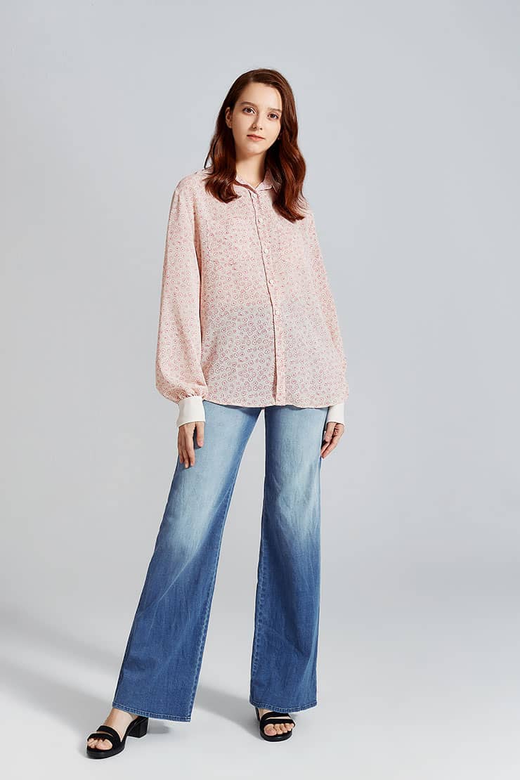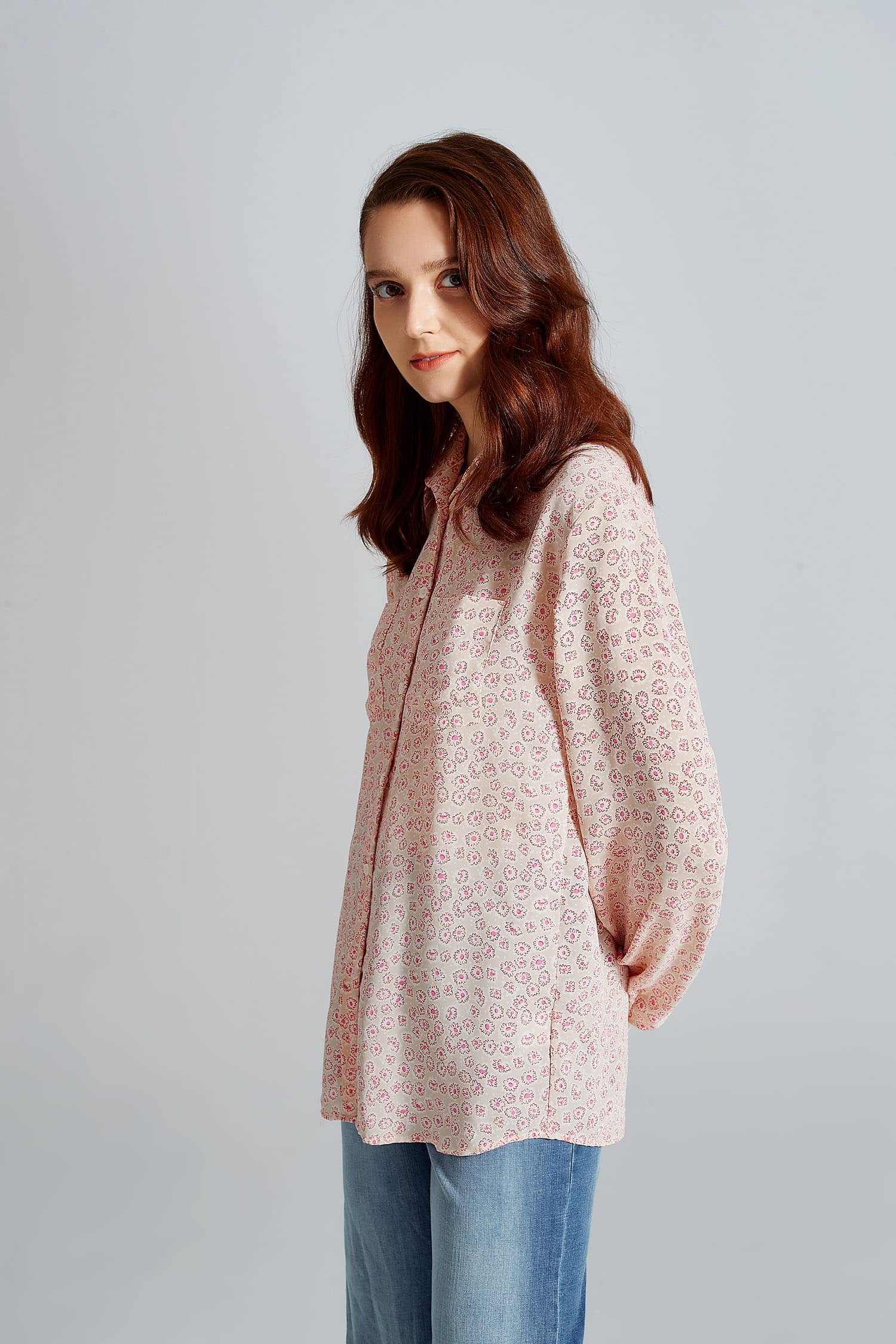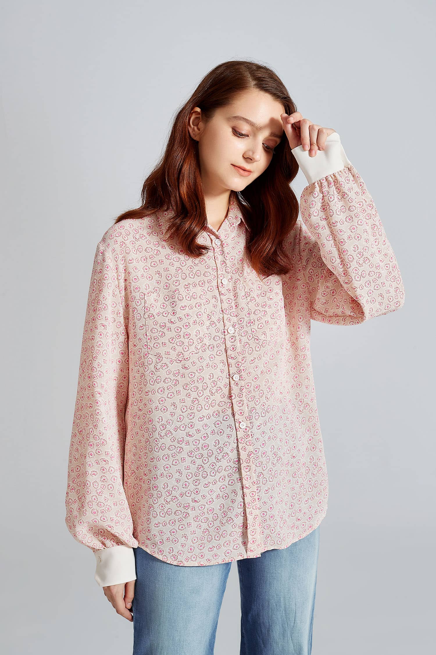 经典衬衫翻领,前中开扣门襟,胸部对称盾形贴袋,小落肩泡泡长袖撞色袖口,浅弧形下摆,印花面料,宽松上衣廓形,清新优雅;雪纺印花面料,爽滑舒适。
