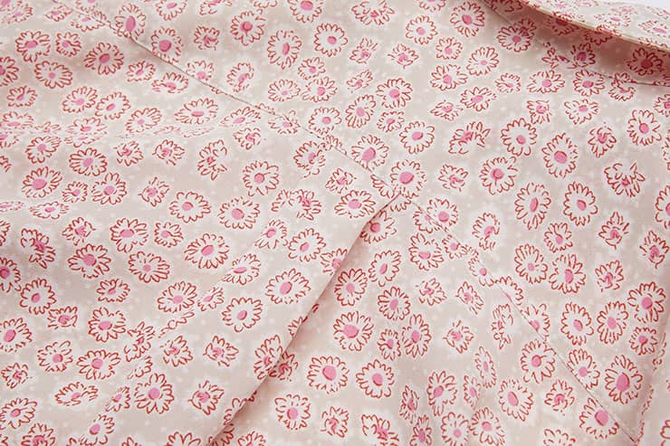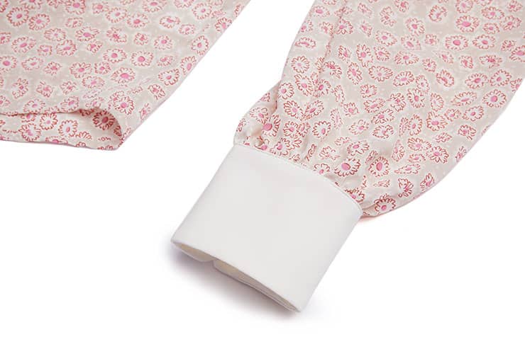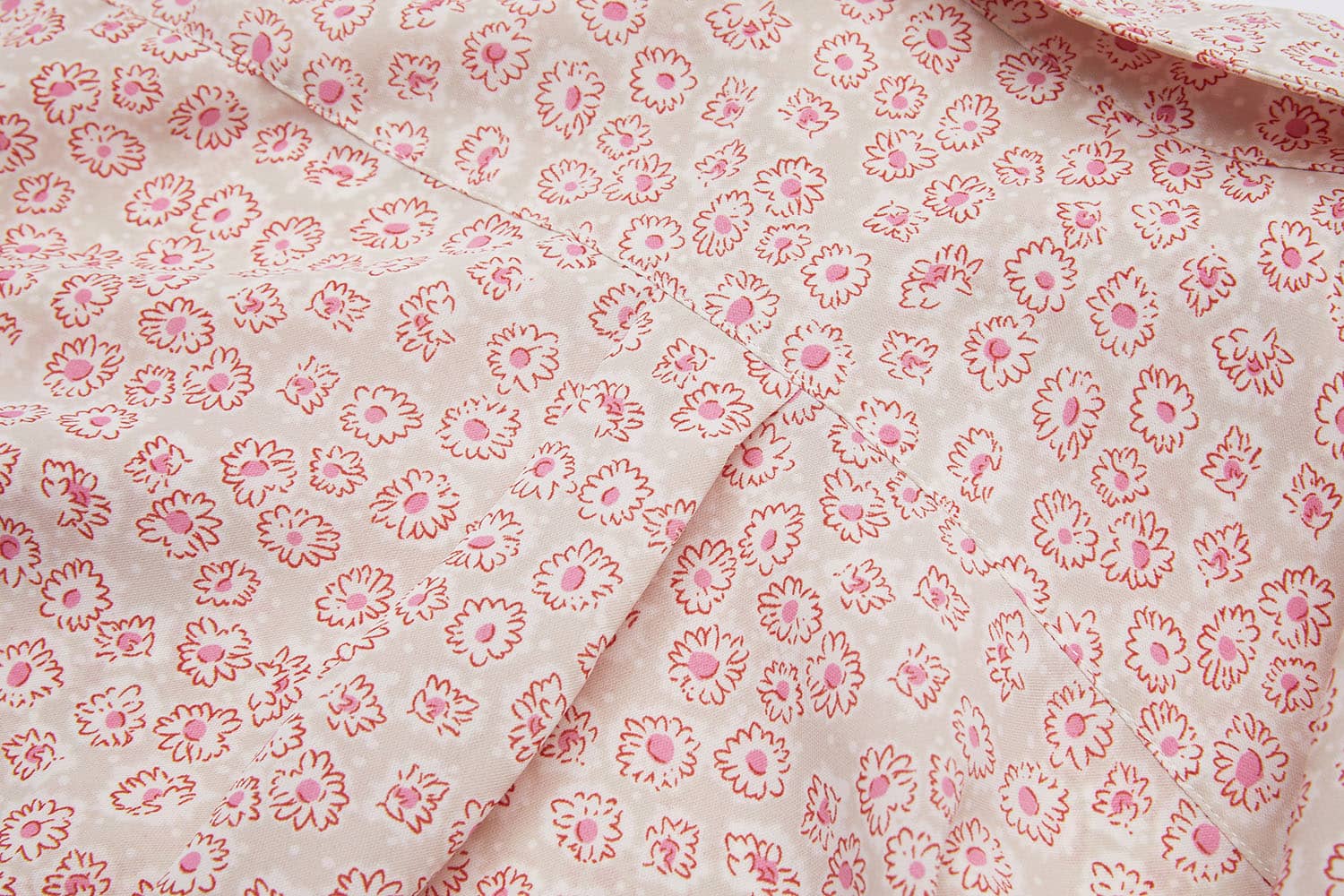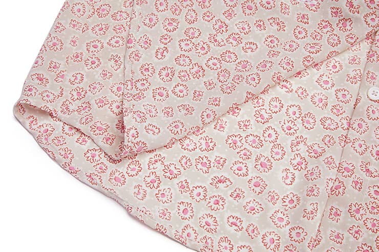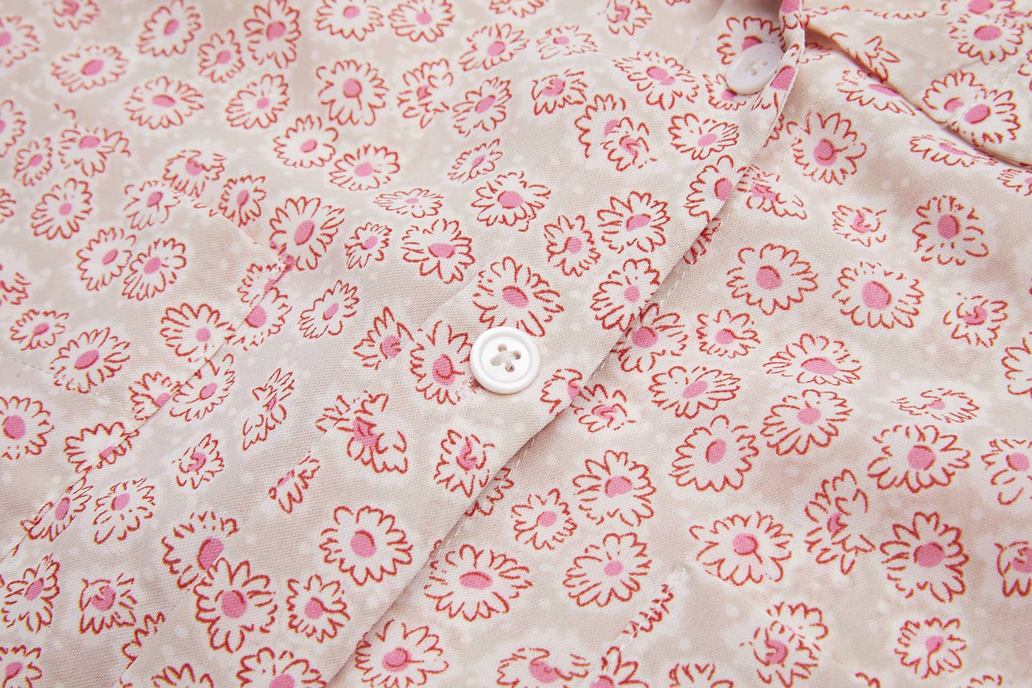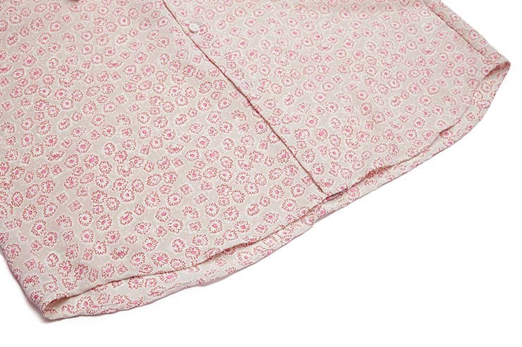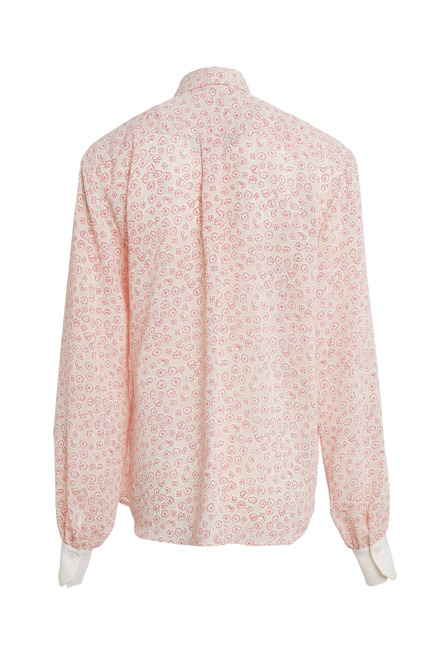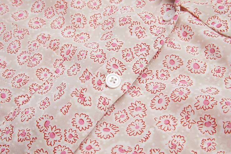 经典衬衫翻领,前中开扣门襟,胸部对称盾形贴袋,小落肩泡泡长袖撞色袖口,浅弧形下摆,印花面料,宽松上衣廓形,清新优雅;雪纺印花面料,爽滑舒适。
