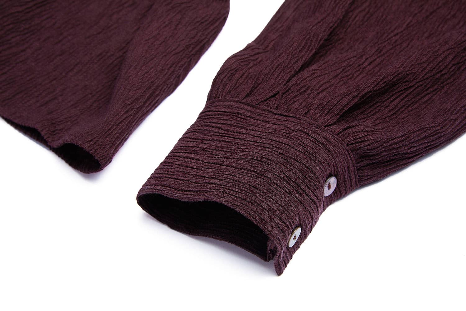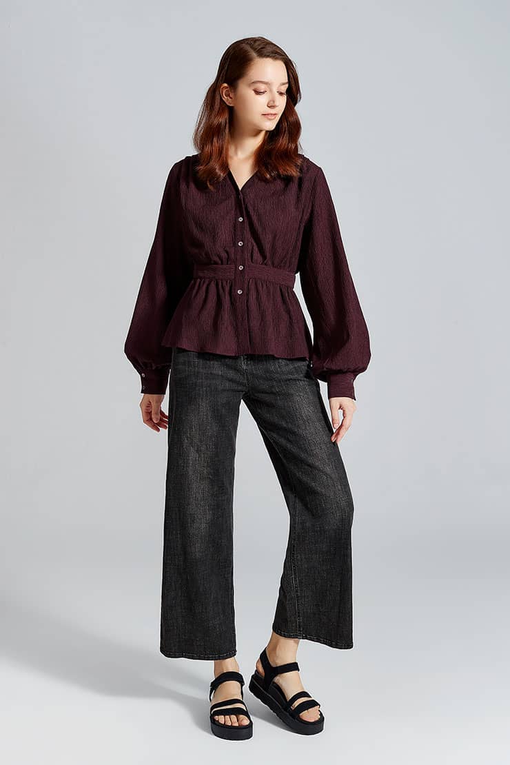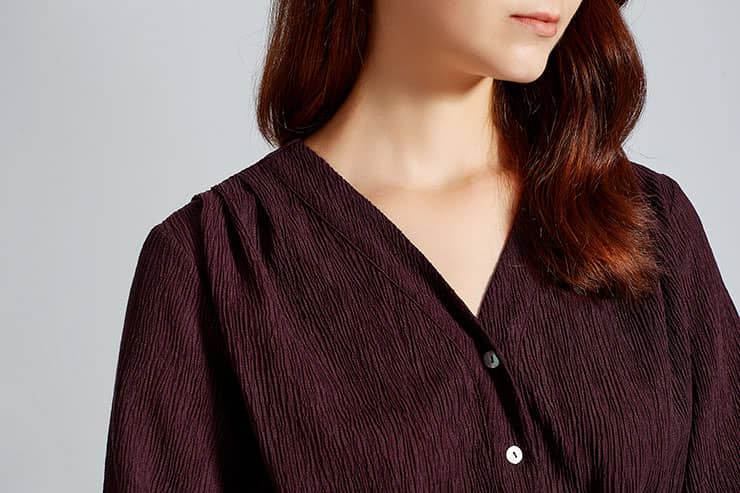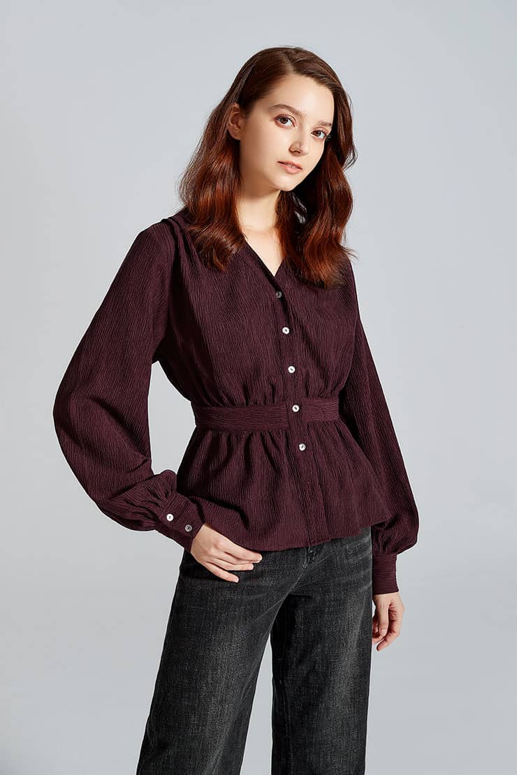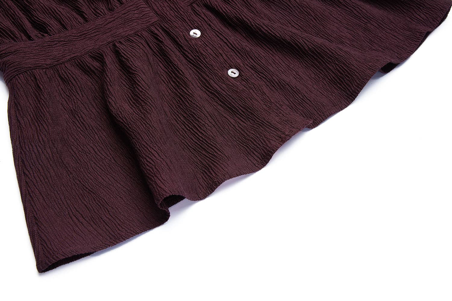 开扣门襟+法式小V领,灯笼长袖双扣袖头,腰部分割线碎褶收腰,肩部立体倒褶,平直下摆,合身收腰上衣廓形,细节自然又具设计感;压褶打揽天丝面料,自然光泽,令衣身有质感。