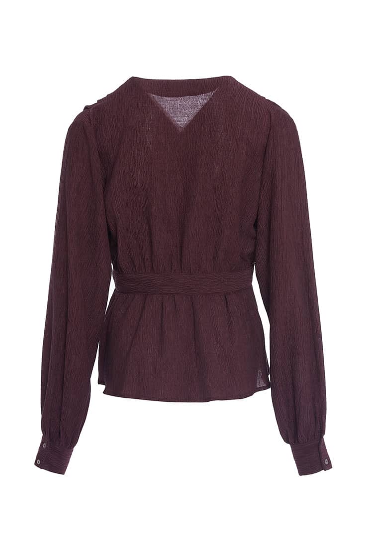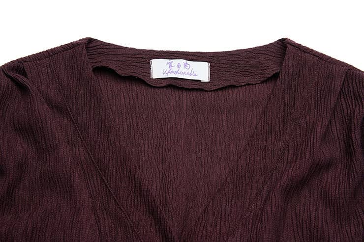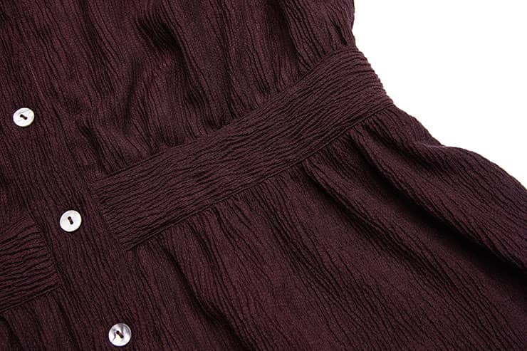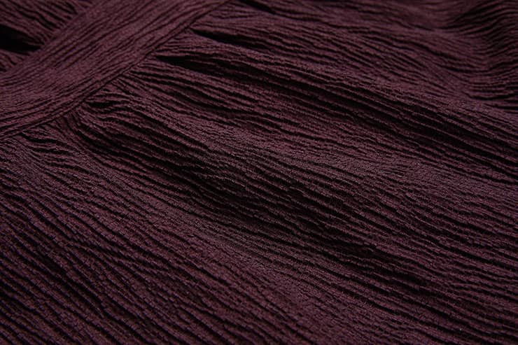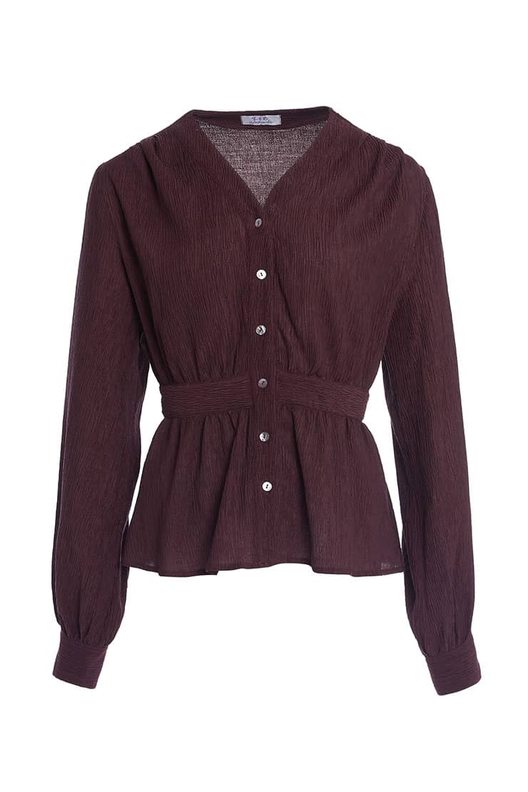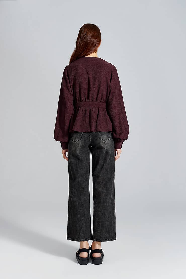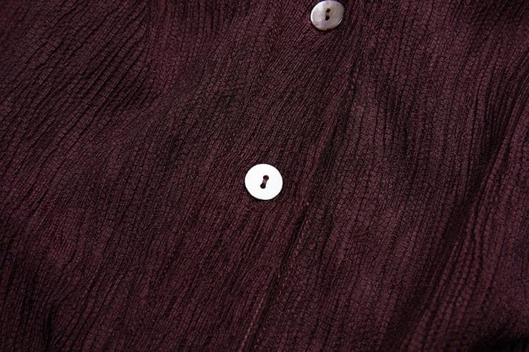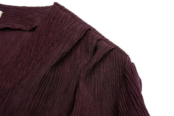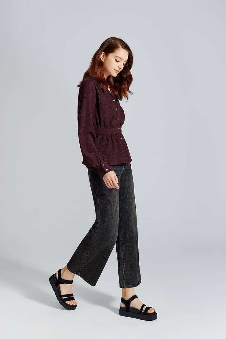 开扣门襟+法式小V领,灯笼长袖双扣袖头,腰部分割线碎褶收腰,肩部立体倒褶,平直下摆,合身收腰上衣廓形,细节自然又具设计感;压褶打揽天丝面料,自然光泽,令衣身有质感。