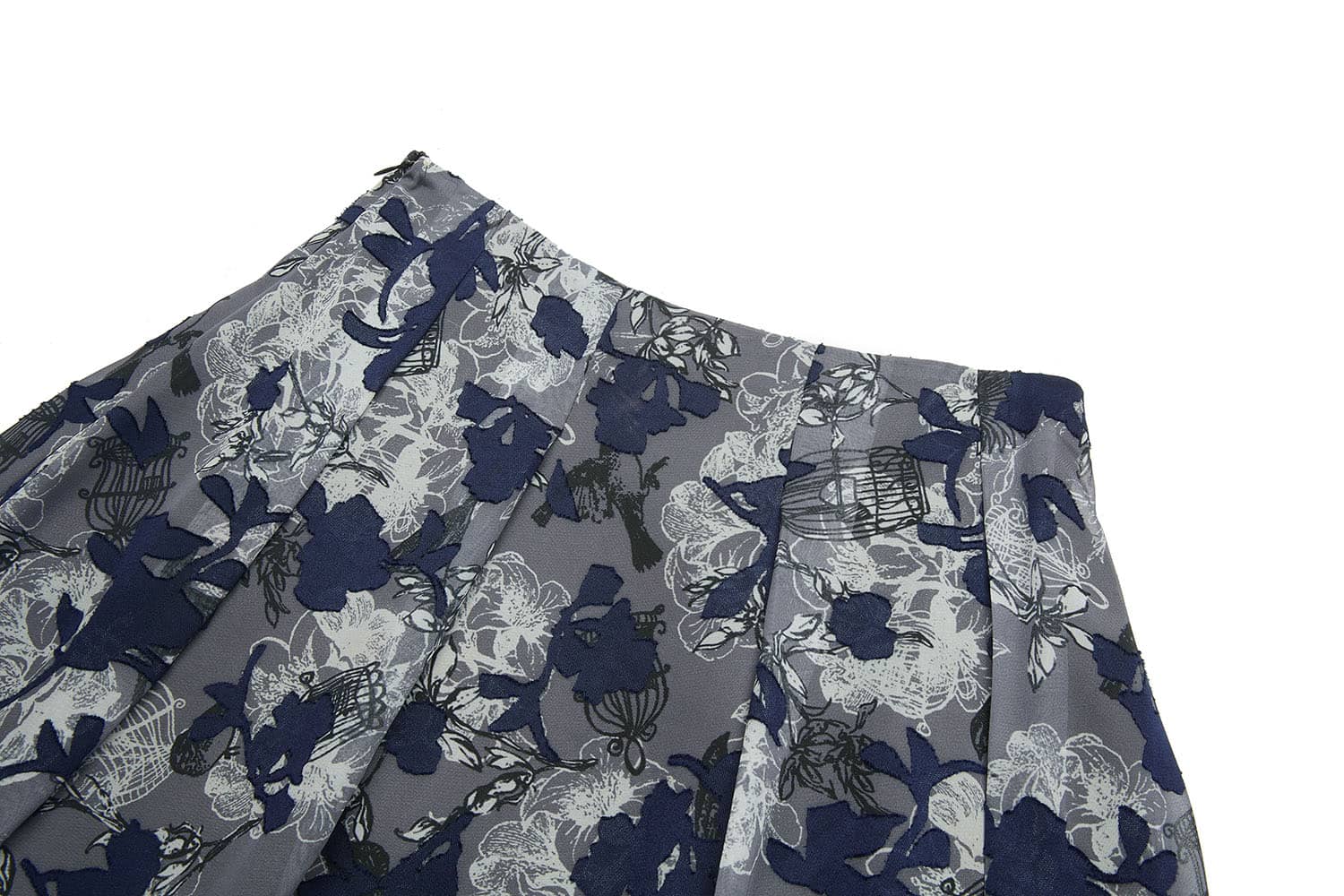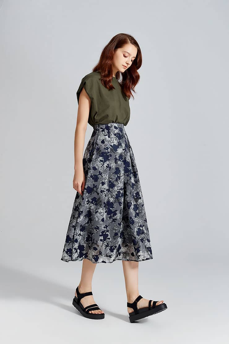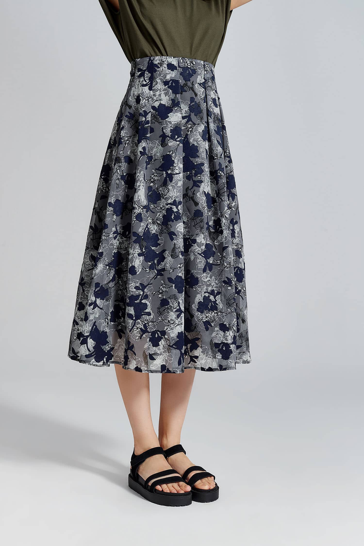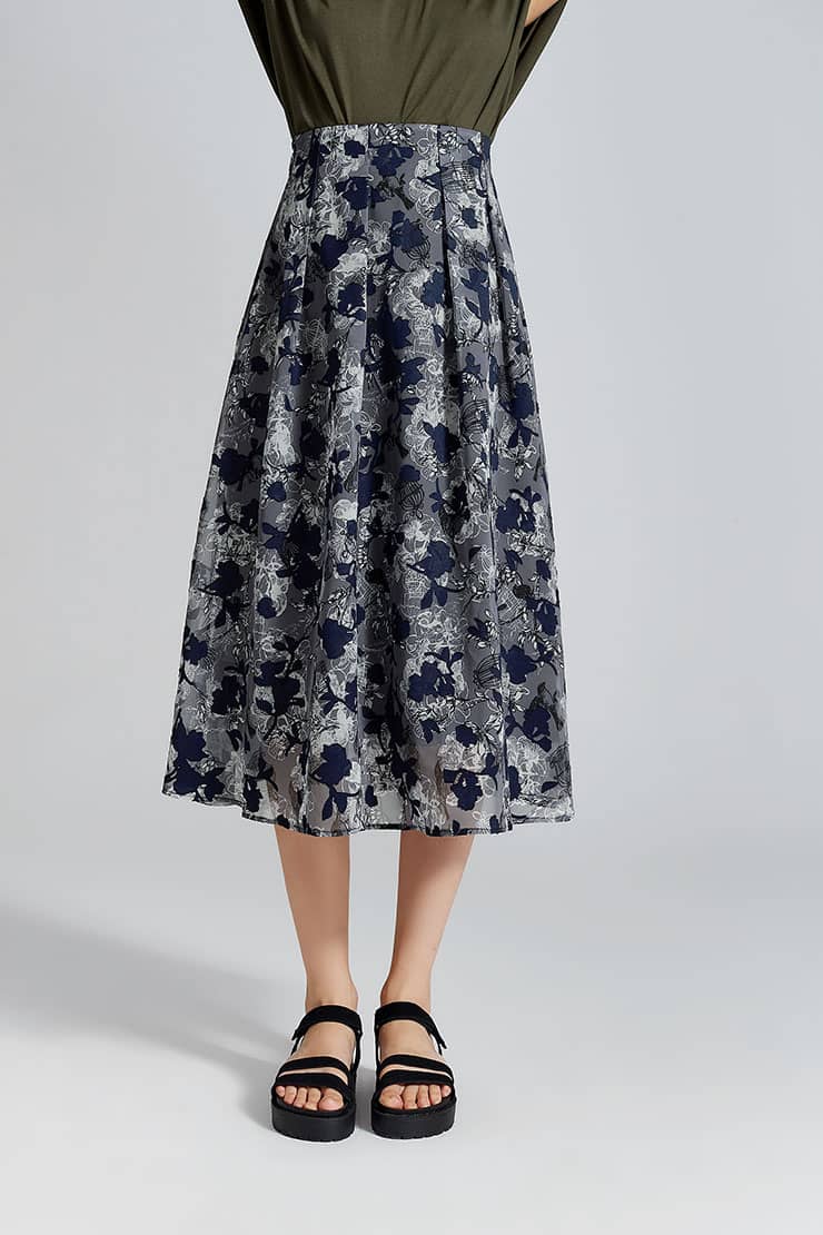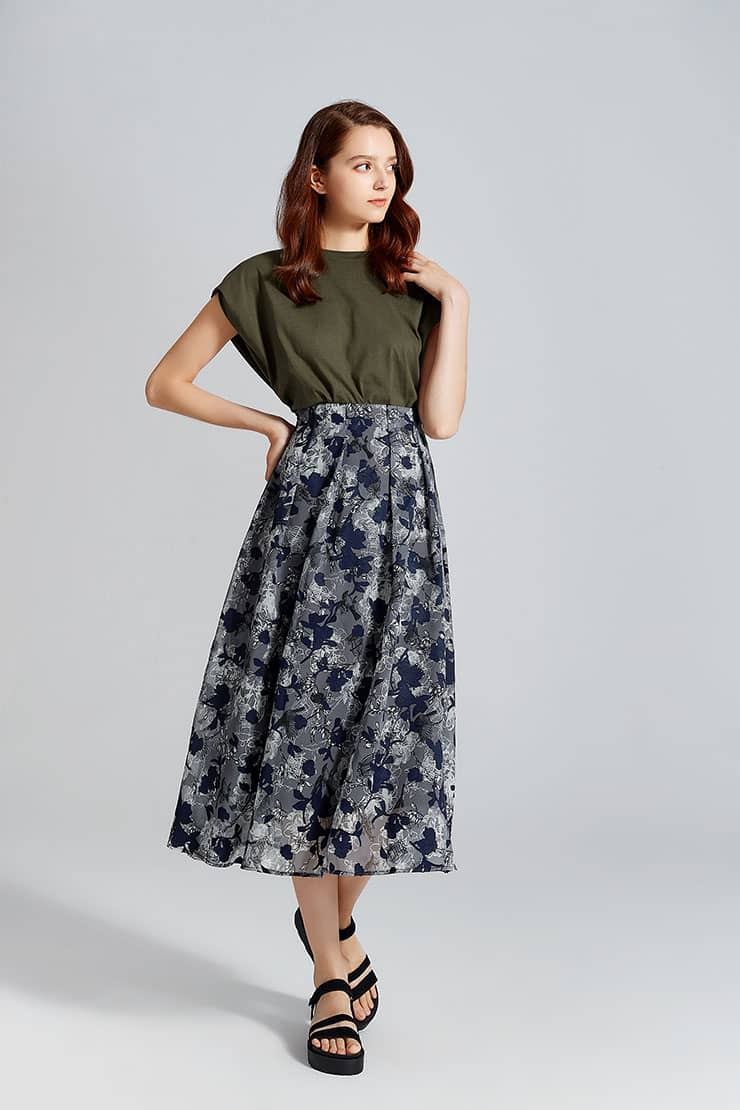 连腰高腰,右侧边拉链开襟,裙长过膝及腿肚,腰间多对褶裥,视觉层次立体,肌理感烧花欧根纱面料,更显灵动俏皮;一年四季可穿的半裙,上身立体有型。