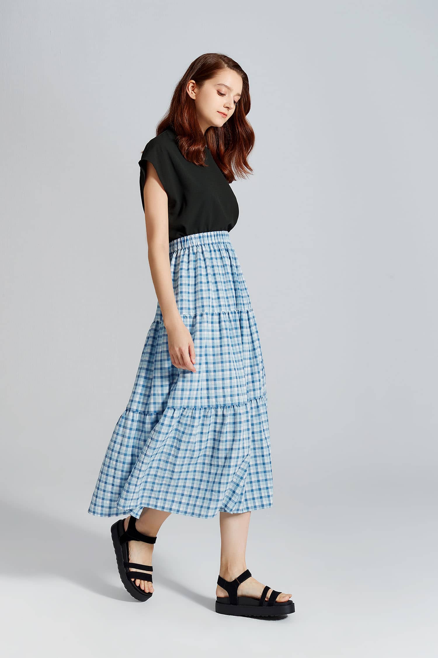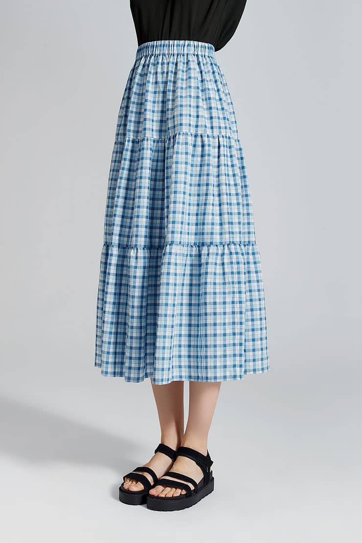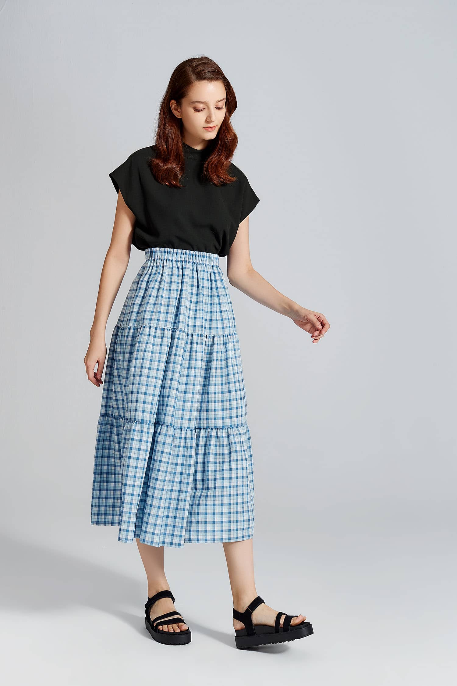 松紧直腰头,舒适易穿;蛋糕裙裙长过膝及腿肚,层次波浪裙摆,飘逸灵动;清晰格纹,面料柔软,穿着舒适百搭。