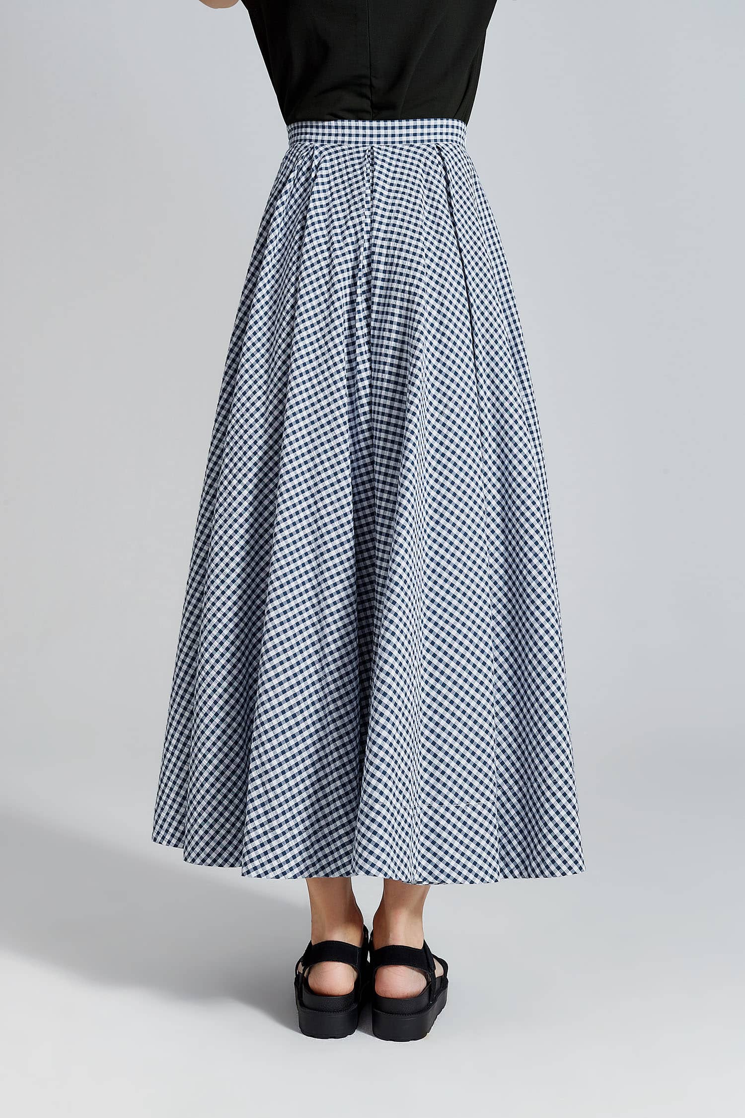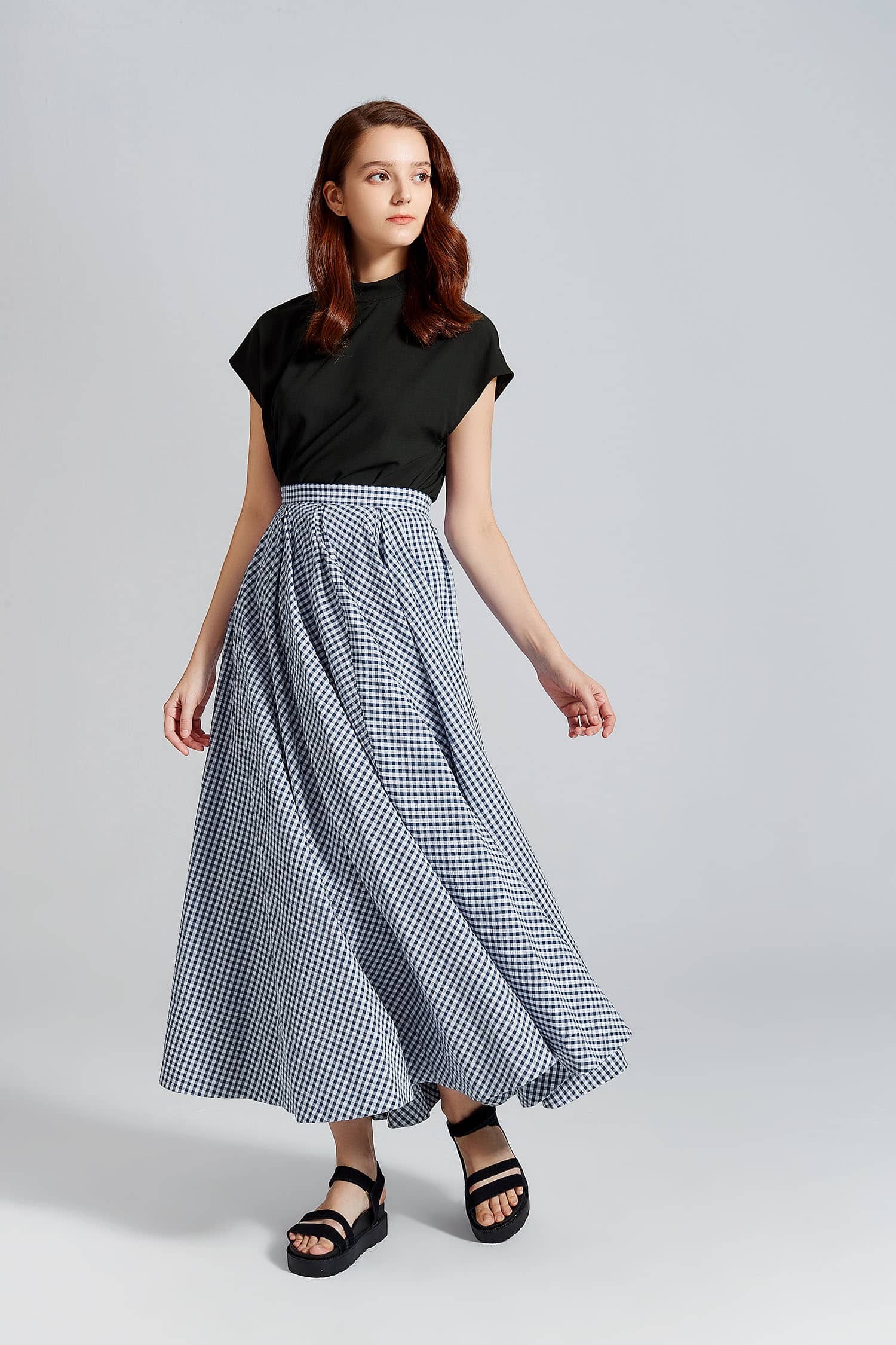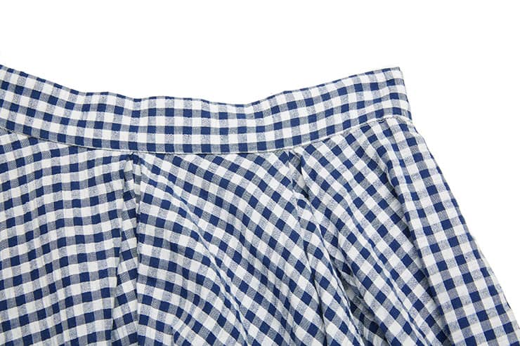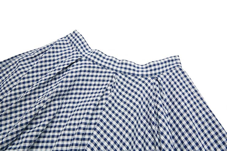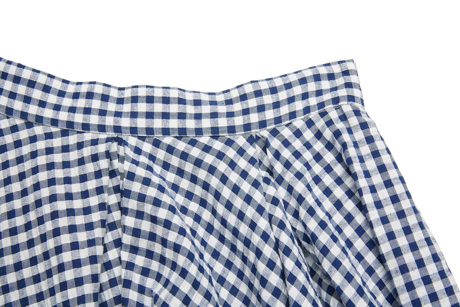 简约直腰头,侧边隐形拉链,裙长过腿肚;波浪斜裙加多个A形工字褶,裙摆波浪层次立体,线条丰富有型;全棉格纹面料,清纯个性,舒展自然。
