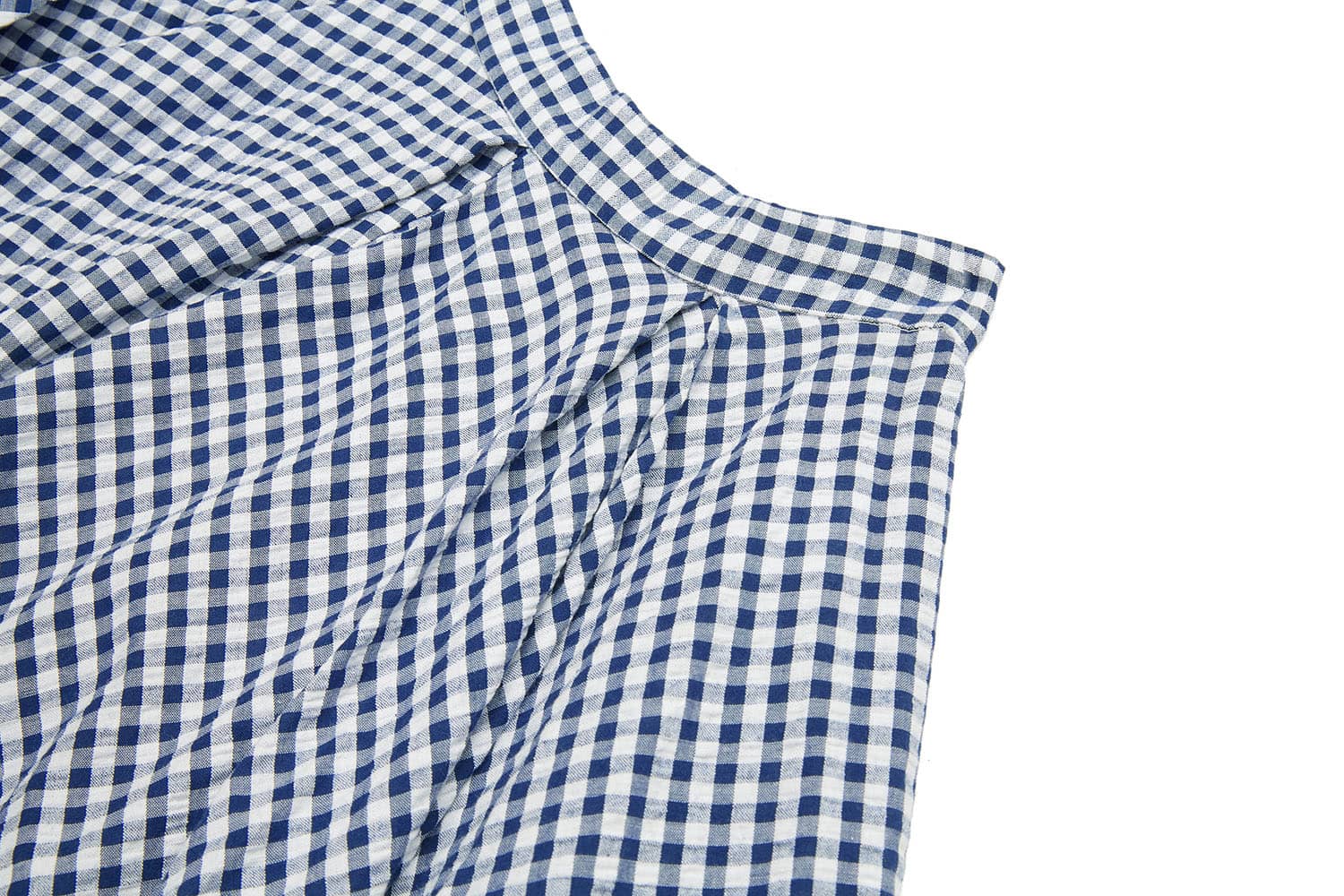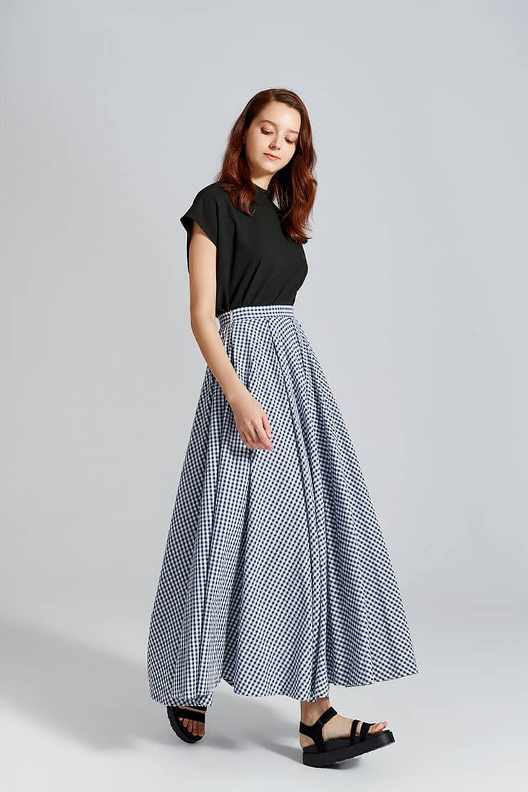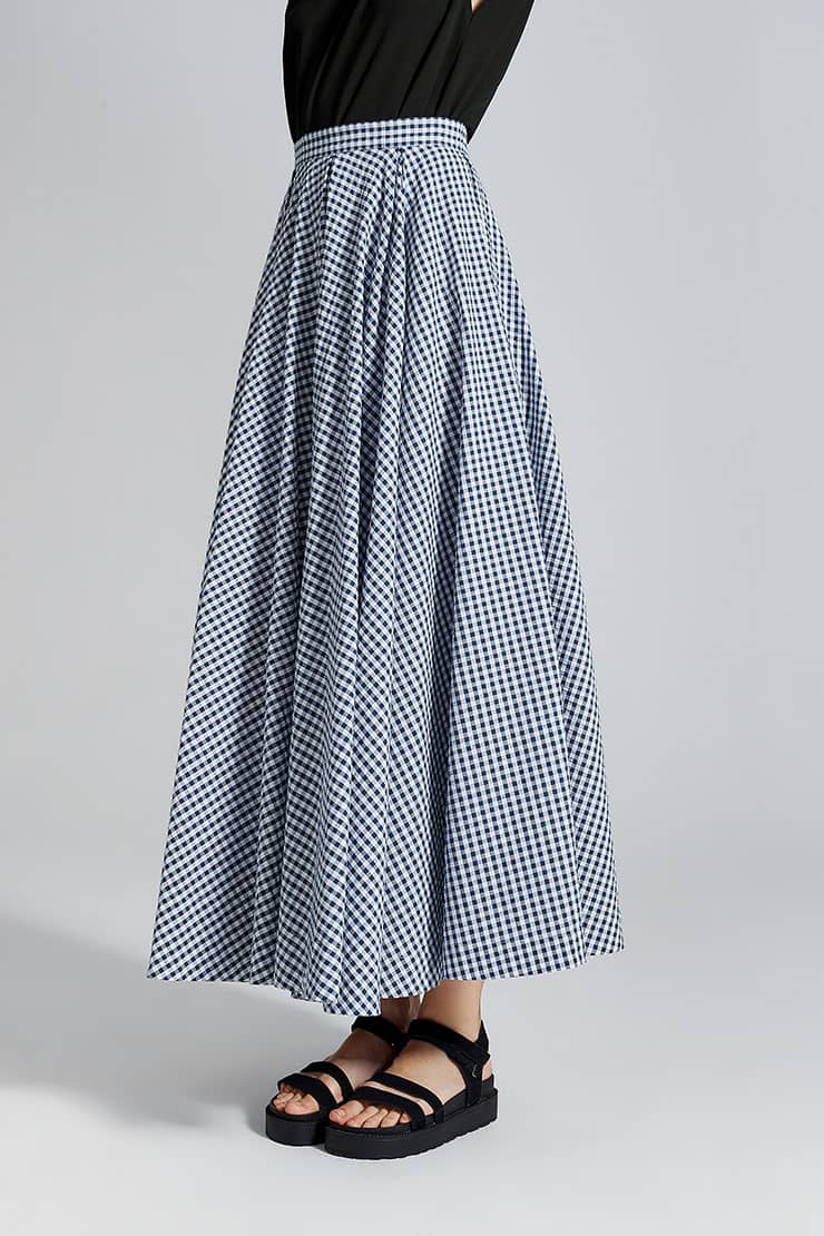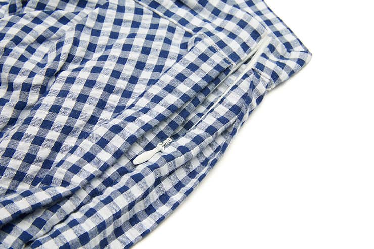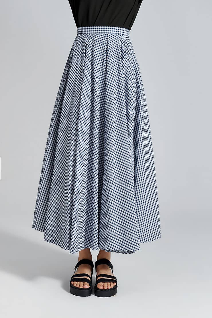 简约直腰头,侧边隐形拉链,裙长过腿肚;波浪斜裙加多个A形工字褶,裙摆波浪层次立体,线条丰富有型;全棉格纹面料,清纯个性,舒展自然。